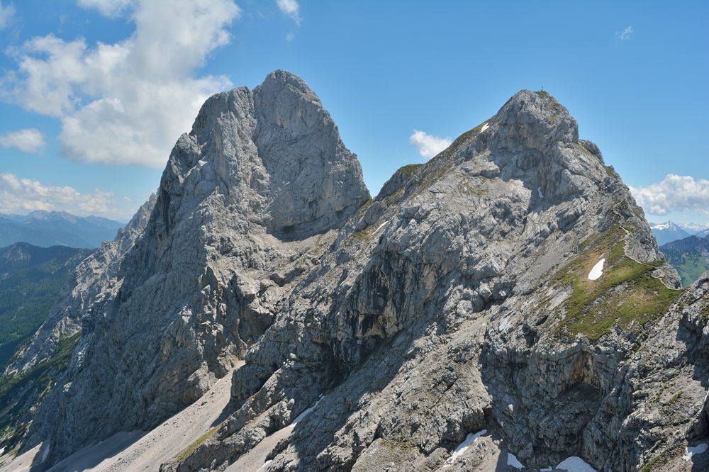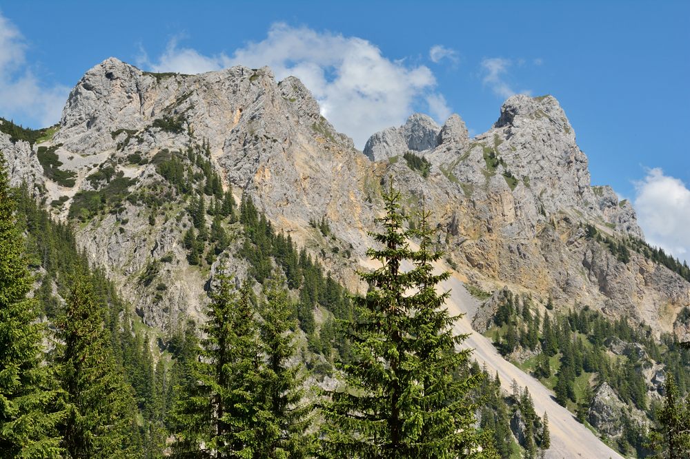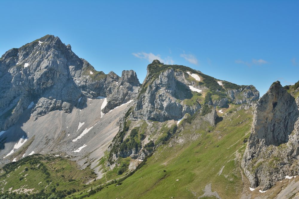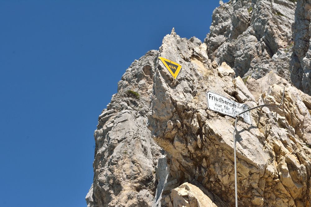 Wir fahren ins Tannheimer Tal. Die Gondel trägt uns zum Seniorentarif (ist noch gewöhnungsbedürftig) hoch ins Füssener Jöchle. Wir gehen unterhalb der Läuferspitze vorbei, steigen etwas ab und dann hinauf in die Scharte, wo der Klettersteig beginnt.