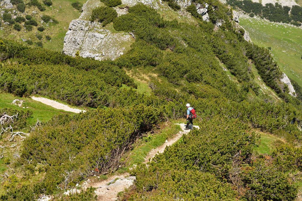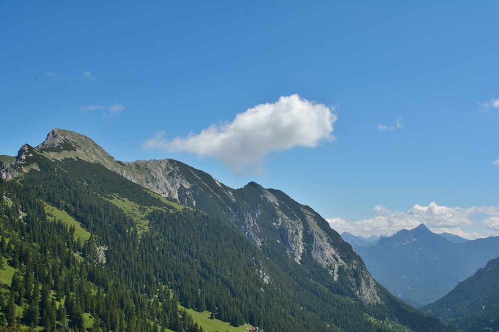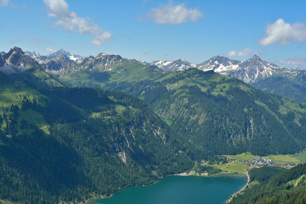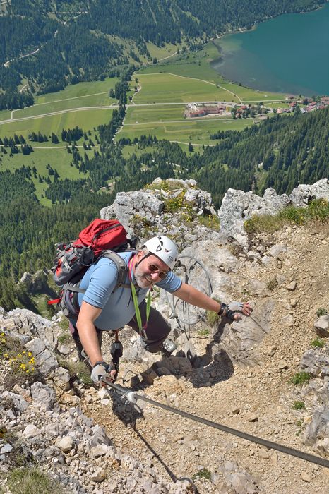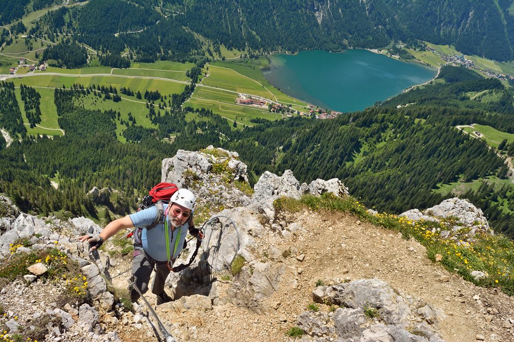 Tiefblick auf den Haldensee. Netter, nicht zu langer und nicht zu schwieriger Steig. Wir haben schönes Wetter, klare Sicht – und viel Panorama. Der Abstieg zur Talstation erfolgt zu Fuß. Mit Peter.