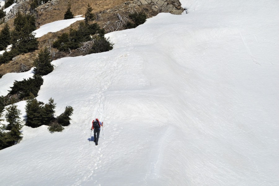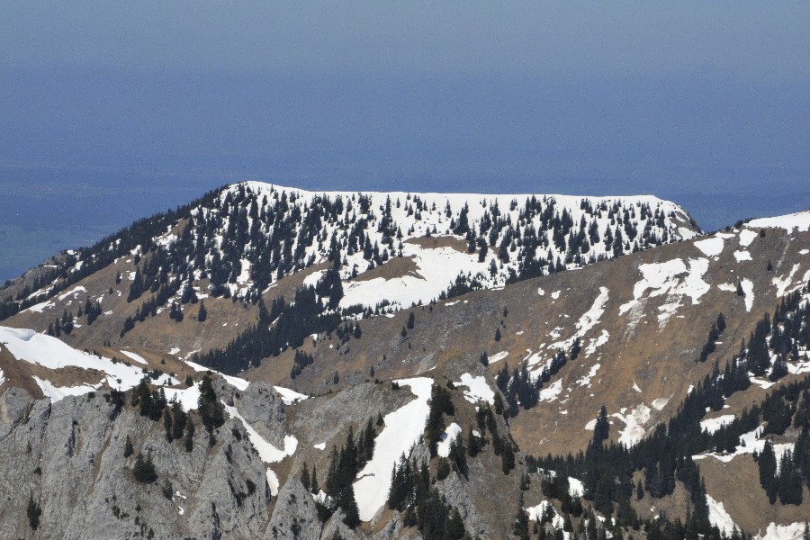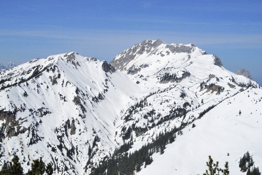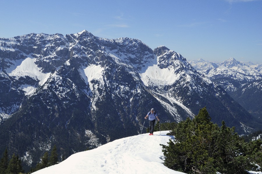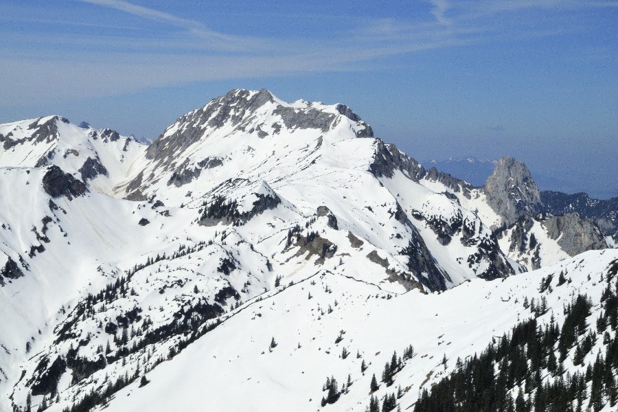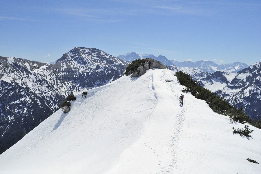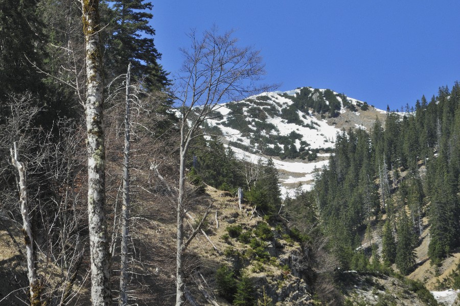 Die Wandersaison wird eröffnet; die Skistiefel kommen aber noch nicht in den Keller. Der Wanderparkplatz im Graswangtal mit dem Teich ist nicht zu verfehlen. Ebenso wie der Aufstieg. Nach der Hälfte nimmt die Schneedecke zu und ist bald ganz geschlossen. Jetzt kommen die Schneeschuhe zum Einsatz. Dank an Peter für die Leihgabe. Bei strahlender Sonnen folgen wir dem Südgrat. Der Gipfel selbst ist schneefrei. Wegen der isolierten Lage gibt es eine nette Rundumsicht. Abgestiegen wird ohne Schneeschuhe, was bedeutet, dass so mancher unterm Schnee verborgener Hohlraum von einem Bergschuh Besuch erhält. Mit Peter + Schorsch.