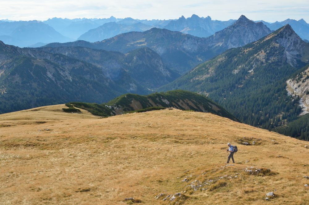 Wir steigen nach Westen ab, weglos über die weiten Wiesen – schön, tolle Sicht – bis zu den Latschen. Hier beginnt ein Steig, dem es aufmerksam zu folgen gilt. Er trifft oberhalb des Ochsenängerle auf den Anstiegsweg.