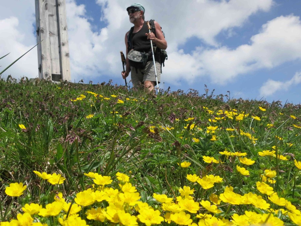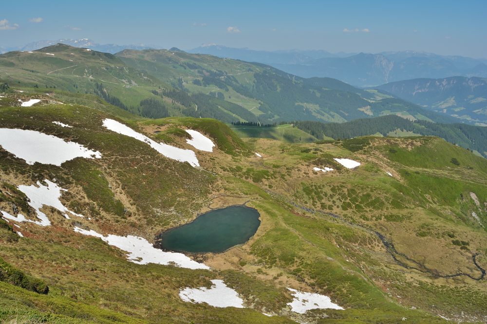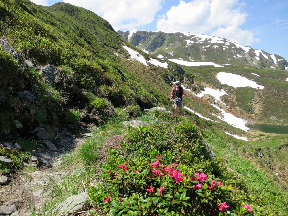 Einige Meter zurück auf der Teerstraße, dann geht es links hinauf Richtung Hönigkaser-Alm umd weiter zur Baumgart-Alm. Wir gehen an zwei kleinen Seen vorbei und auf dem NO-Grat zum Gipfel des Lämpersbergs. Die Alpenrosen haben bereits angefangen zu blühen. Jürgen zeigt mir eine fleischfressende Blume. Die weite Flanken der Kitzbüheler mit ihren Alpenrosen und Heidelbeeren gefallen mir immer wieder, viel Raum wird vermittelt.