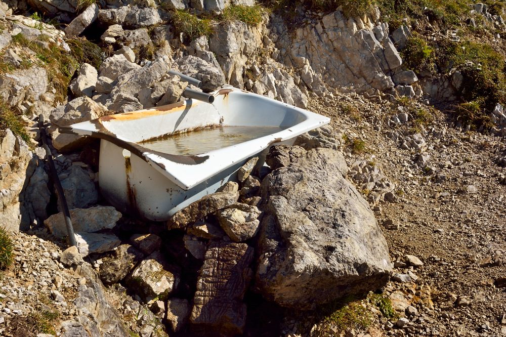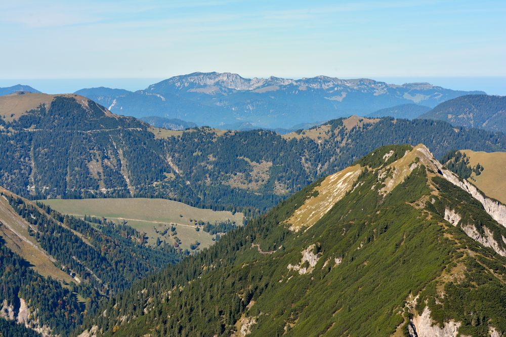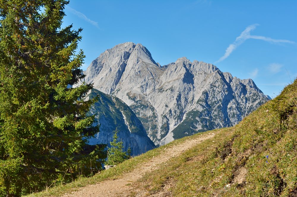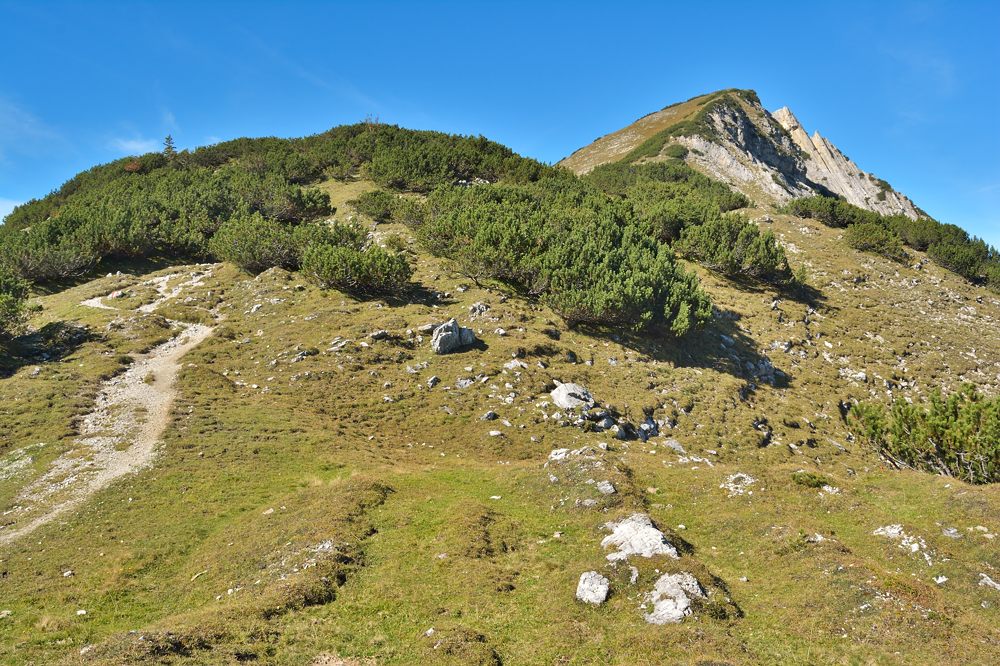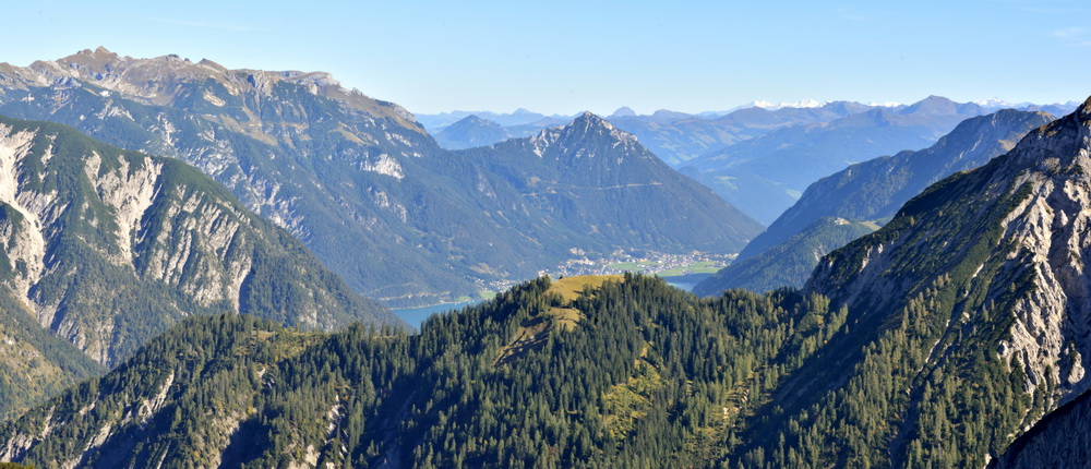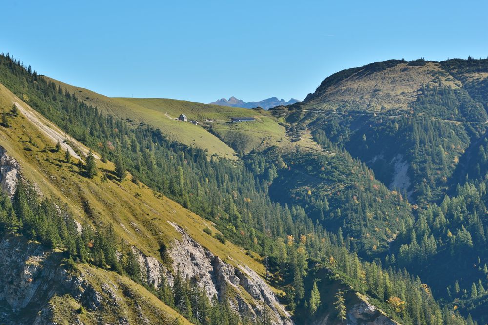 Ich steige direkt auf einem Steig nach Südwesten ab, die Bettlerkarspitze fest im Blick. Ohne Wegweiser, aber markiert gehe ich über das Satteljoch – hier gibt es etwas Achensee zu sehen – und hinunter zur urigen Plumsjochalm.