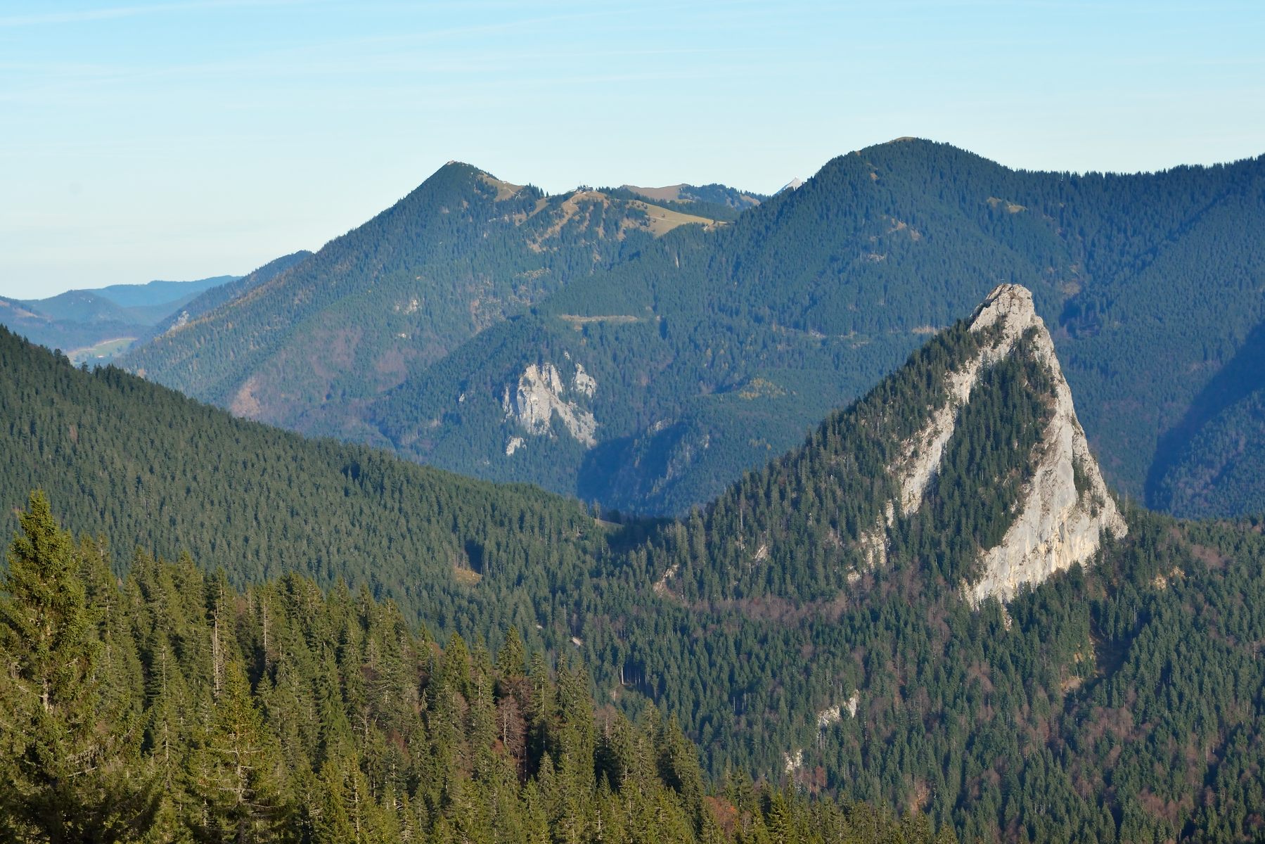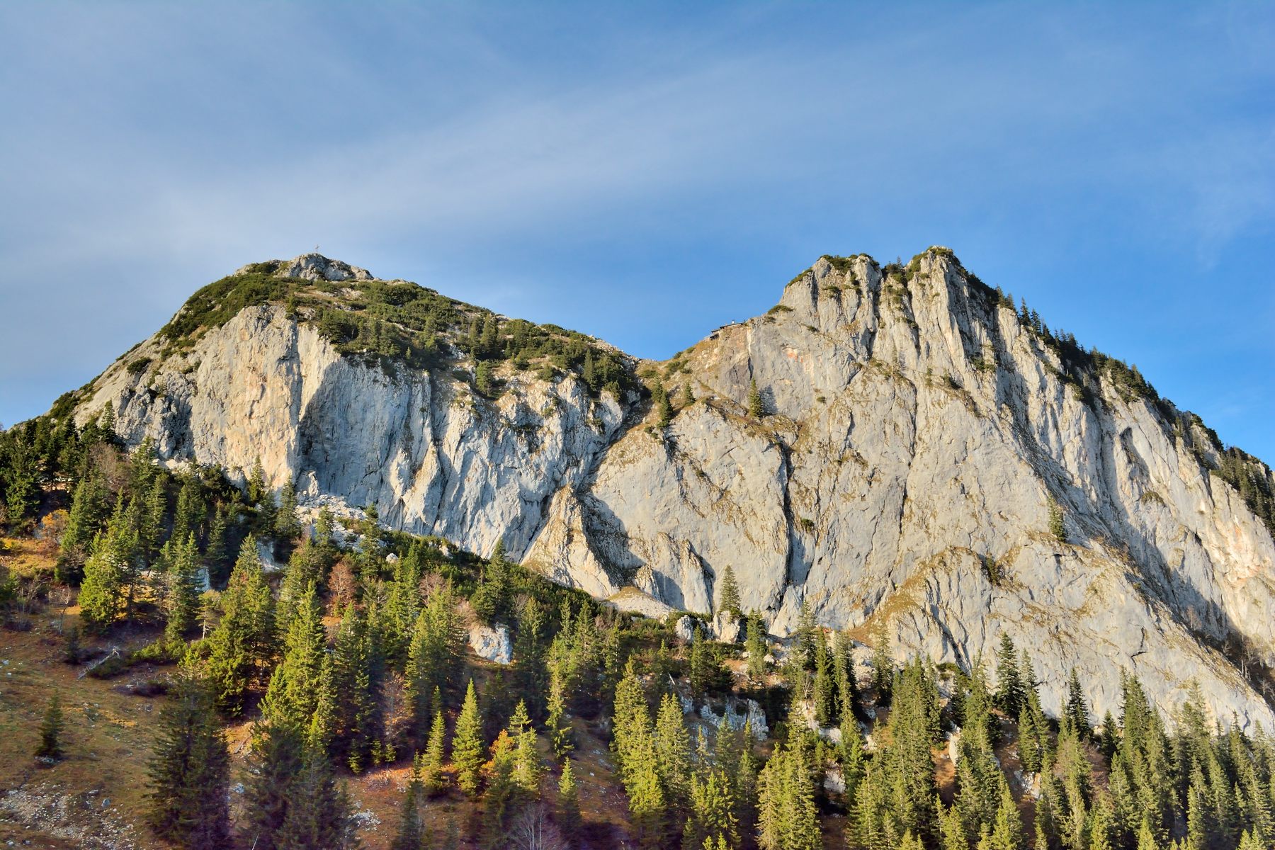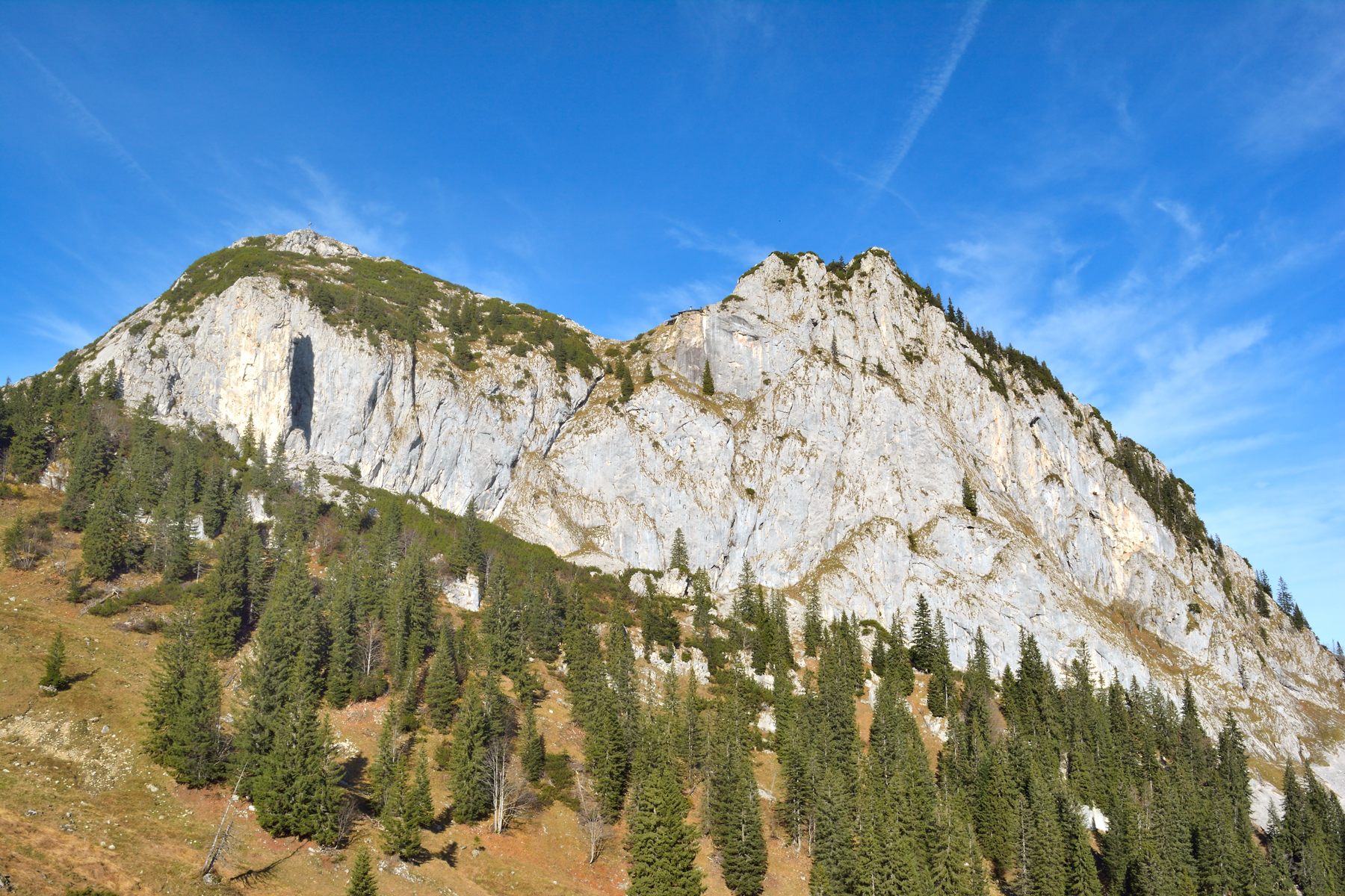 Die breiten Felswände von Roß-+Buchstein bauen sich beeindruckend auf, die Nadel wirft einen markanten Schatten.