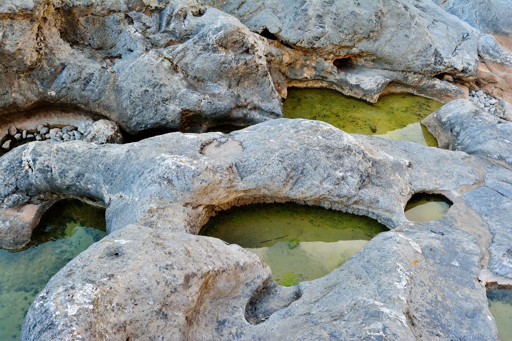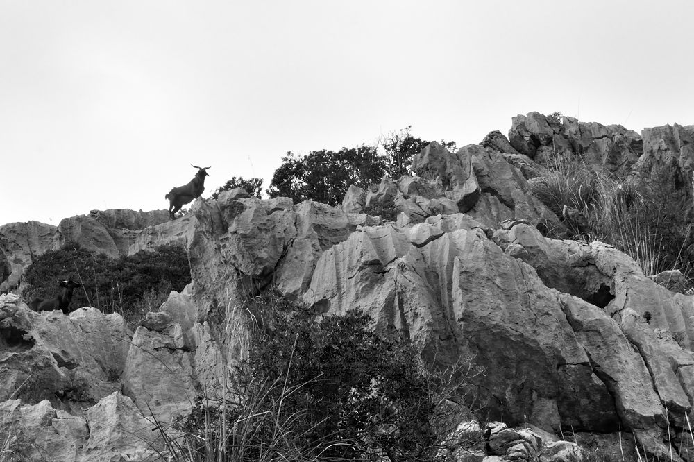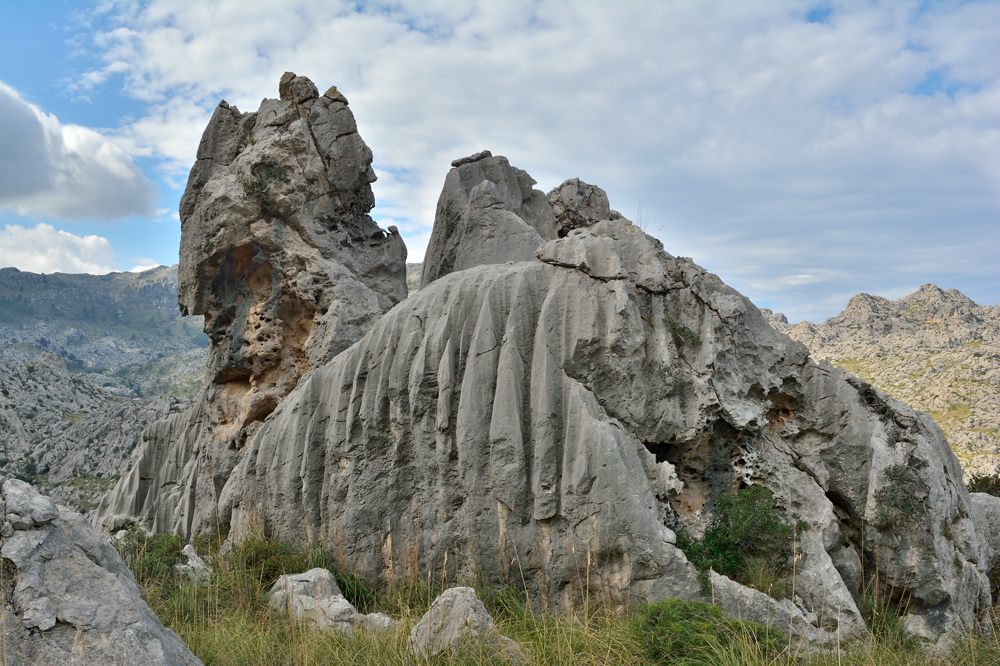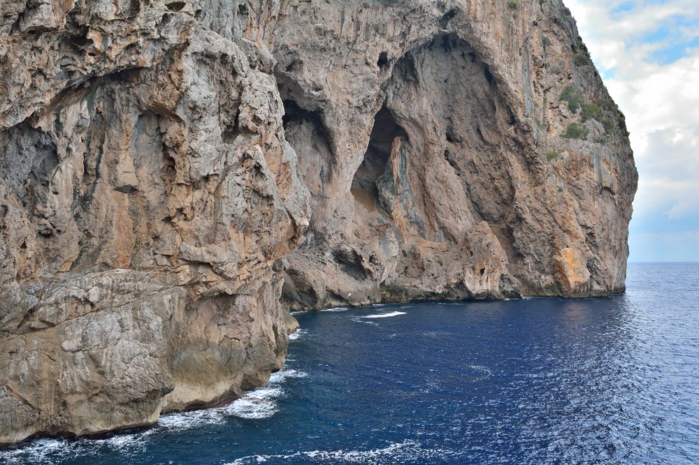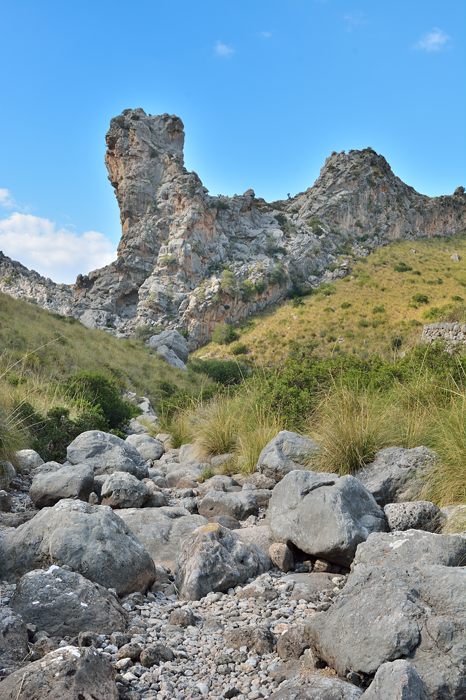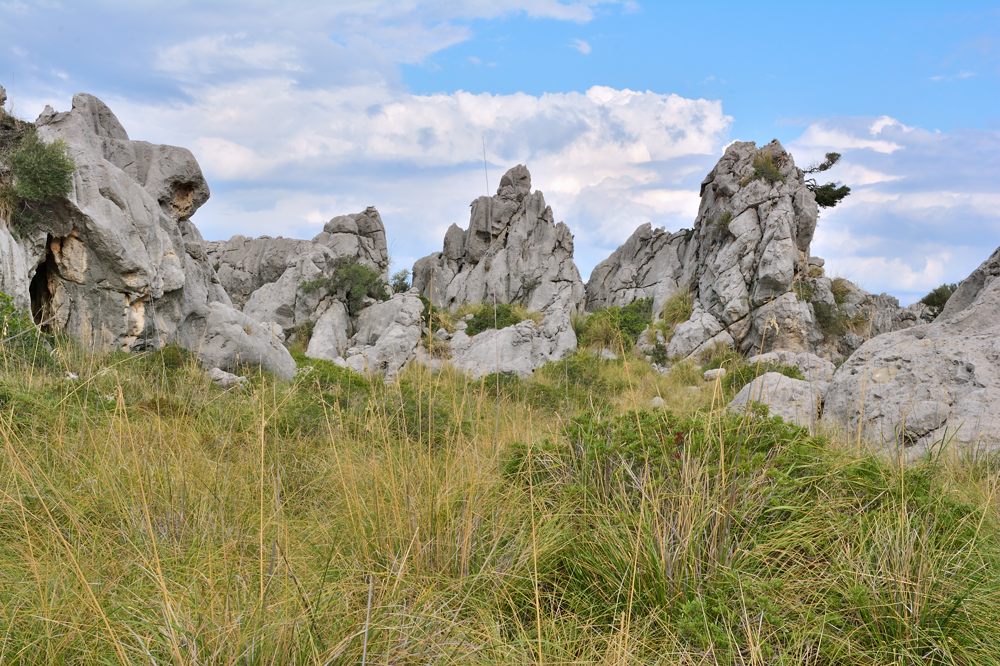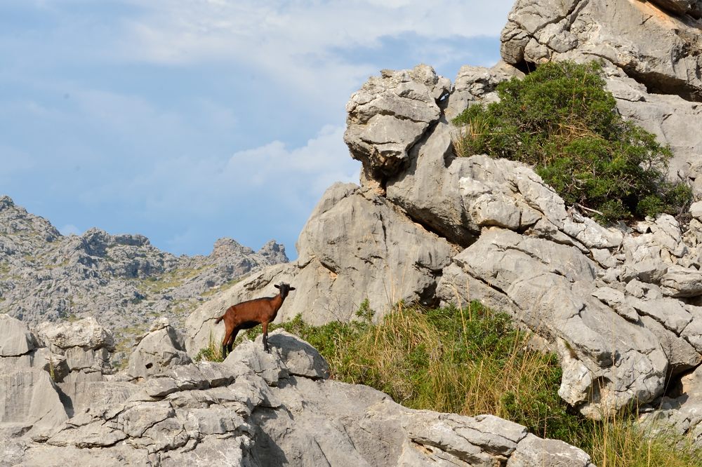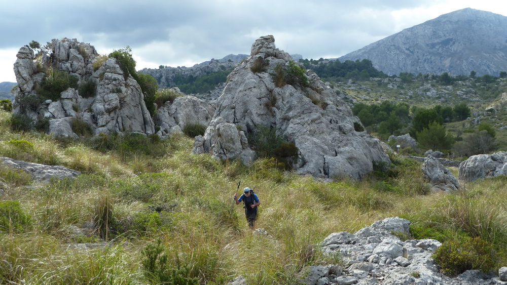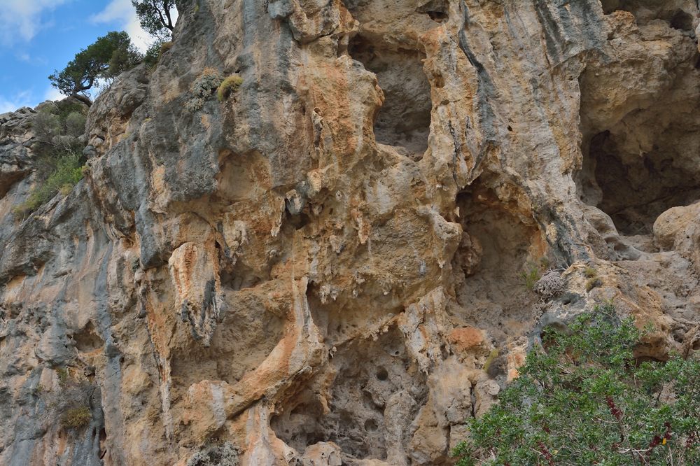 Quartierwechsel ins Kloster Lluc steht an. Aber auf dem Umweg über die Mortitx Schlucht. Wir beginnen unseren Abstieg bei der Finca Mortitx. Durch hohe grüne Schneidegras-Büschel und vorbei an bizarren grauen Fels-Formationen kommen wir zu einem verfallenen Bauernhof. Und nun geht es hinunter ans Meer, eine kleine Bucht, ein Felsvorsprung ermöglicht den Blick auf die Hexenhöhlen, Auswaschungen in der Felswand. Ein Platz zum längeren Verweilen. Aber die Pflicht ruft, und wir steigen wieder hoch zum Bauernhof und biegen dort rechts ab und steigen in der Schlucht über Felsblöcke hoch. Trockenes Canyoning.