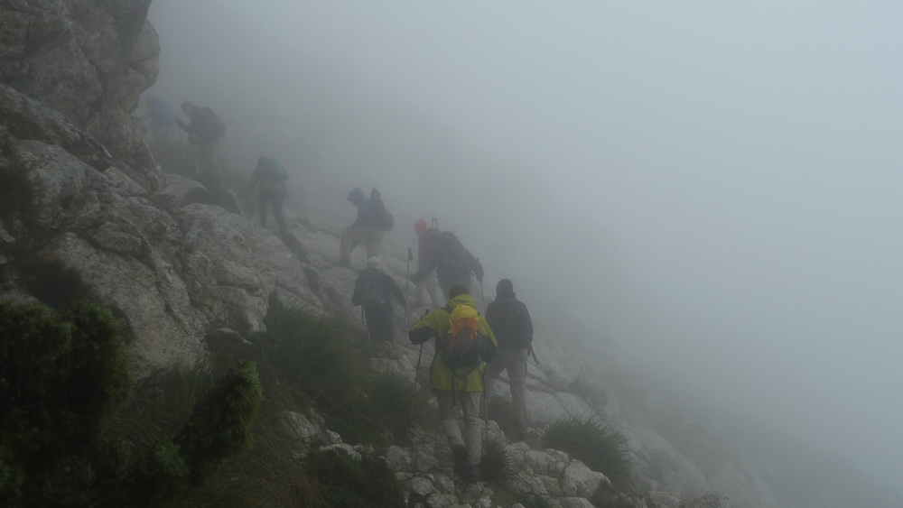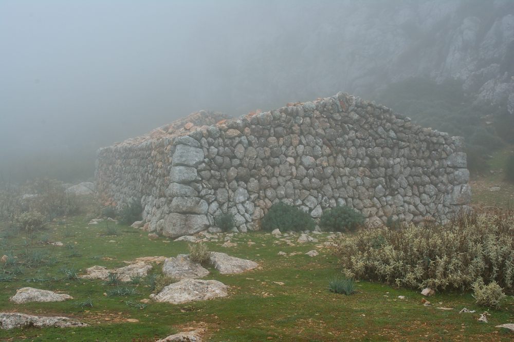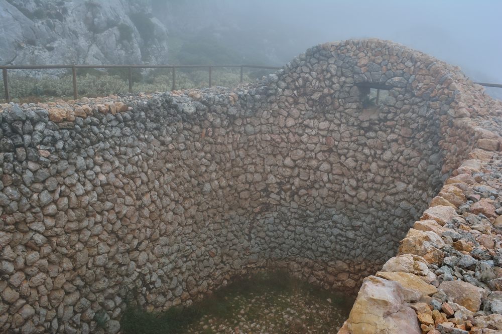 Der zweithöchste Berg Puig de Massanella 1365m ist ohne Zweifel ein lohnendes Ziel, der Aussicht und der Landschaft wegen. Startpunkt ist das Kloster, die Welt ist in Nebel gehüllt. Aber das kann sich ja ändern. Wir erreichen ein restauriertes Schneehaus, ein „Behälter“ für Schnee und Eis, das dann im Frühjahr ins Tal gebracht wurde, und steigen durch Felsgelände zum Gipfel. Die Sicht ist immer noch auf 100m beschränkt. Das ist schade. Auch der Abstieg bleibt nebelig. Und wir passieren, es ist kaum zu glauben, eine Mautstelle, bei der Grundstücksbetretungsgebühren erhoben werden (siehe oben).