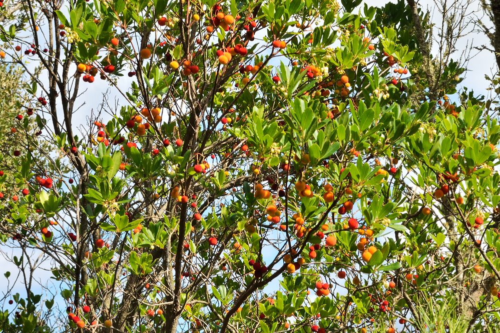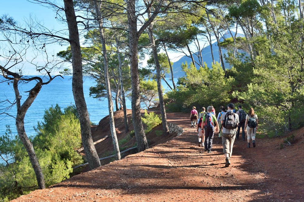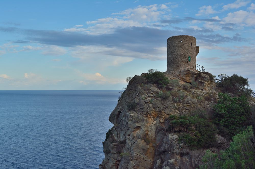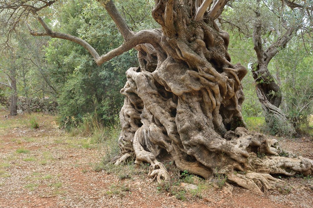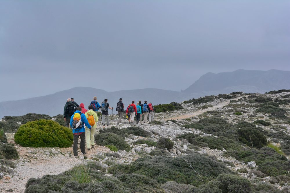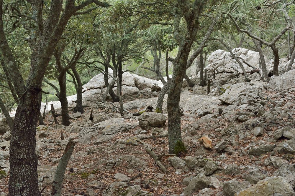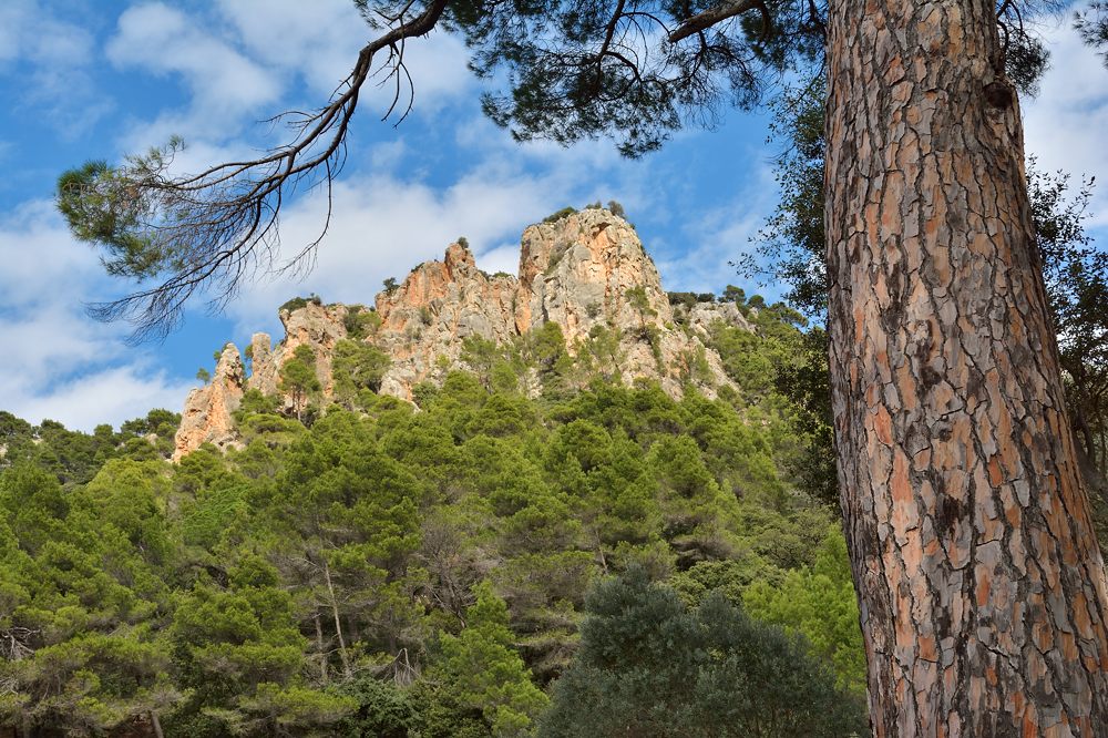 Wir fahren zu einem Wachturm an der Küste und erfahren eine Menge über böse Piraten und das Geschick der Bevölkerung, sich zu schützen. Dann weiter in die Nähe von Banyalbufar. Wir gehen hinunter an die Küste in Port de Canonge; einige Höhenmeter wieder hinauf und in einem großen weiten Bogen nach Estellencs zurück – durch die stets grünen Steineichenwälder, vorbei an Johannisbrotbäumen und Erdbeerbäumen, durch aufgelassenes terrassiertes Gelände mit Olivenbäumen und ihren verdreht-verqueren Stämmen. Aina erklärt die Technik des Kalkbrennens und die Herstellung von Holzkohle, immer wieder finden sich Köhlerplätze.
