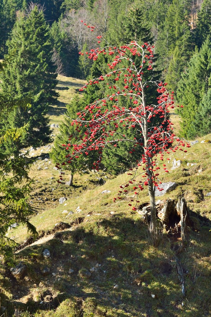 Der Abstieg ist manchmal weglos, manchmal mit roten Punkten markiert, immer die Richtung auf die Brücke beibehalten, dann kann nichts schiefgehen. An der Jackelberger Alm vorbei und rechts eines Grabens steige ich bis zu einer Straße ab, die direkt zur Brücke führt.
