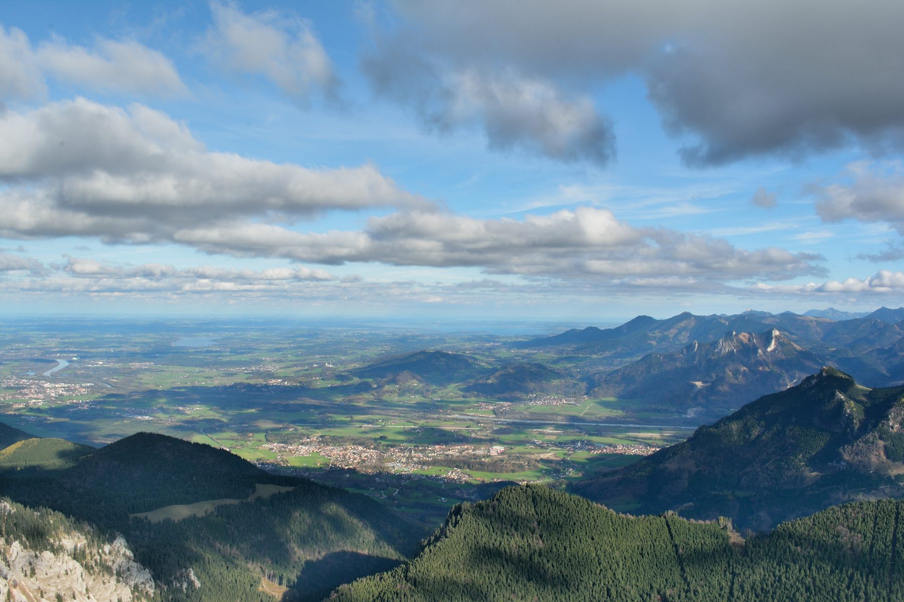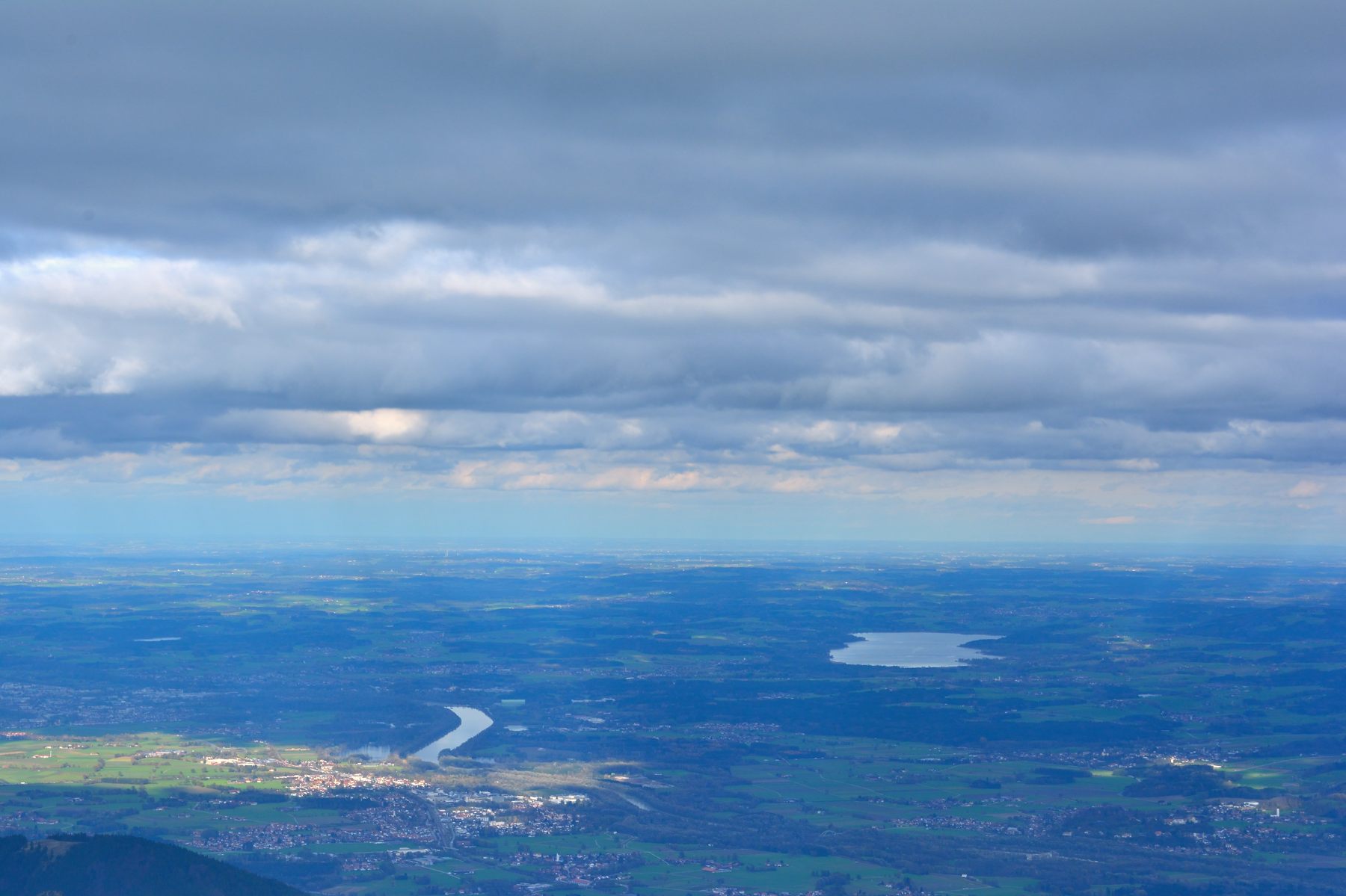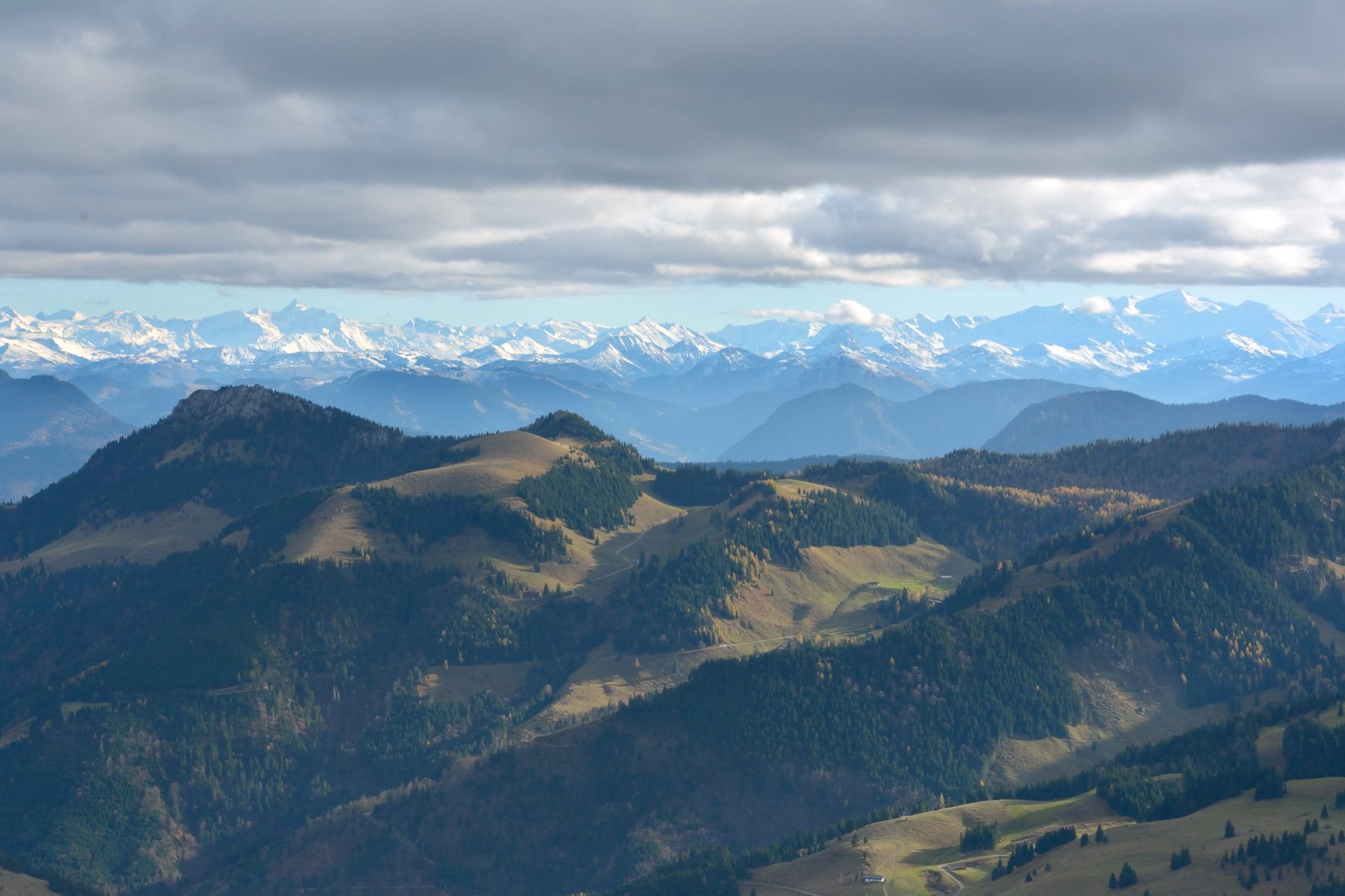 Der Olympiaturm in München ist zu erkennen, mit Fernglas. Im Inntal hängt noch etwas Nebel. Der Hauptkamm trägt bereits das Winterkleid, Großglockner und Großvenediger geben sich die Ehre.