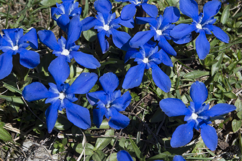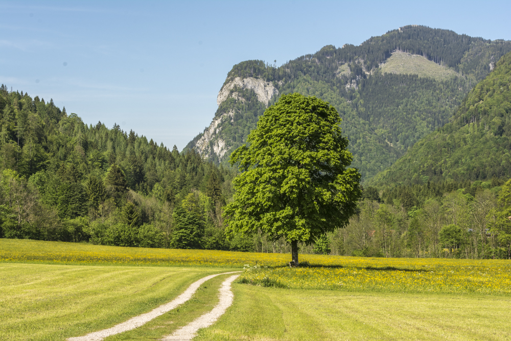 Den Zinnenberg habe ich als Blumenwiese in Erinnerung. Möglicherweise ist es jetzt noch zu früh, aber schauen wir mal… Ich fahre über Aschau nach Grattenbach. Hier gibt es eine Bachbrücke, und rechts davon, hinter der Leitplanke, führt ein Steig nach oben. Der Steig mündet in einen breiteren Weg, ich gehe nach links, immer weiter, der Weg wird zum Steig, immer weiter nach oben, bis mein Steig in einen quer verlaufenden Steig mündet. Hier nach rechts und bei dem Übertritt über den Stacheldrahtzaun. Weglos über den Wiesenrücken nach oben, links ist der Zaun, und dann bin oberhalb der Schlossrinnalm. Die Alm liegt in einem Wiesen-Kessel, an dessen oberem rechtem Rand einige Bäume stehen. Das ist das nächste Ziel. Oben angekommen, gehe ich an einem Zaun entlang bis zu einem Übertritt. Dahinter fängt ein schwach ausgeprägter Steig an, der sich öfters verliert. Das Beste ist wohl, stets auf dem Kamm zu bleiben.