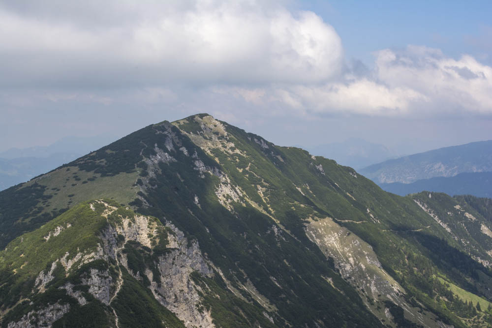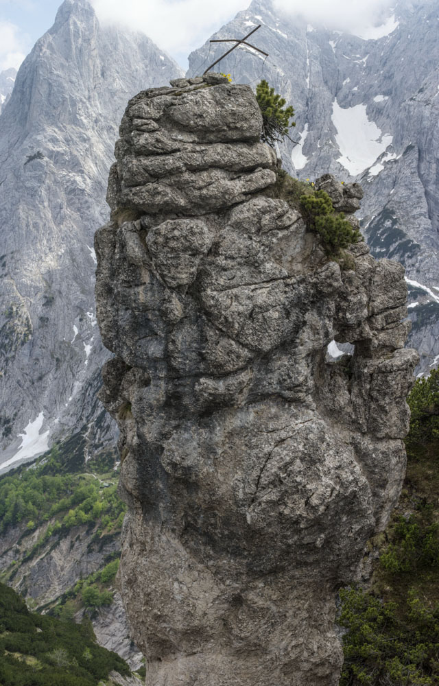 Auf dem Grat weiter, natürlich besuchen wir den Pavillon auf dem Stripsenkopf, und hinunter zum Stripsenjochhaus. In der Sonne sitzend, schauen wir die grauen Felswände hoch, bis der Hals steif wird. Mit Jürgen, Elisabeth, Gudrun, Petra.