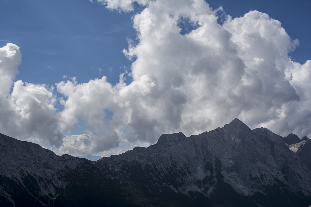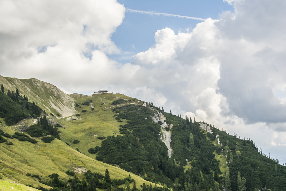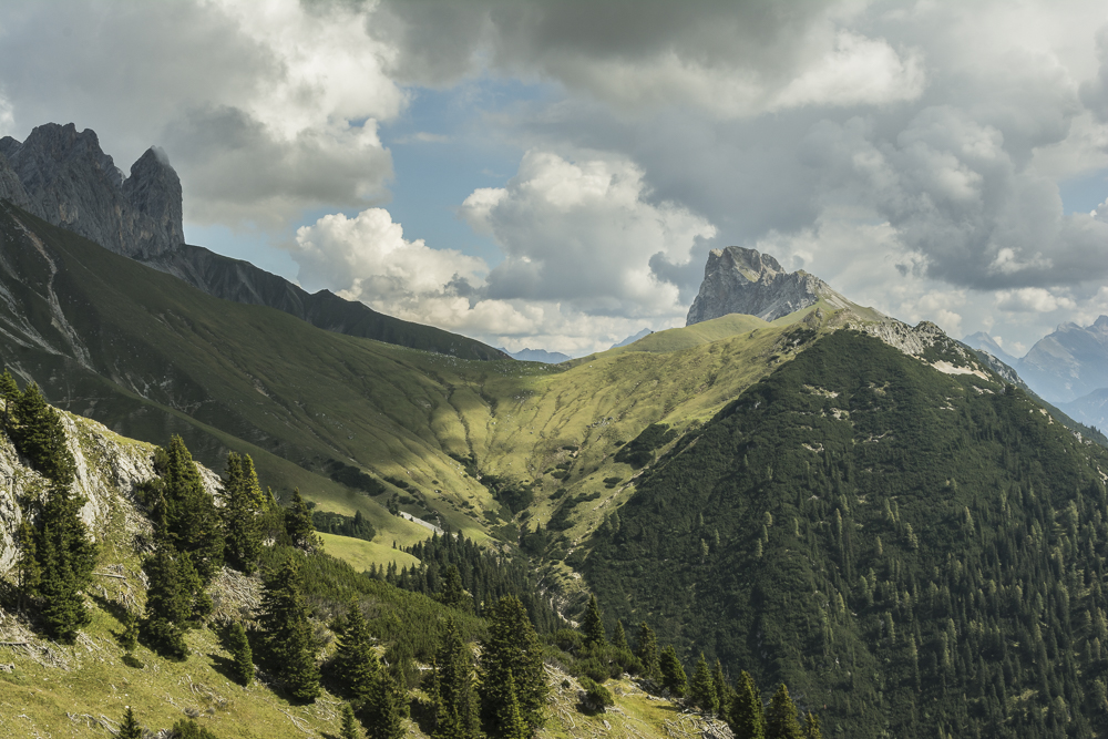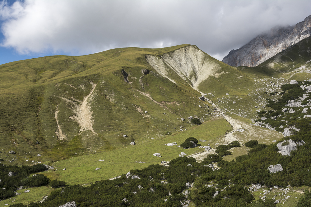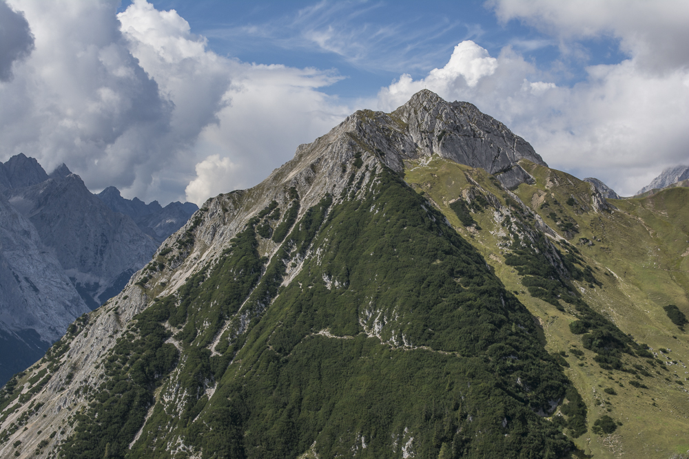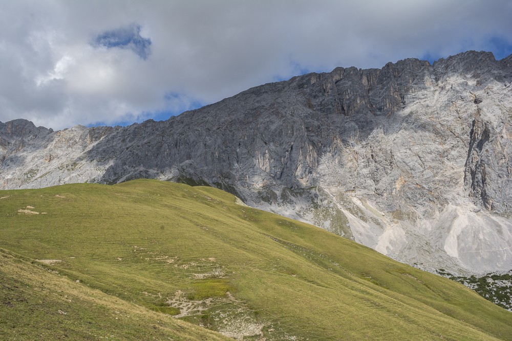 Wir gehen los, hinauf zur Rotmoosalm. Die landschaftliche Schönheit des südlichen Wettersteins – grüne Wiesenflanken + Dolomiten-ähnliche Felswände – hatte ich völlig vergessen. Toll.