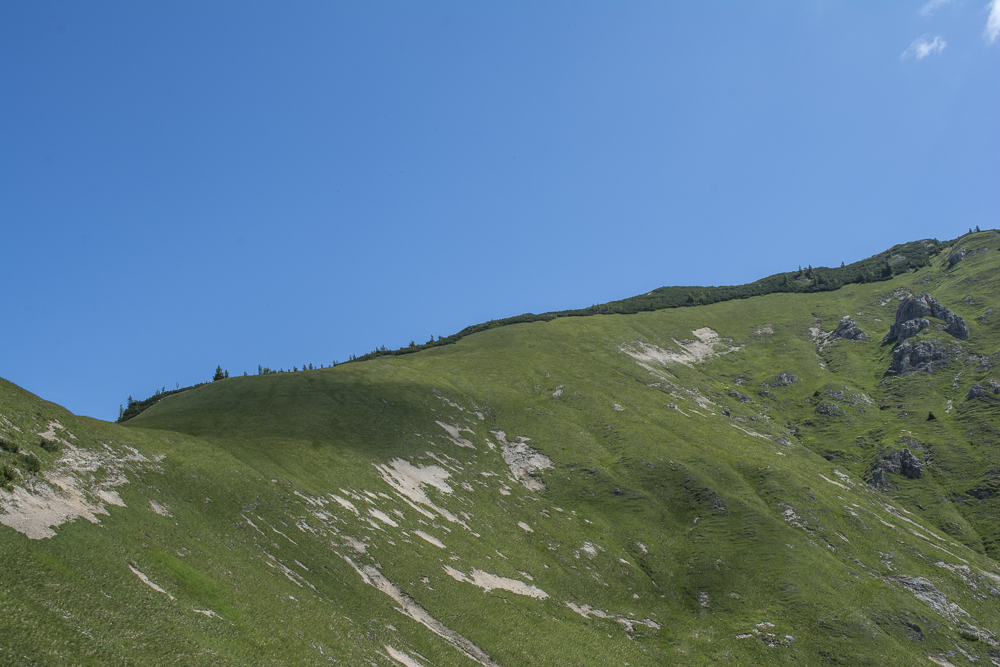 Der Abstieg: ich gehe weiter bis zu dem Markierungszeichen und steige dann weglos über die steilen Wiesen ab mit Tendenz nach rechts und erreiche den Querweg ins Wildenkar. Die Schleifen der Asphaltstraße werden wieder abgekürzt, und der Rest ist bekannt.