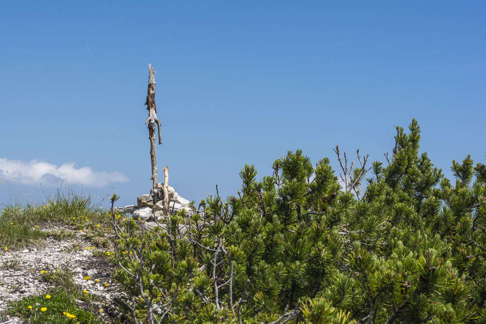 Weiter nach Osten stets am Grat, links senkrechte Abbrüche, wieder weiter Raum um mich herum, bis zum Schönfeldjoch-Gipfel, erkennbar an herumliegenden Hölzern.