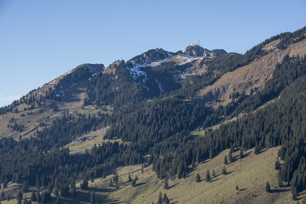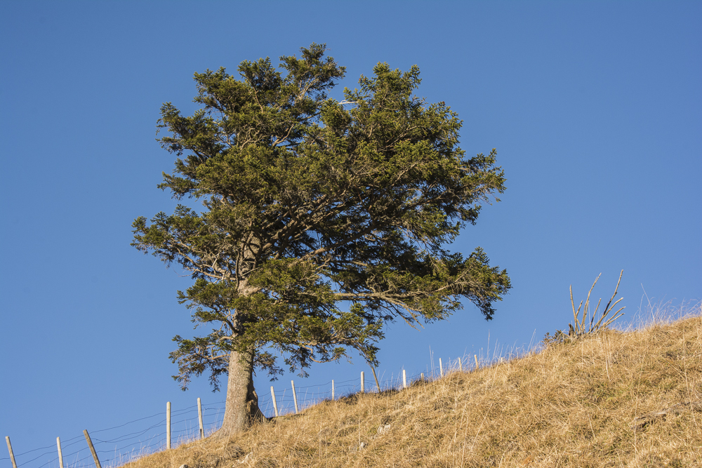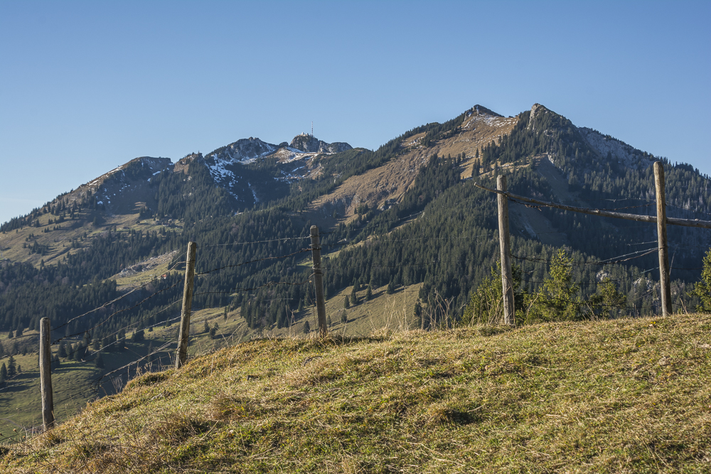 Ich steige nach Süden ab, durch die Waldschneise und den Weidezaun entlang bis zum Übertritt. Diesen nutzend, und dann hinüber gequert zum Parkplatz.