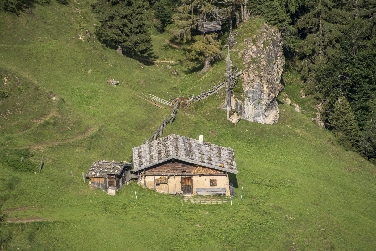 Der Abstieg nach Südosten ist zunächst ein Auf und Ab auf dem Grat, etwas schwieriger als der Aufstieg, stets mit Blick auf die Reichenspitze, und führt hinunter ins Hösljoch. Der Weg hinüber zur Alm beginnt mit einem Aufstieg, in der zerklüfteten Nordflanke quueren wir einen abgerutschten Hang und den Abraum des ehemaligen Erzbergwerks, die Gratlspitze muss gut durchlöchert sein.
