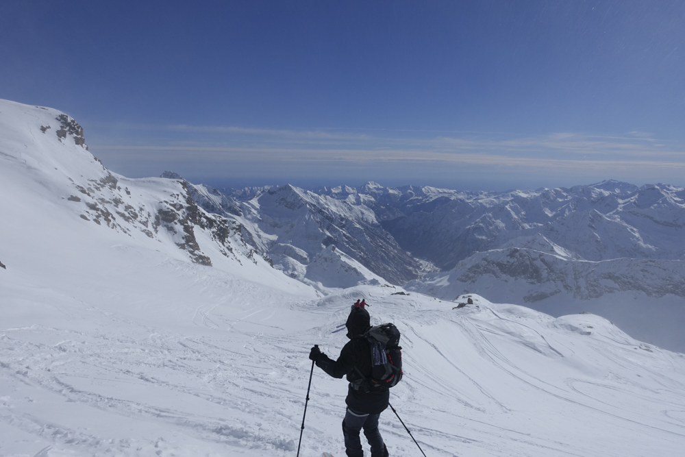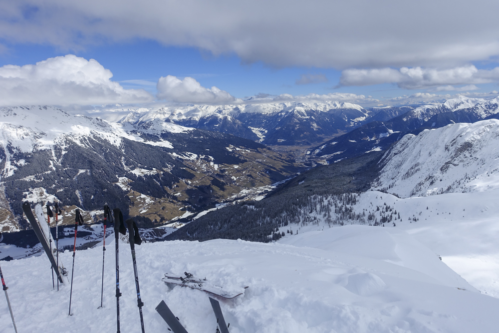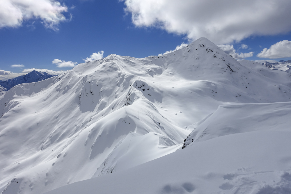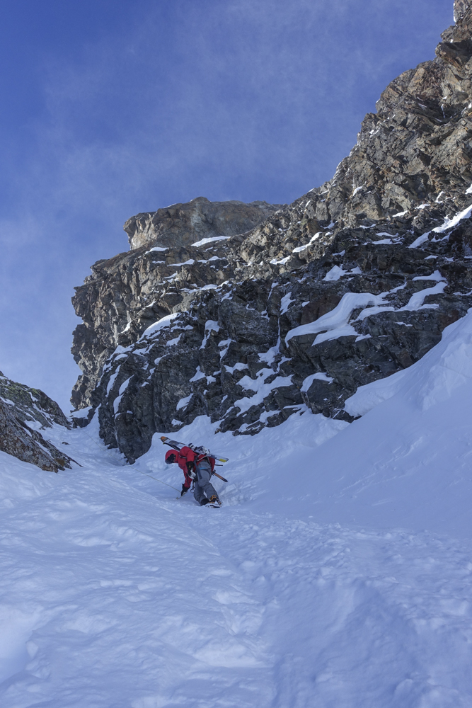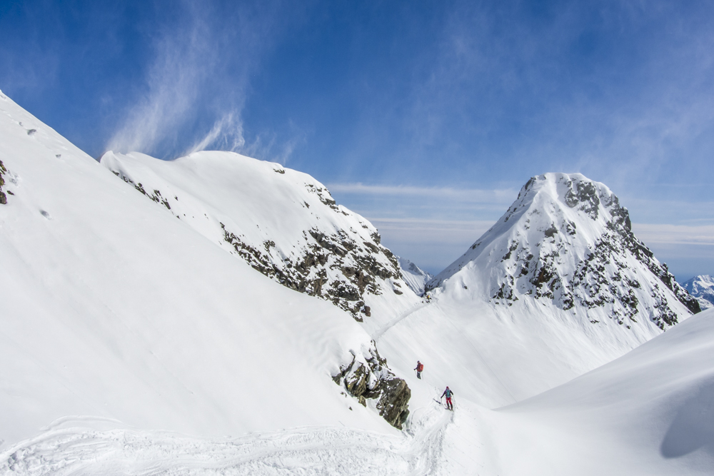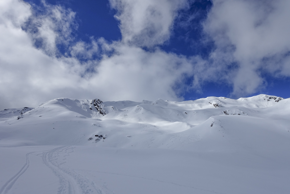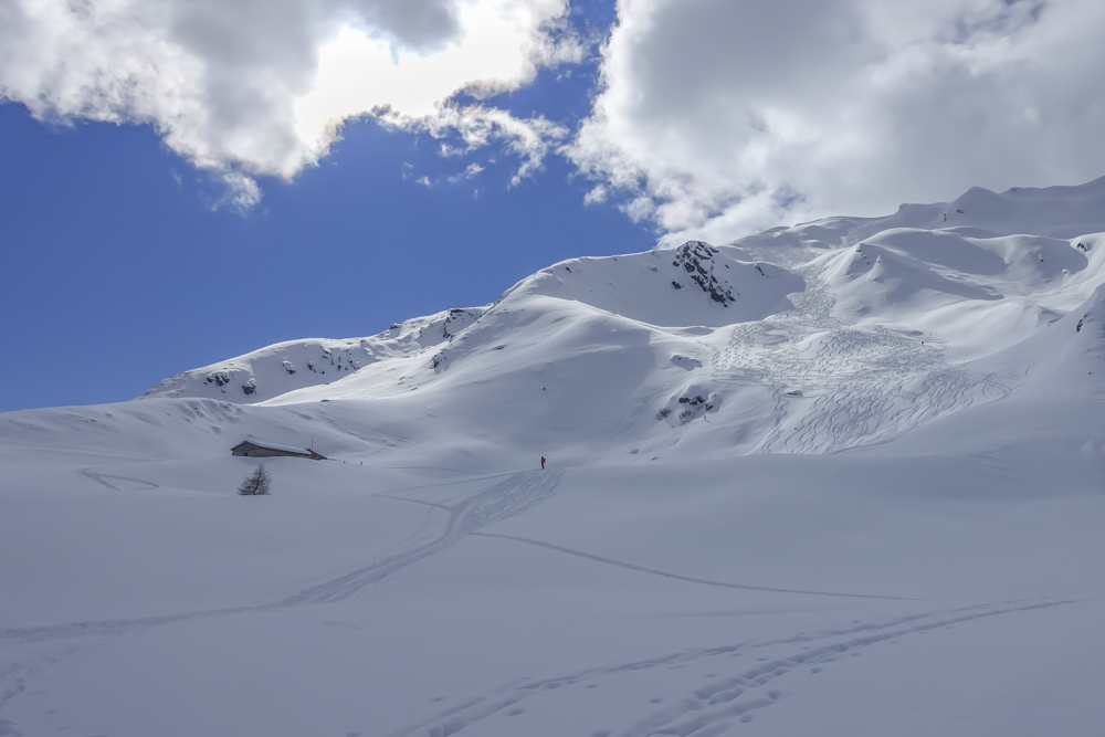 Hinauf zur Bocchetta delle Pisse, und wieder schöner Pulver bei der Abfahrt. Schließlich erreichen wir die schon bekannte mühsame Abfahrt ins Tal.