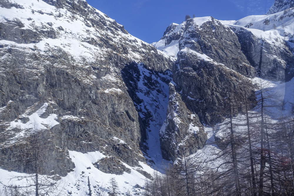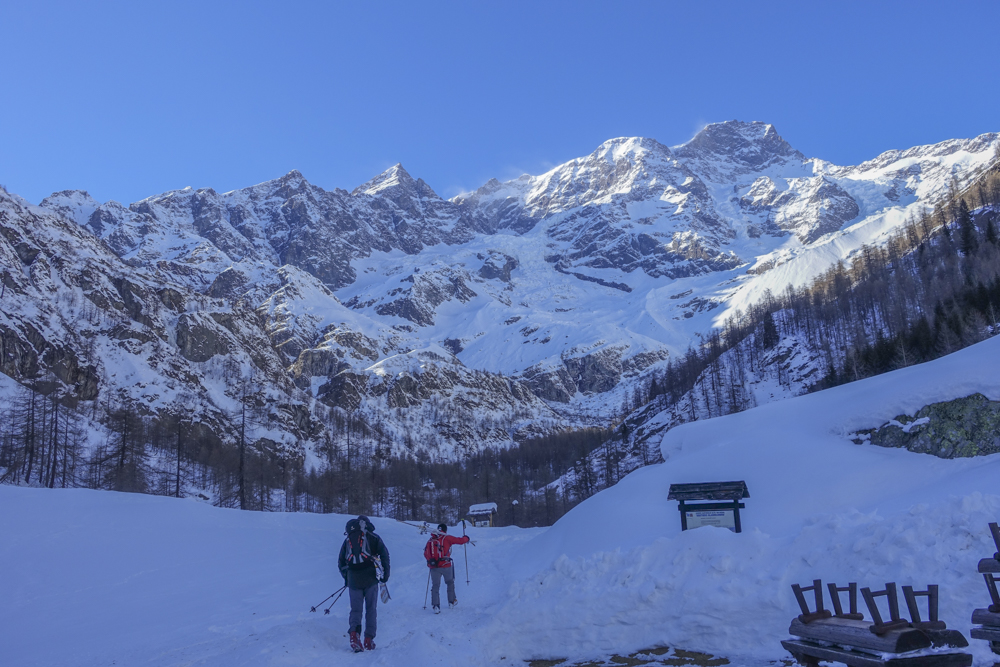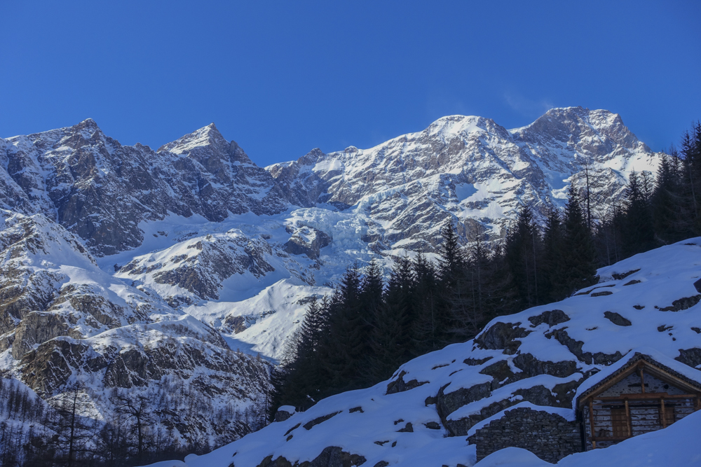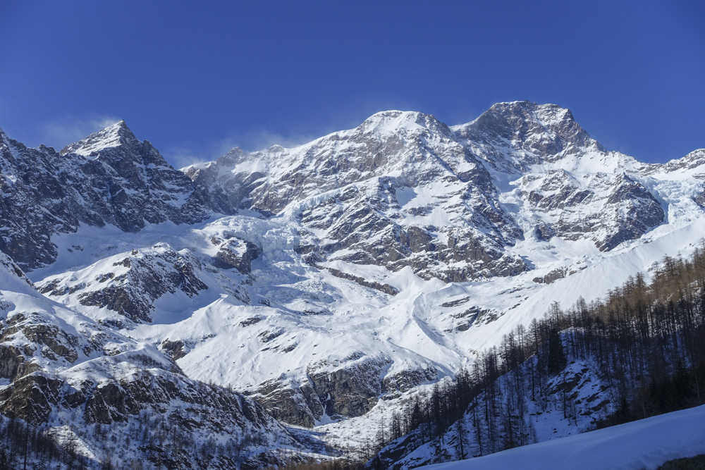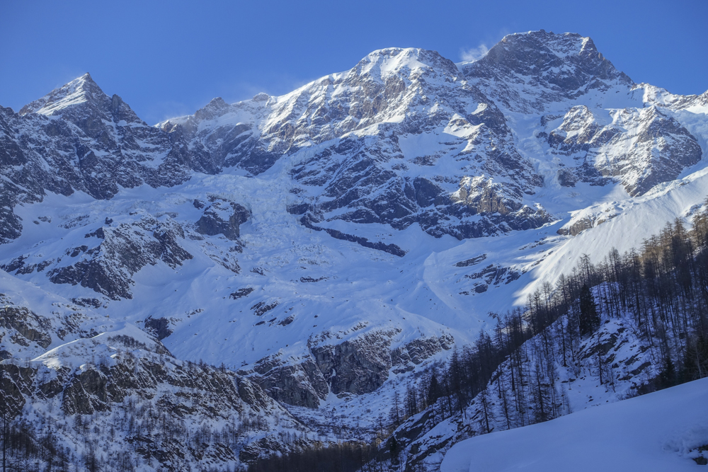 Über Alagna thront die Signalkuppe, 3,5 km höher. Die Südseite hat naturgemäß nur wenige Gletscher, aber die Größe – die Wucht der Höhe – lässt sich erahnen.