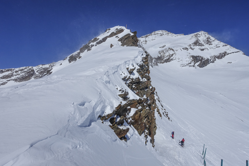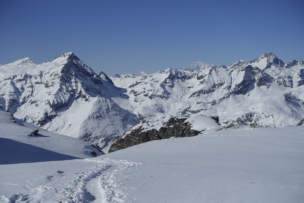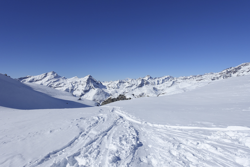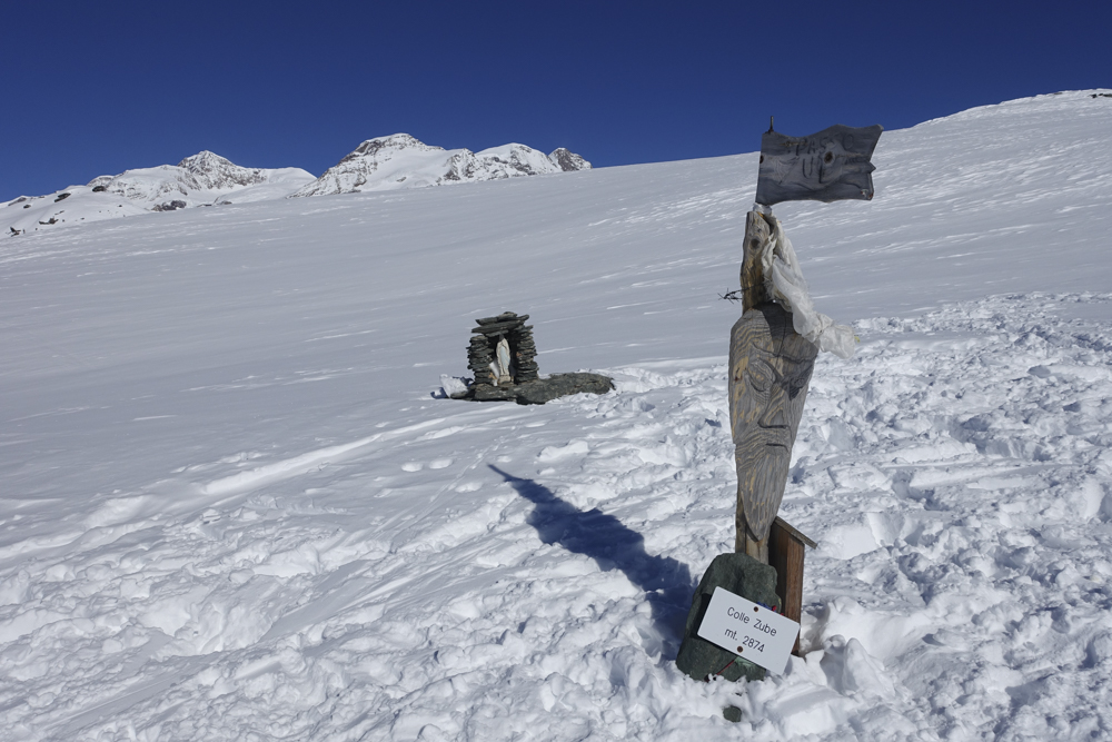 Wieder zum Passo Salati, kurze Abfahrt und kurzer Aufstieg zum Passo Zube. Die nordseitigen Hänge bieten schönen Pulver, wieder Abrutschen durch eine steile Rinne, aber zum Glück mit griffigem Schnee. Hinunter bis nach Alagna, zum Schluss auf der Piste (die Pisten sind hier glatt gehobelt, nicht die kleinste Bodenwelle, schade).