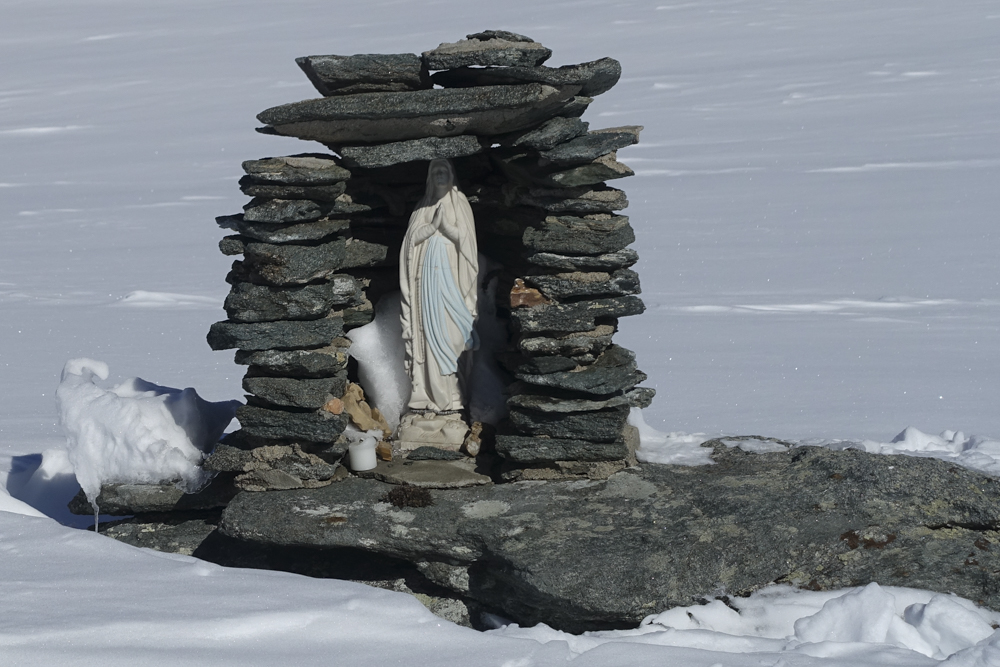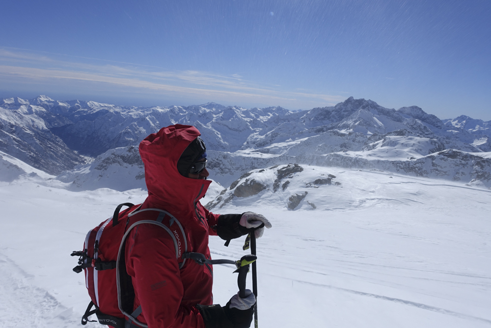 Egi, unser Schweizer Bergführer, kommt, und dann geht’s los. Mit den Seilbahnen hinauf zum Passo Salati 2970m, und dann fahren wir ab im Gelände, rutschen eine enge eisige Rinne hinunter, und holperig weiter durch Wald nach Staval. Noch einmal hinauf und jetzt bis zur Punta Indren 3280m, dann Abfahrten und Querungen bis zu einer kleinen Scharte. Hier seilt uns Egi ab, und dann weiter hinunter. Rast im Rifugio Pastore, Kontakt mit der Ährigen Edelraute in Form eines Schnäpschens. Und dann noch eine (für mich) mühsame Abfahrt ins Tal.
