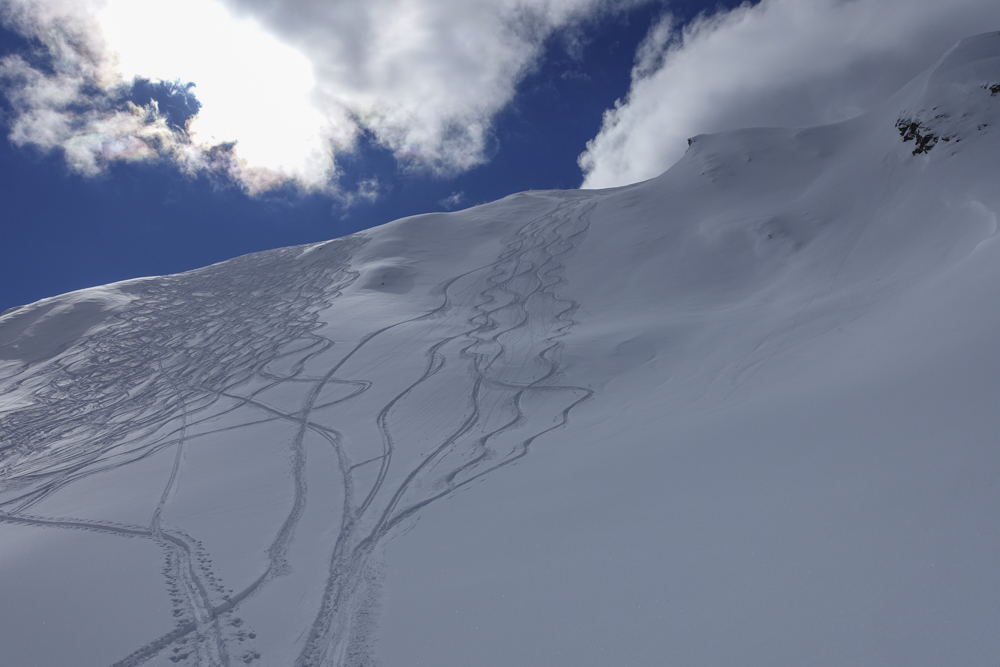 Für die Abfahrt finden wir unberührtes Gelände, bis zum Wald, den die Kollegen natürlich locker wedelnd durchfahren.