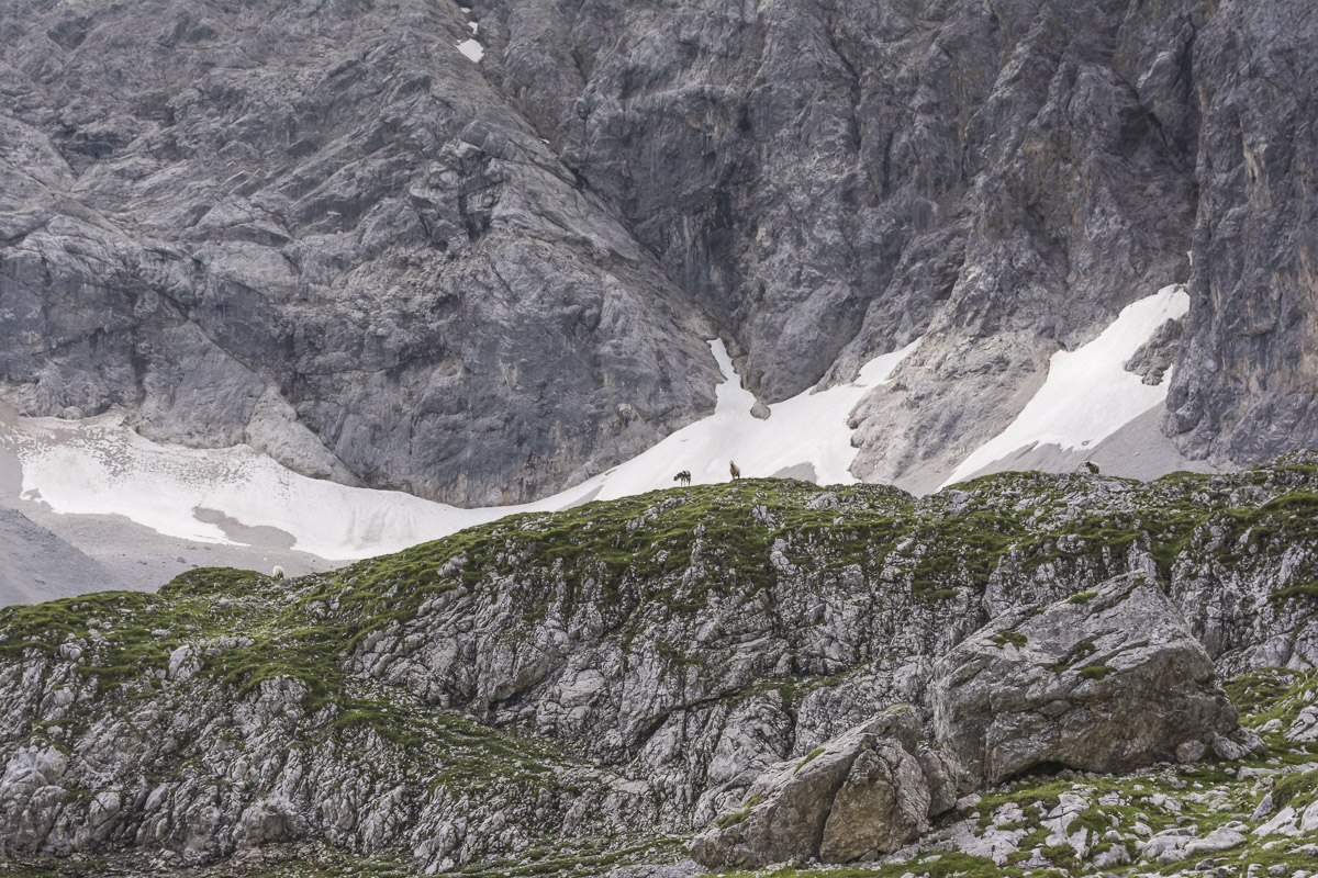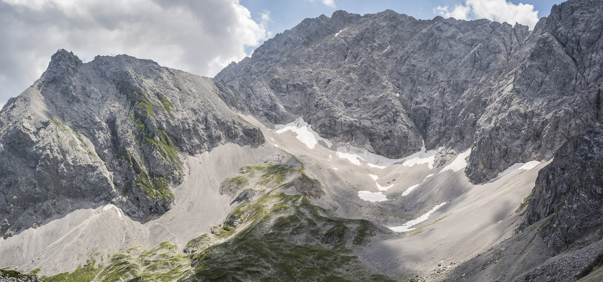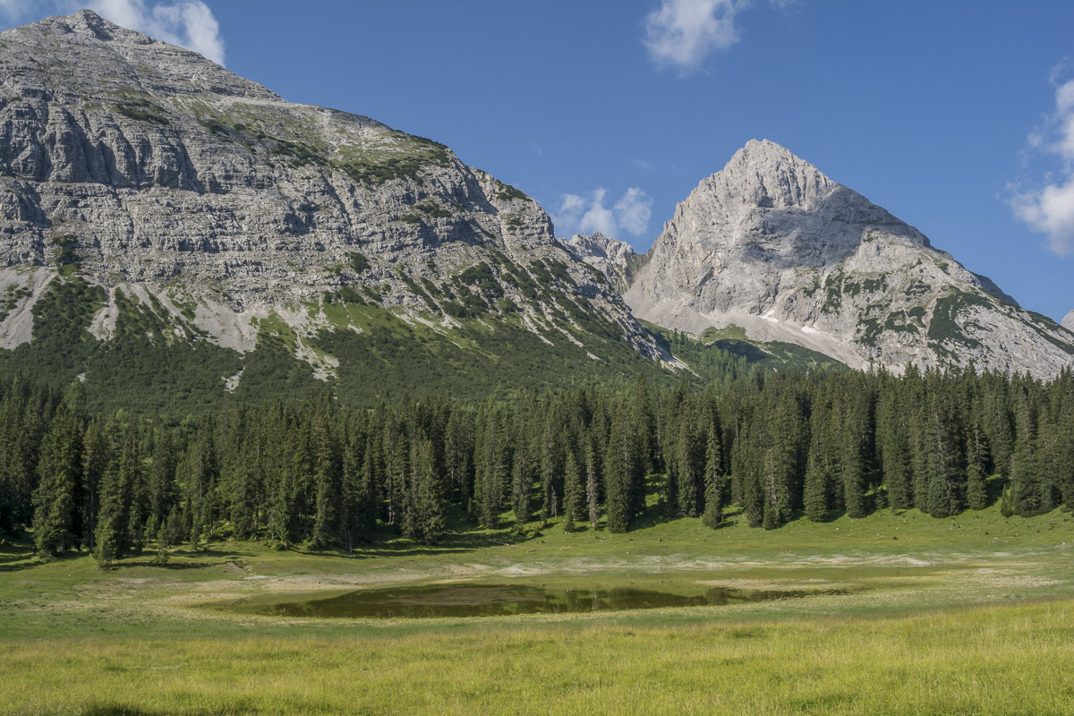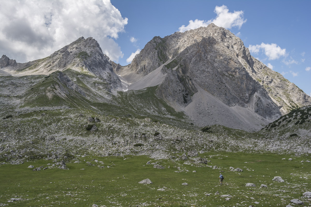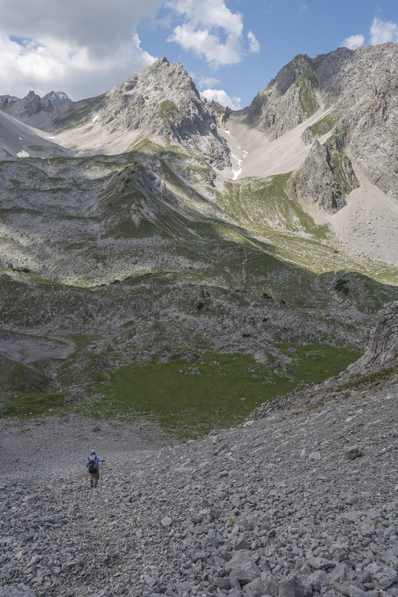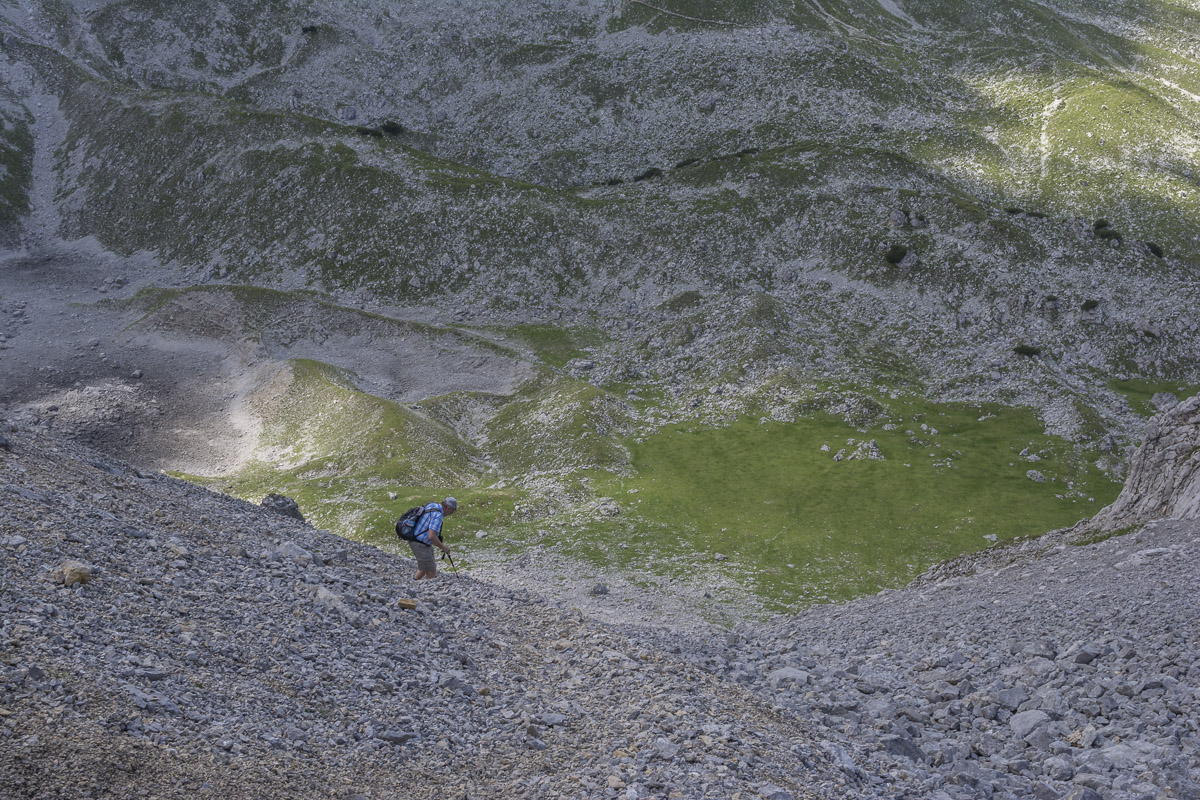 Zurück in die Scharte und auf Geröll ins Brendlkar und weiter nach rechts zum Brendlsee. Kühlung für die heiß gelaufenen Füße. Auf dem Weg weiter hinunter, und auf bekannter Straße geht’s zum Senioren-gerechten Abschluss. Mit Peter.
