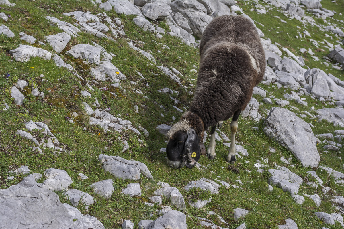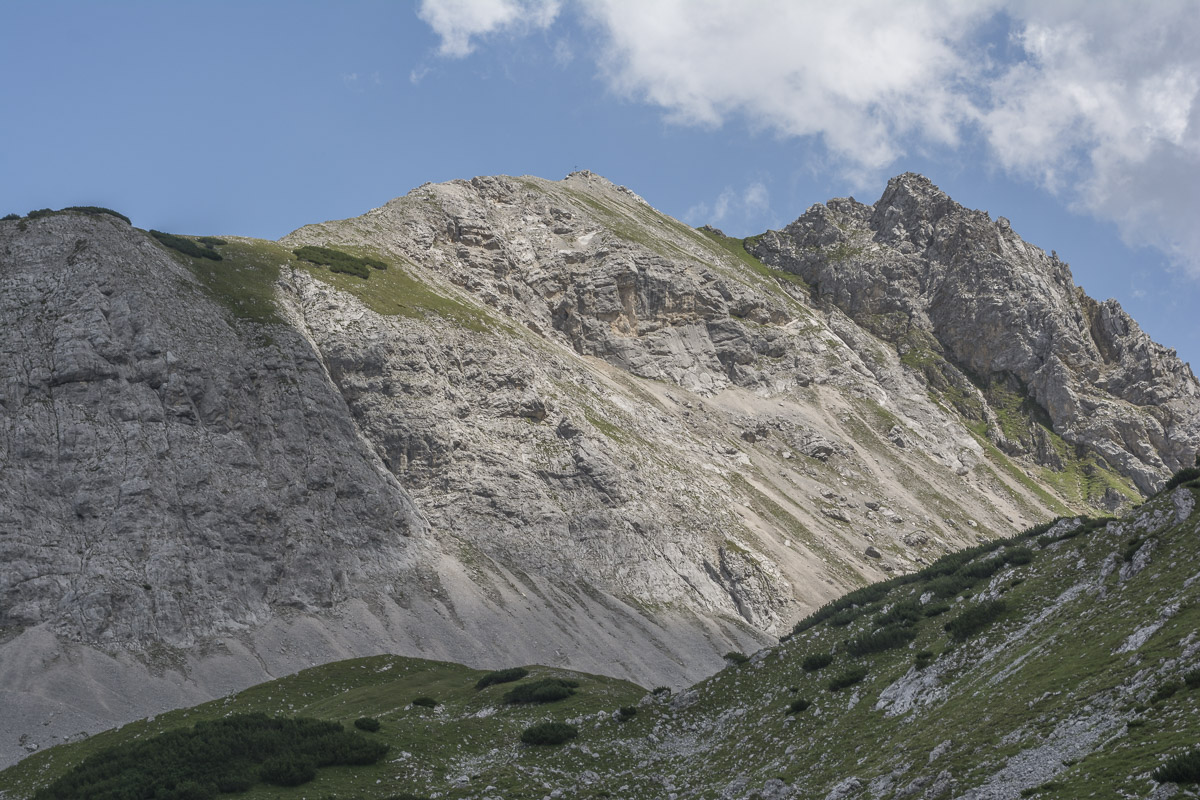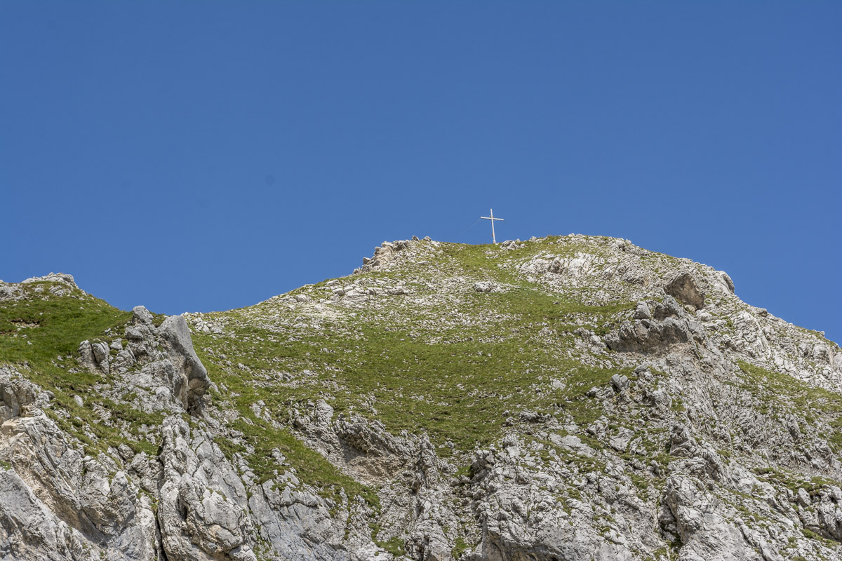 Auf der Straße laufen wir zum Igelssee. Ein Karrenweg führt nach Süden, und dann linkerhand, hinter einem Zaun, beginnt der Weg, der uns in gleichmäßiger Steigung hinaufführt bis unter die Igelscharte. Von der Scharte nach rechts und einen unangenehmen Schotterhang hinauf zu einer Wiesenschulter. Von hier ist das Gipfelkreuz des Igelskopf bereits zu sehen.