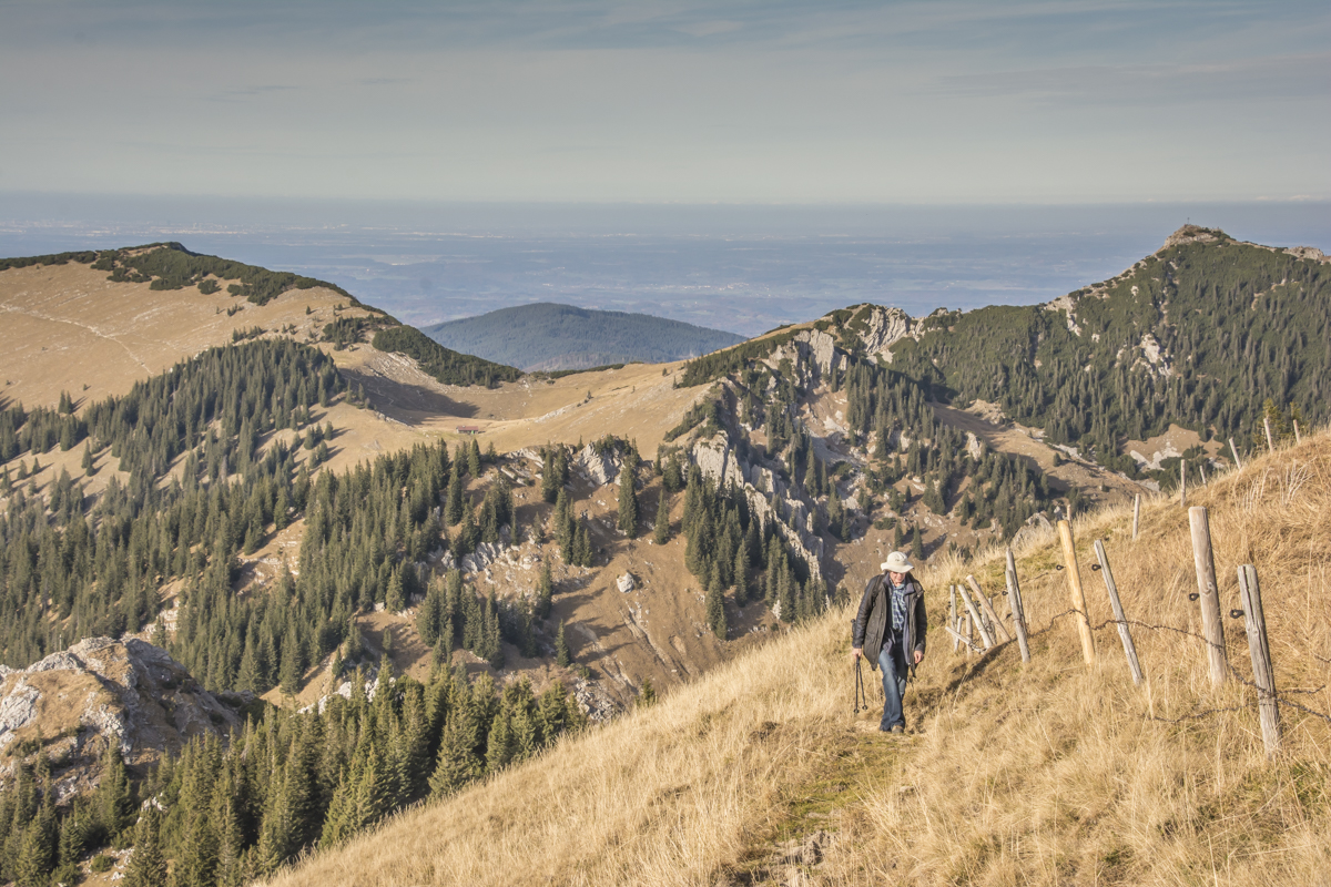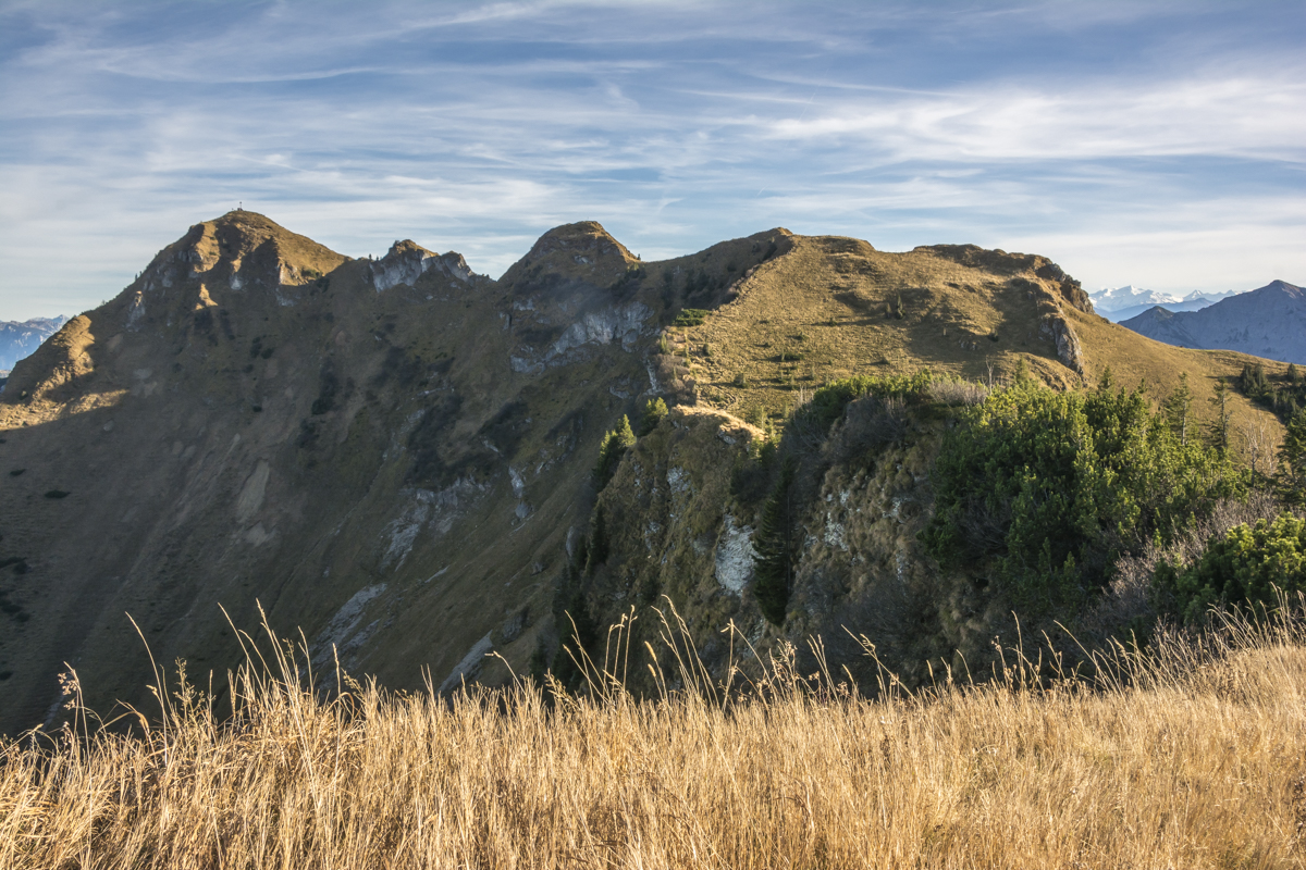 Gesättigt vom Weitblick überschreiten wir den Berg und gehen hinunter zur Oberen Wallenburg-Alm. Mit Gespür findet sich der steile Abstieg zur Schlepplift-Piste.
