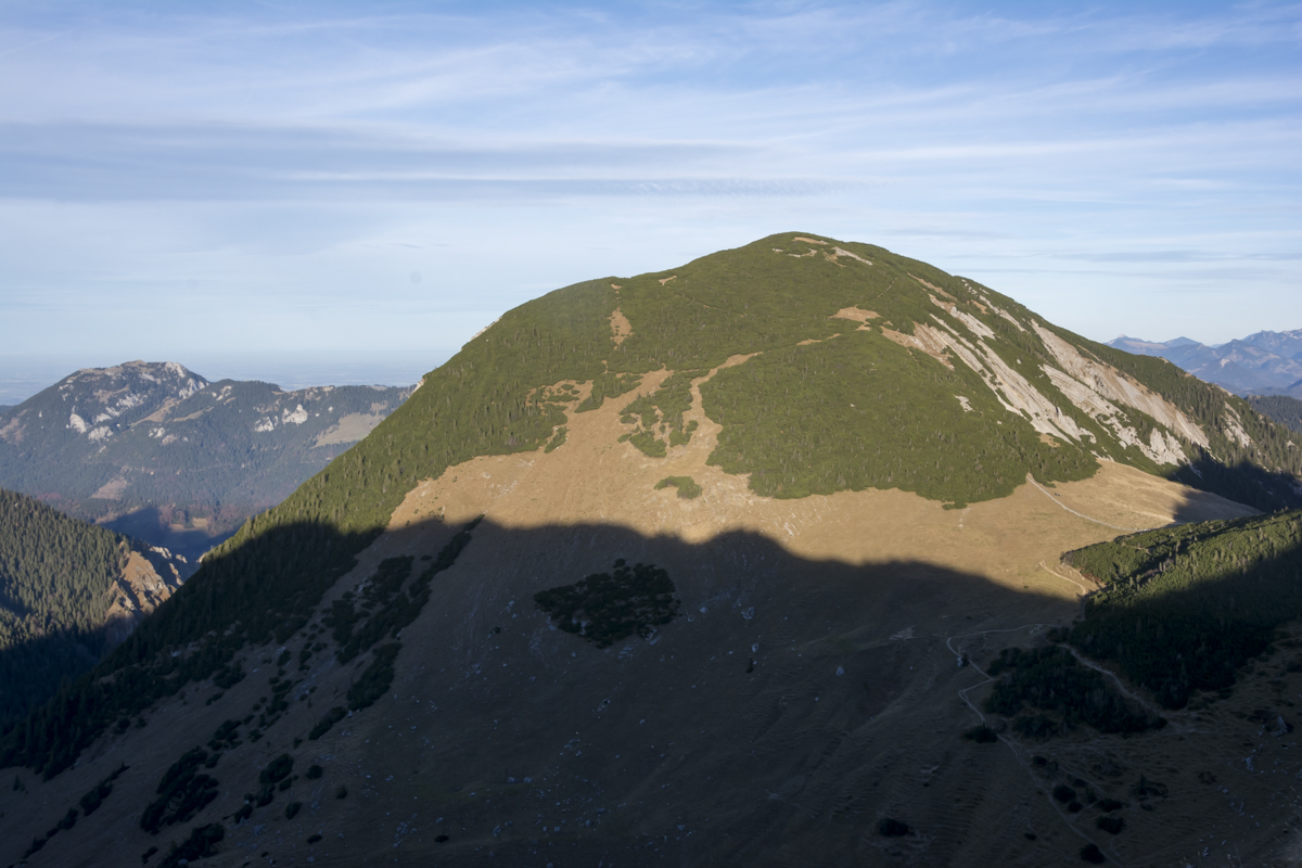 Ist ja eher ein Spaziergang. Die Taubenstein-Bahn fährt noch, geparkt haben wir bei der Kirche am Spitzingsee. Wir folgen dem breiten Weg zur Rotwand und zweigen dann weglos links ab hinauf zum Gipfel des Lempersberg.