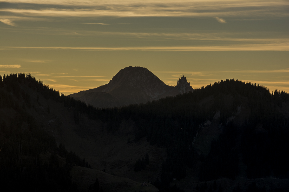 Auf der Wiese weglos hinunter, ein herrliches Abendrot verwöhnt uns, und auf der Straße gehen wir im Dunkeln etwas länglich hinaus zum See. Mit Ronald.