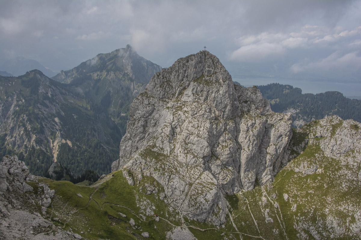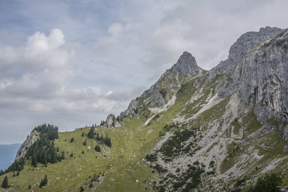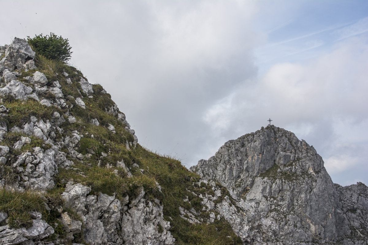 Start ist beim sogenannten Alpenhotel Ammerwald der BMW Group. Über den Schützensteig geht es, gehen wir hinauf zur Jägerhütte und weiter in den Niederen Straußbergsattel. Die folgende Querung erfreut trotz Wolken mit viel Aussicht, was die Motivation liefert für die Kehren hoch in den Sattel zwischen Gabelschrofen und Krähe. Ein paar Felsen noch, und der Gipfel ist erreicht.