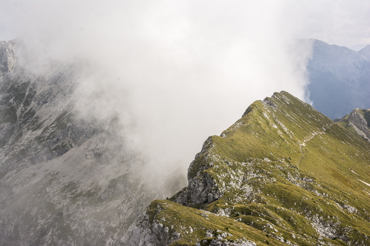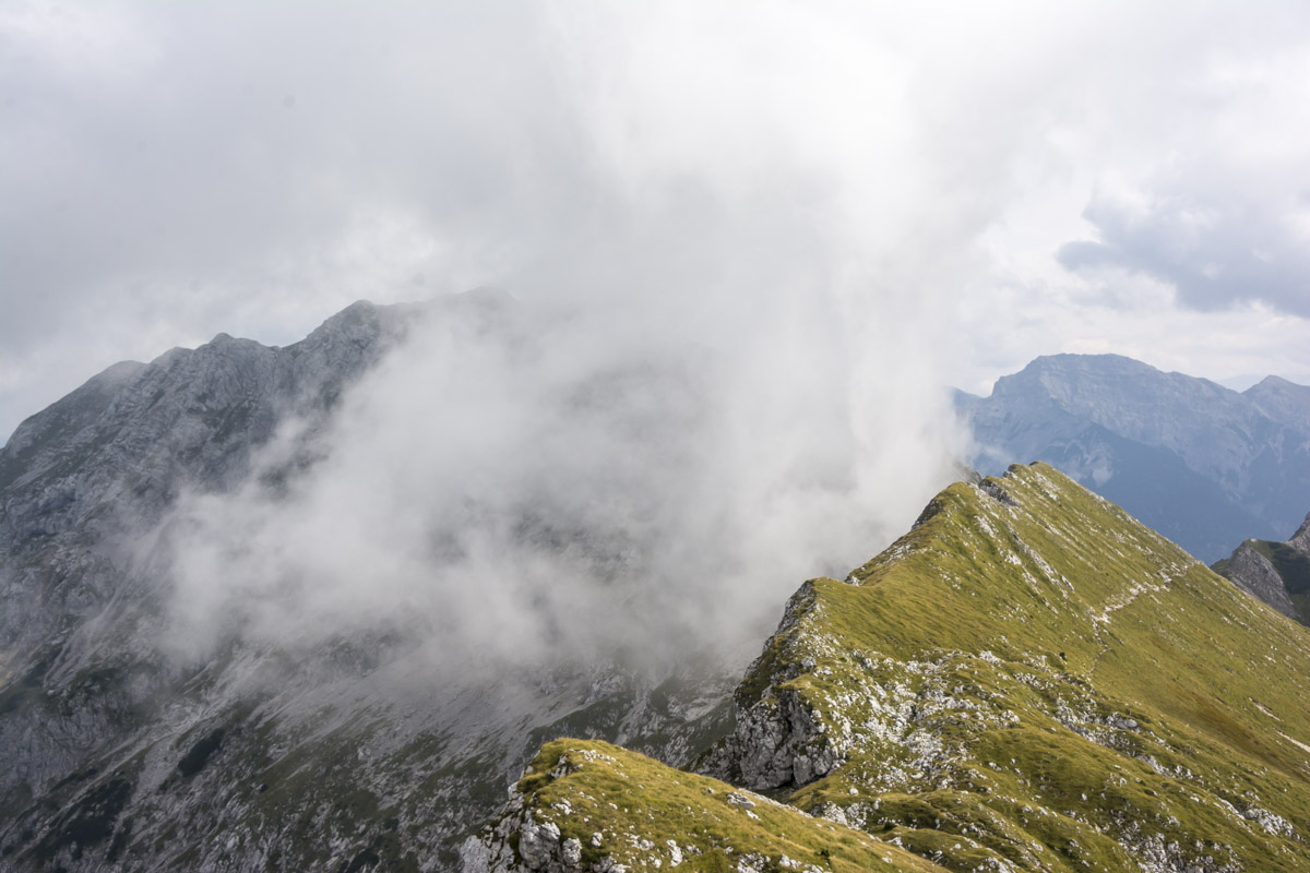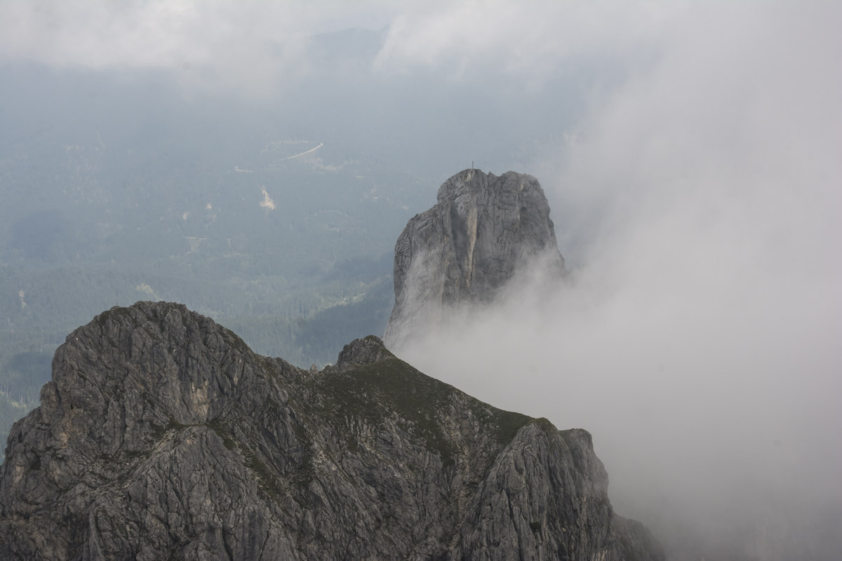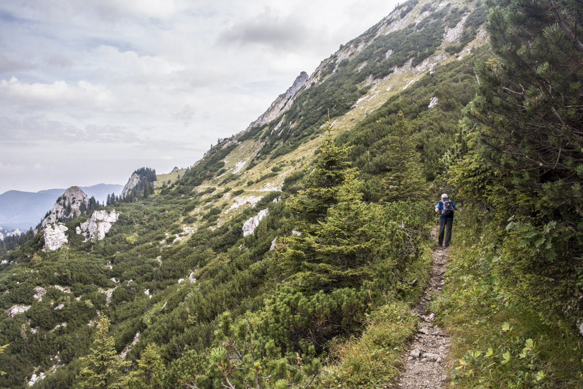 Start ist beim sogenannten Alpenhotel Ammerwald der BMW Group. Über den Schützensteig geht es, gehen wir hinauf zur Jägerhütte und weiter in den Niederen Straußbergsattel. Die folgende Querung erfreut trotz Wolken mit viel Aussicht, was die Motivation liefert für die Kehren hoch in den Sattel zwischen Gabelschrofen und Krähe. Ein paar Felsen noch, und der Gipfel ist erreicht.