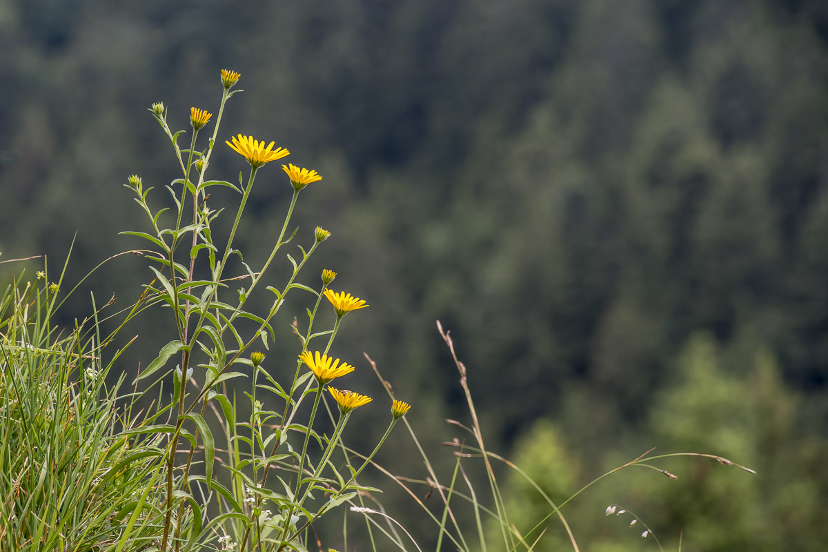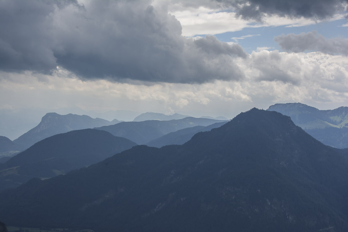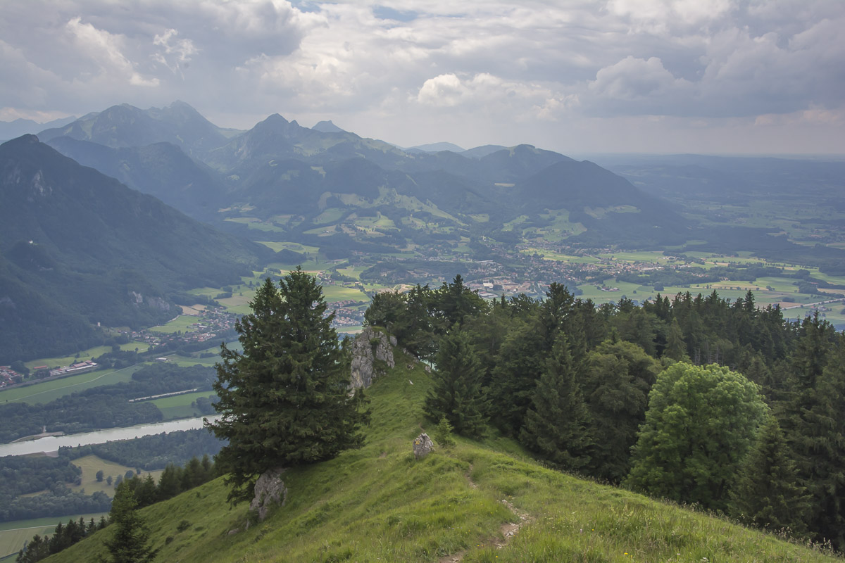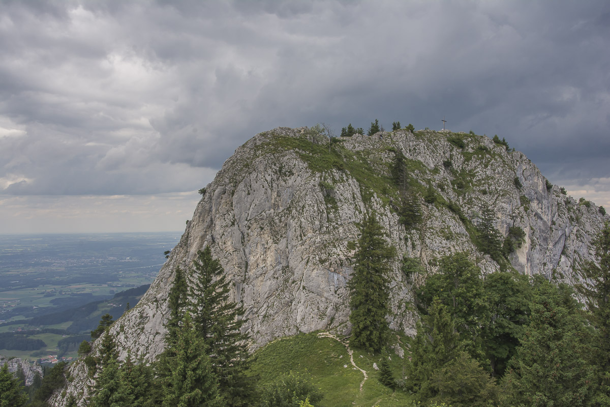 Immer noch auf der Suche nach einer Tour mit wenigen Höhenmetern. Da fällt mir der Heuberg ein. Das Straßengeflecht um den Samerberg ist eine kleine Herausforderung, sie wird gemeistert – Parkplatz Schweiber. Auf der Forststraße geht es dahin, bis zu Wegweisern, links zum Heuberg und rechts zum Heuberg. Ich entscheide mich für rechts, das bedeutet steil hinauf in den Sattel zwischen Heuberg und Kindlwand. Ein offensichtlicher Steig zur Kindlwand, er ist exponiert, ich fühle mich (noch) nicht trittsicher genug, kehre um. Ein kleiner Grat, garniert mit Bäumen und Aussichtspunkten, führt hinauf zum Heuberg. Graue Wolken hängen am Himmel, an diesem SuperSonnenWochenende (Wetterbericht). Na ja, mit dem kurzen Klettersteig auf die Wasserwand könnte es ja klappen, denke ich mir. Es klappt, wenn auch mit leisem Protest des angenähten Innenbandes. Beim holperigen Abstieg zu den Daffneralmen wird der Protest stärker, aber was hilft’s, und auf der Straße an den Wegweisern vorbei zurück zum Parkplatz.