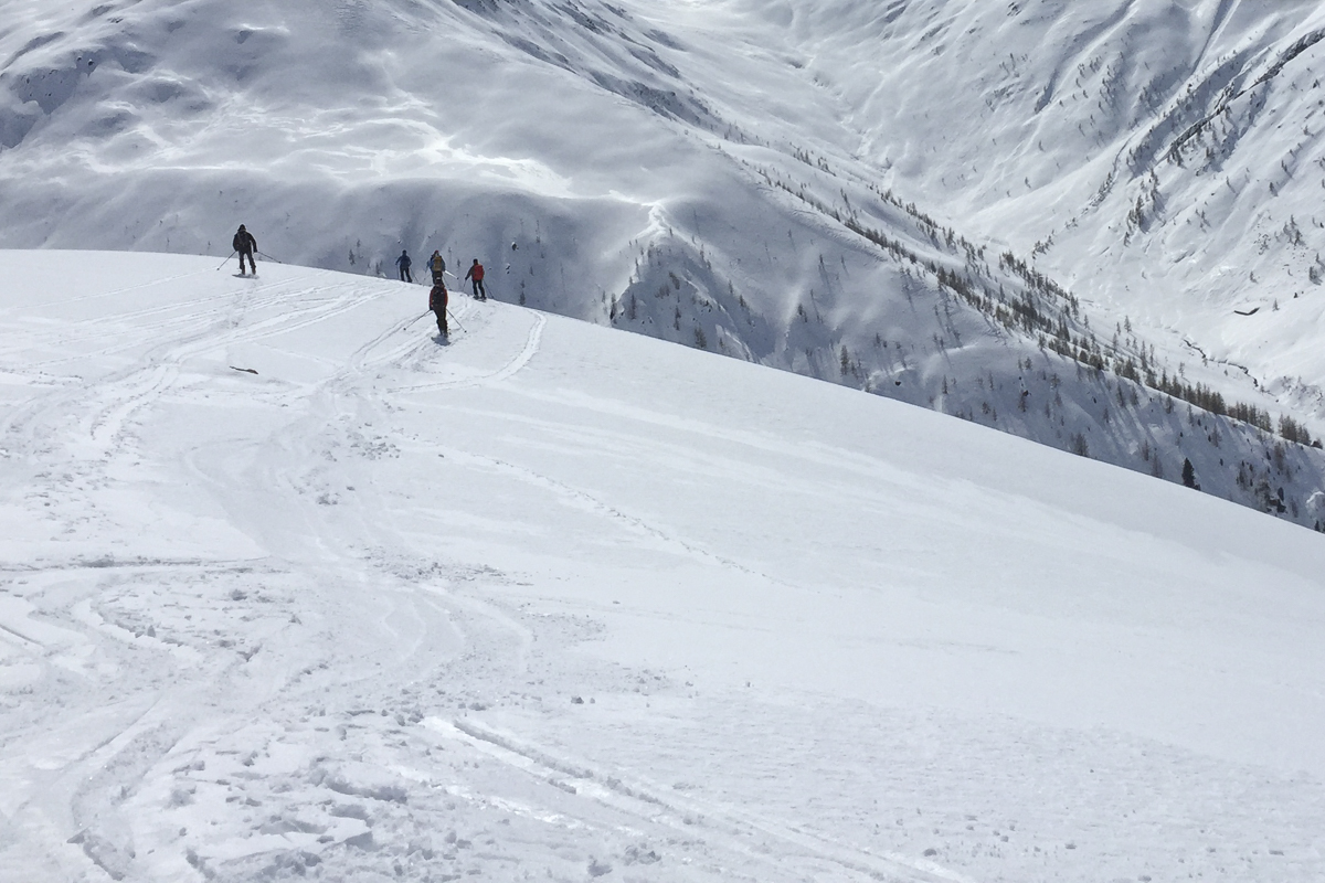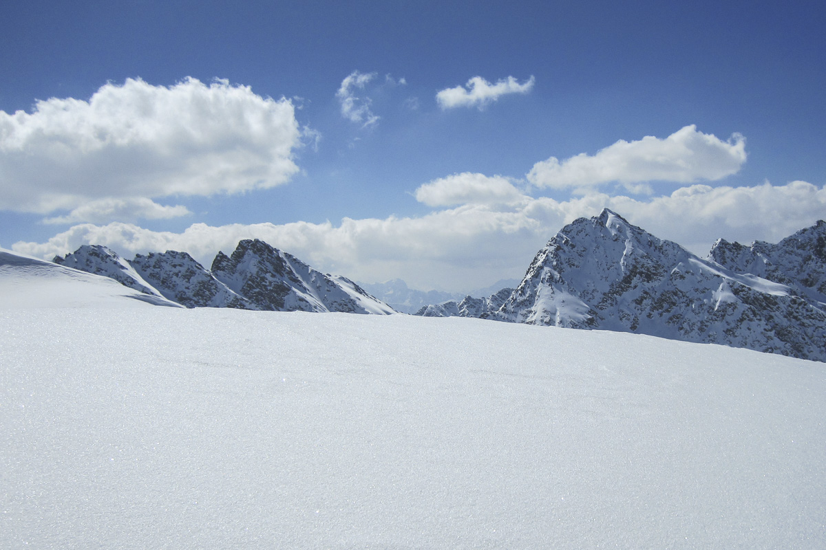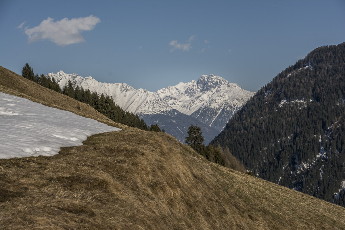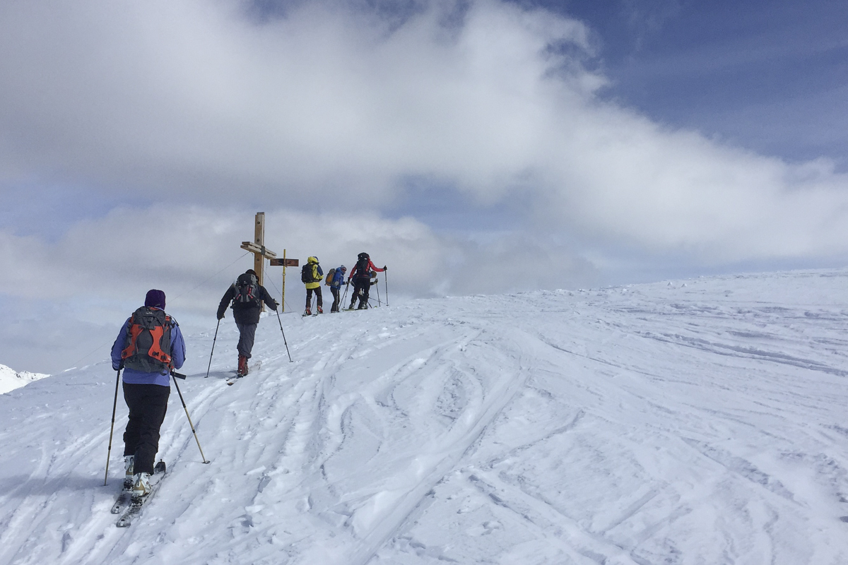 Mit dem Auto hinauf zum Staller Sattel. Auf der offen gelassenen Piste, den alten Liftmasten folgend steigen wir hoch bis in den Sattel unterhalb des Großen Mandls.