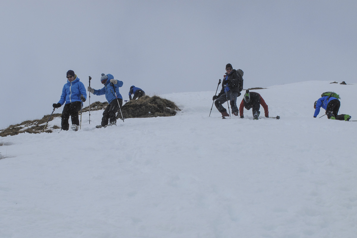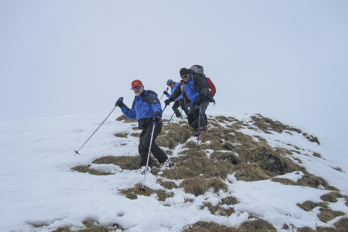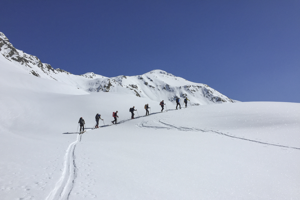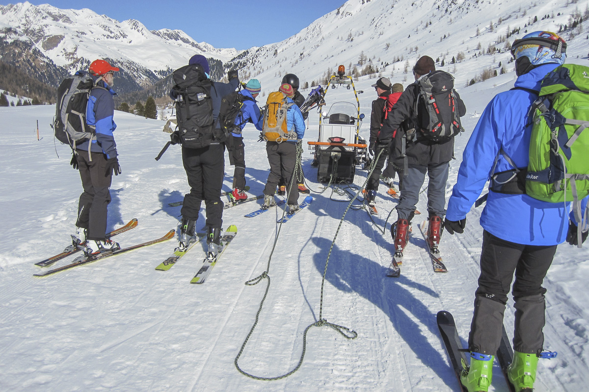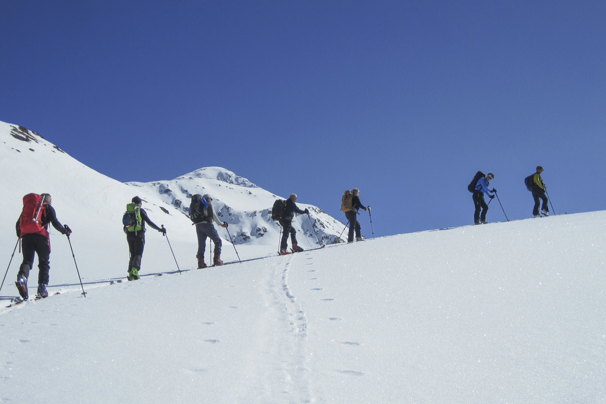 Mit dem Auto hinauf zum Staller Sattel. Auf der offen gelassenen Piste, den alten Liftmasten folgend steigen wir hoch bis in den Sattel unterhalb des Großen Mandls.