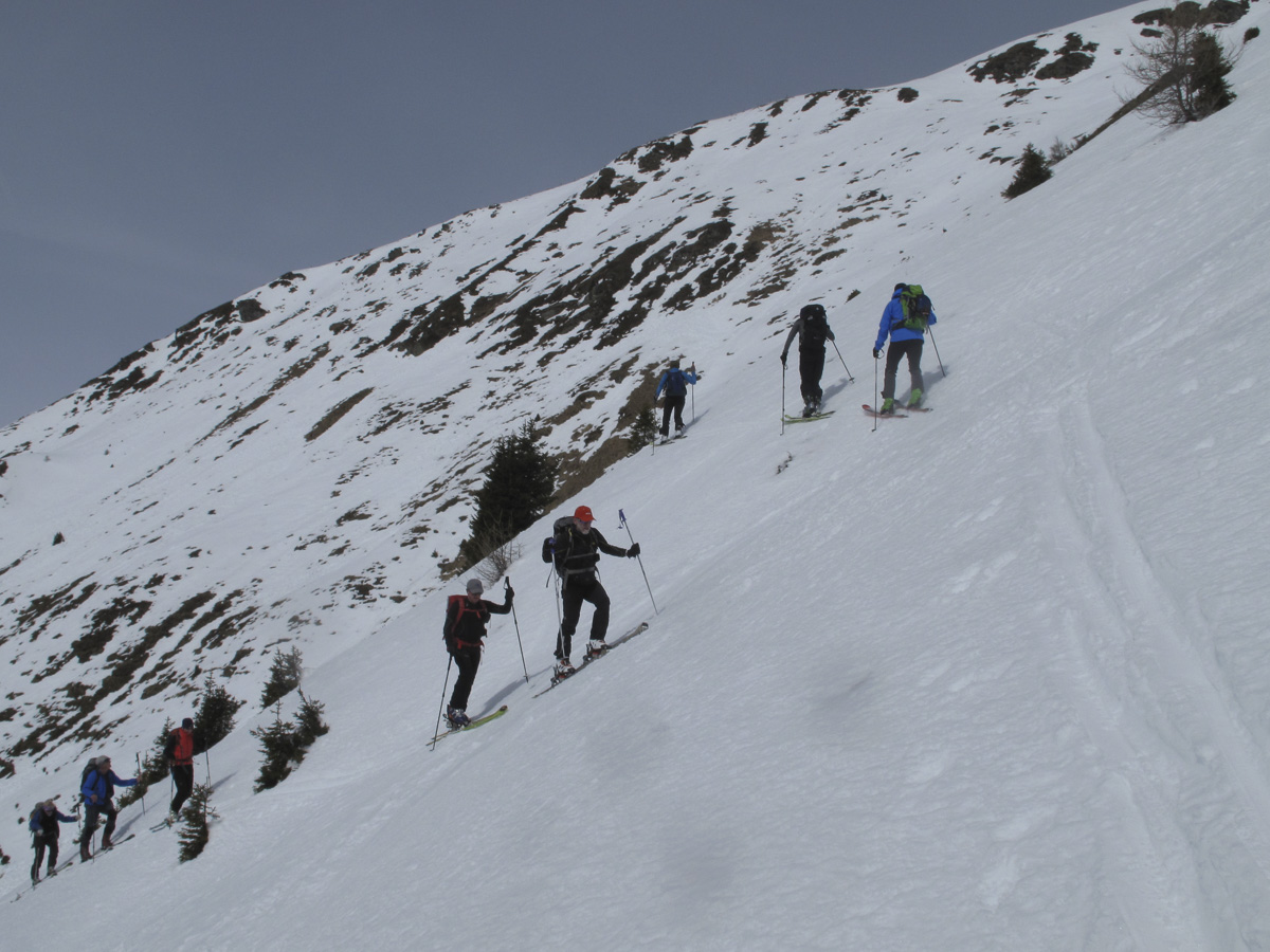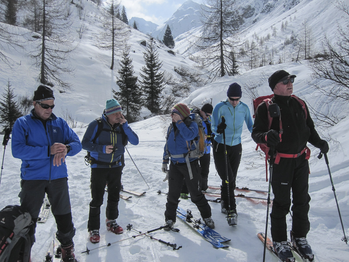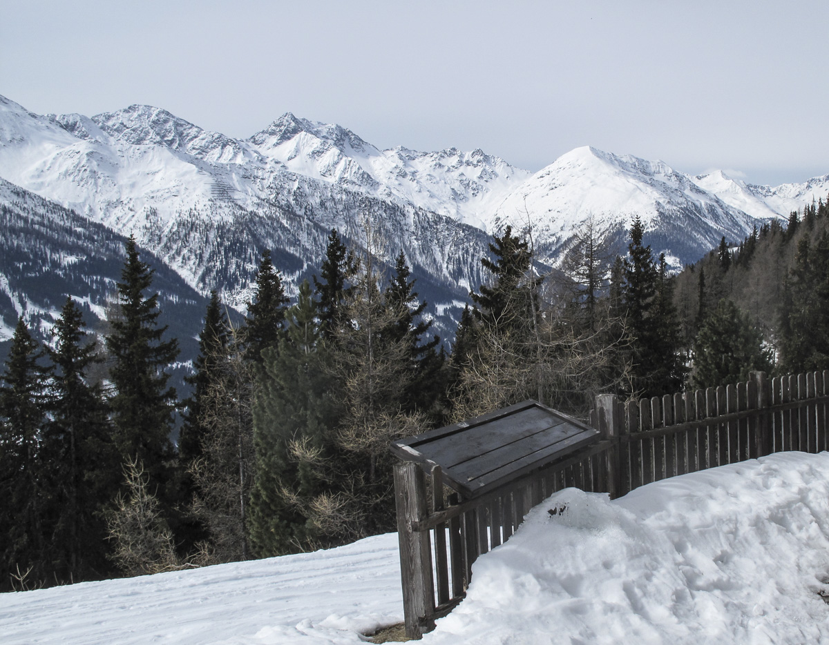 Wir fahren nach St. Jakob und hoch bis zur Jausenstation Jägerstube. Auf länglicher Straße gehen wir so dahin, bis sich die freien Hänge auftun. Hinauf, die Lawinenverbauungen kreuzend, über welliges Gelände, an einem Felskopf rechts vorbei zu einem selbst definierten Endpunkt, nach 1200Hm.