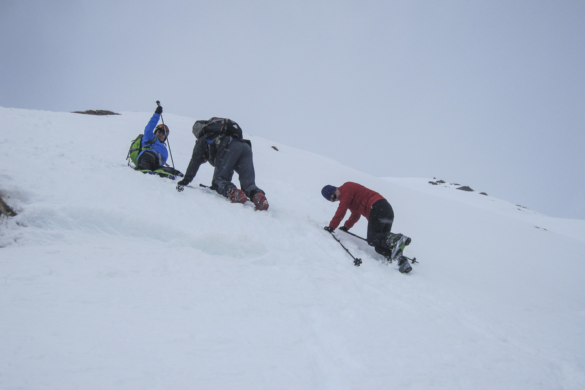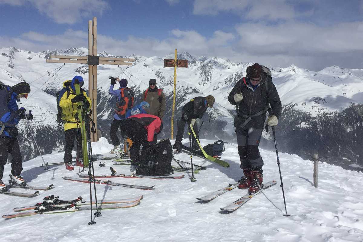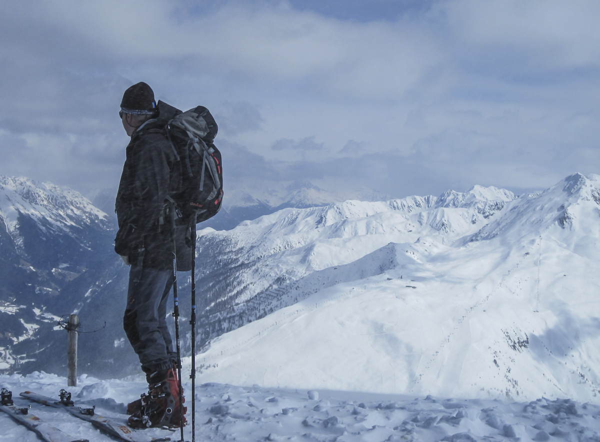 Wir fahren zum Skigebiet von St. Jakob. Für 1000Hm Auffahrt sind 26€ zu zahlen. Nach kurzer Abfahrt queren wir unterhalb des Großen Leppleskofels und steigen hinauf zu einer Art Vorgipfel der versteckt liegenden Hochleitenspitze.