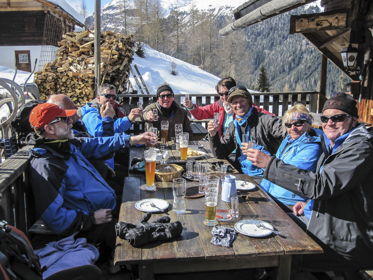 Die Abfahrt geht nach Westen hinunter, an der Jesachalm links vorbei, und dann mühsam auf der Straße mit hartem Schnee zur Alpe Stalle. Hier gibt es zweimal Obst: Marille und Birne. Und damit sind wir bereit für die Rodelbahn, und weiter zur Kapelle Maria Hilf, wo uns der Postbus aufnimmt und zur Talstation zurückbringt.