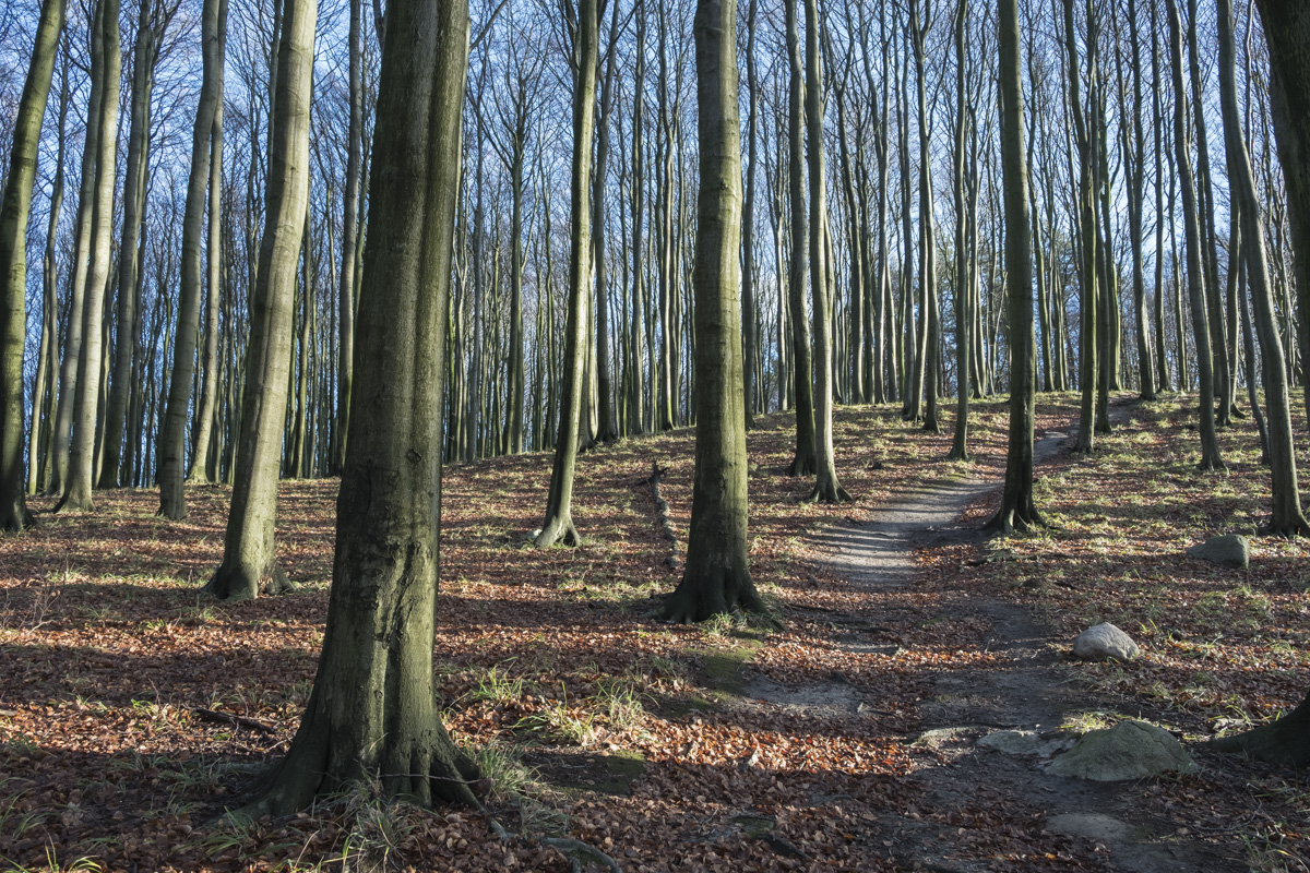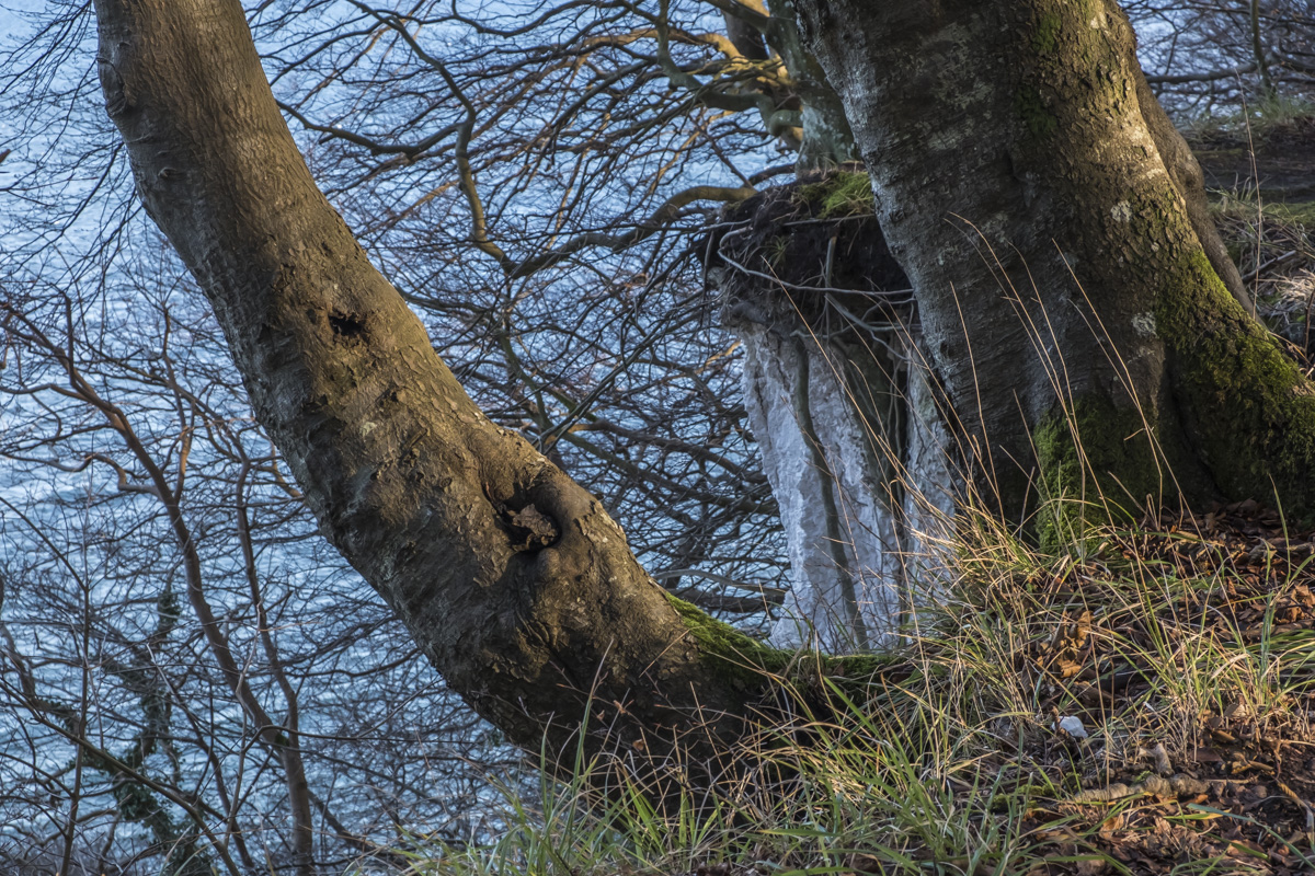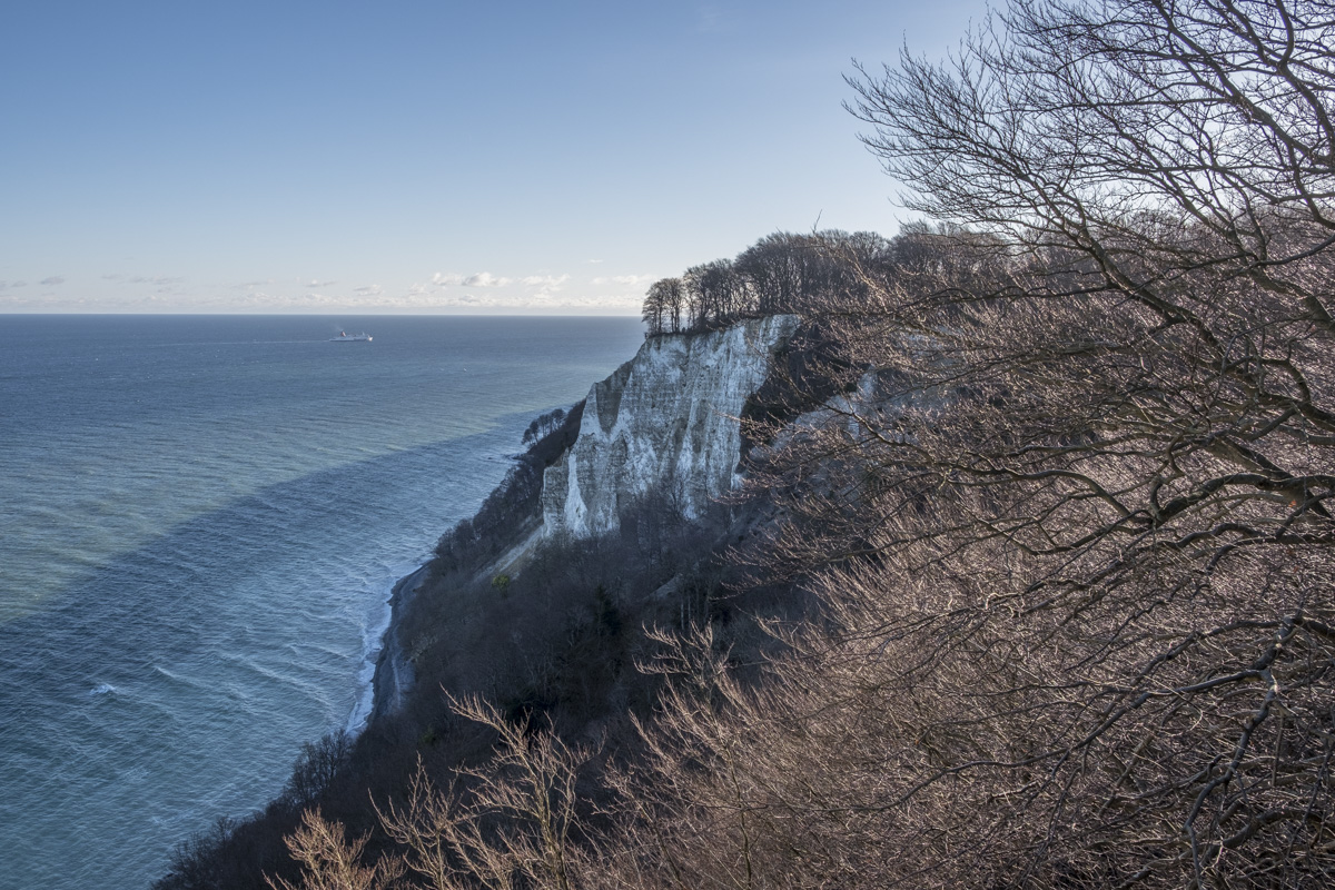 Vom gebührenpflichtigen Großparkplatz in Hagen laufen wir am Pfenniggrab (größere Steine) und am Herthasee vorbei zum Eingang in das gebührenpflichtige Nationalpark-Zentrum des Nationalparks Jasmund. Das Video über die Buchenwälder ist sehenswert, die Aussicht vom Königsstuhl mager. Der Abstieg zur 110 Meter tiefer liegenden Küste ist gesperrt. Wir verlassen das Zentrum und folgen dem Höhenuferweg nach Süden, und nun zeigen sich die schon erwarteten imposanten Tief-, Vor- und Rückblicke. Auch die laublosen Buchenwälder haben ihren Reiz. Nach dem Kolliker Ort folgt ein länglicher Rückweg.