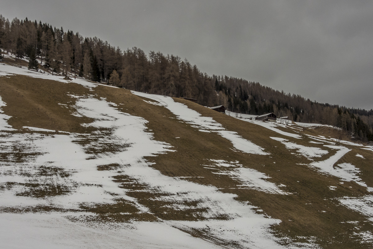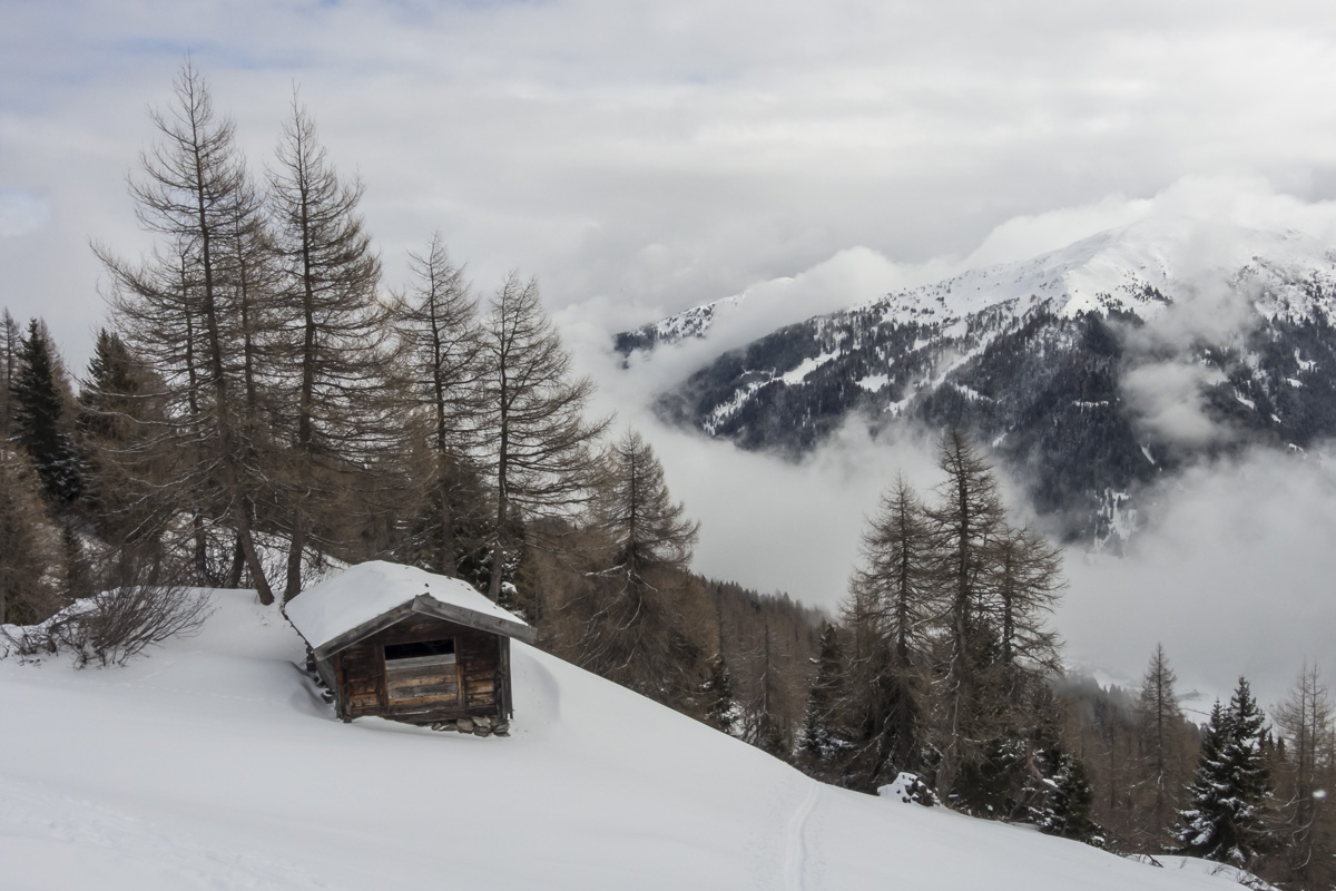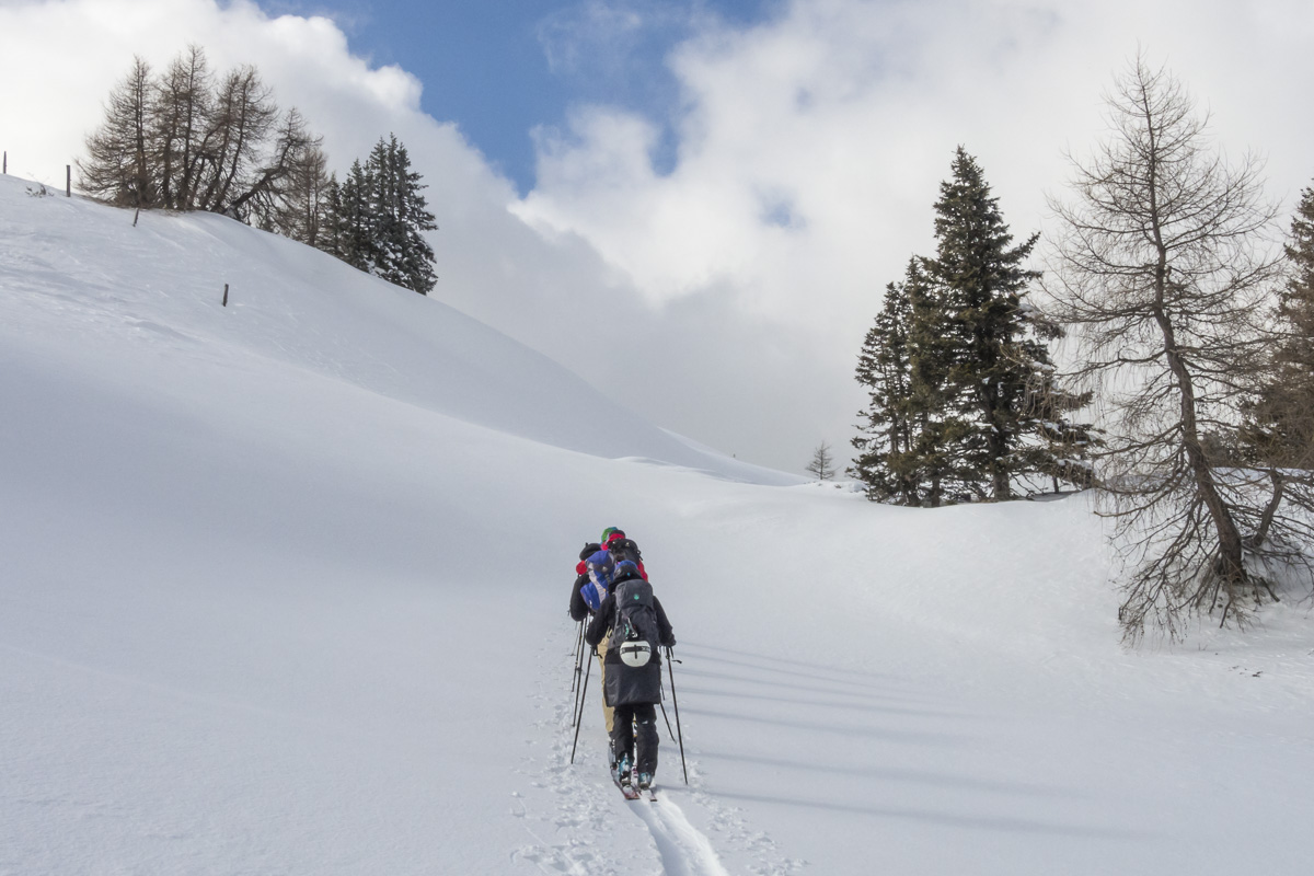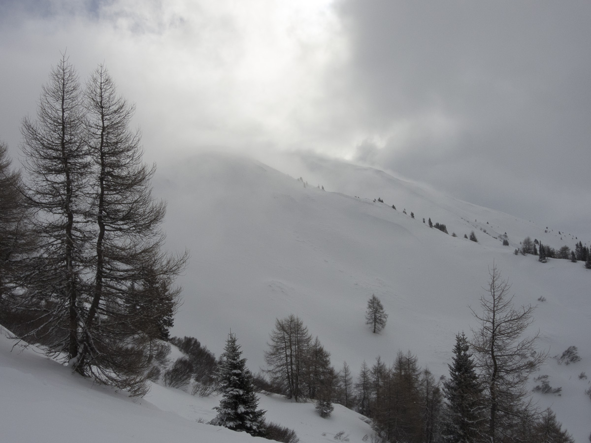 Die Autos fahren zum Parkplatz beim Gasthof Waldesruh. Auf der recht langen Forststraße zur Kastenalm. Im Tal sind jetzt Wolken und hoch über uns, und auch die umliegenden Berge wie der Tribulaun wollen sich nicht zeigen. Gleich hinter der Alm links hoch und durch weites Gelände zum Südost-Ausläufer der Rötenspitze. Der weitere Anstieg ist schneearm, also wird darauf verzichtet.