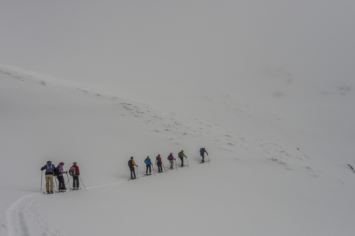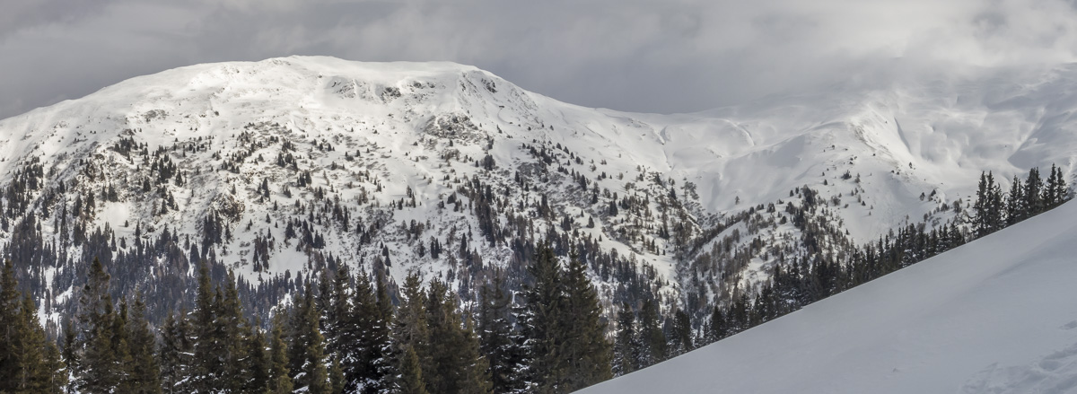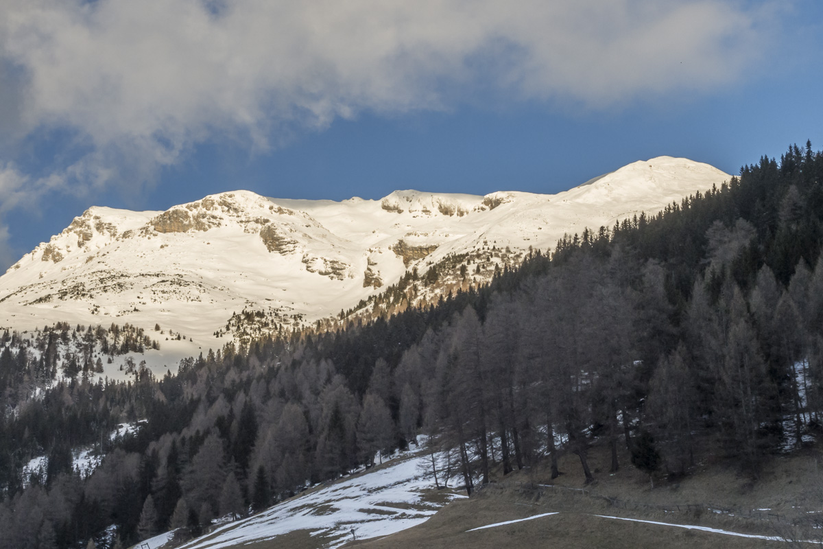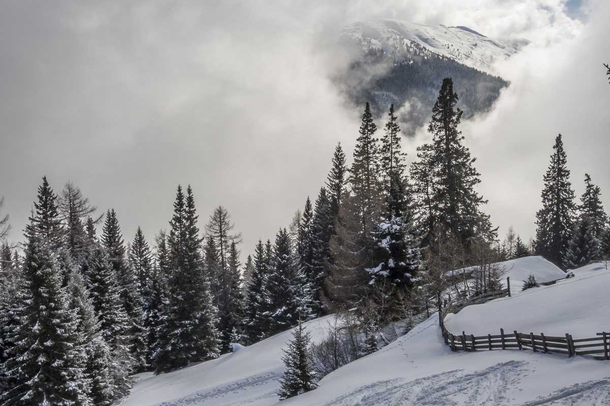 Die Autos fahren zum Parkplatz beim Gasthof Waldesruh. Auf der recht langen Forststraße zur Kastenalm. Im Tal sind jetzt Wolken und hoch über uns, und auch die umliegenden Berge wie der Tribulaun wollen sich nicht zeigen. Gleich hinter der Alm links hoch und durch weites Gelände zum Südost-Ausläufer der Rötenspitze. Der weitere Anstieg ist schneearm, also wird darauf verzichtet.
