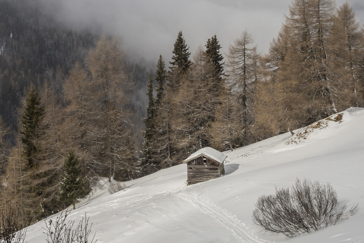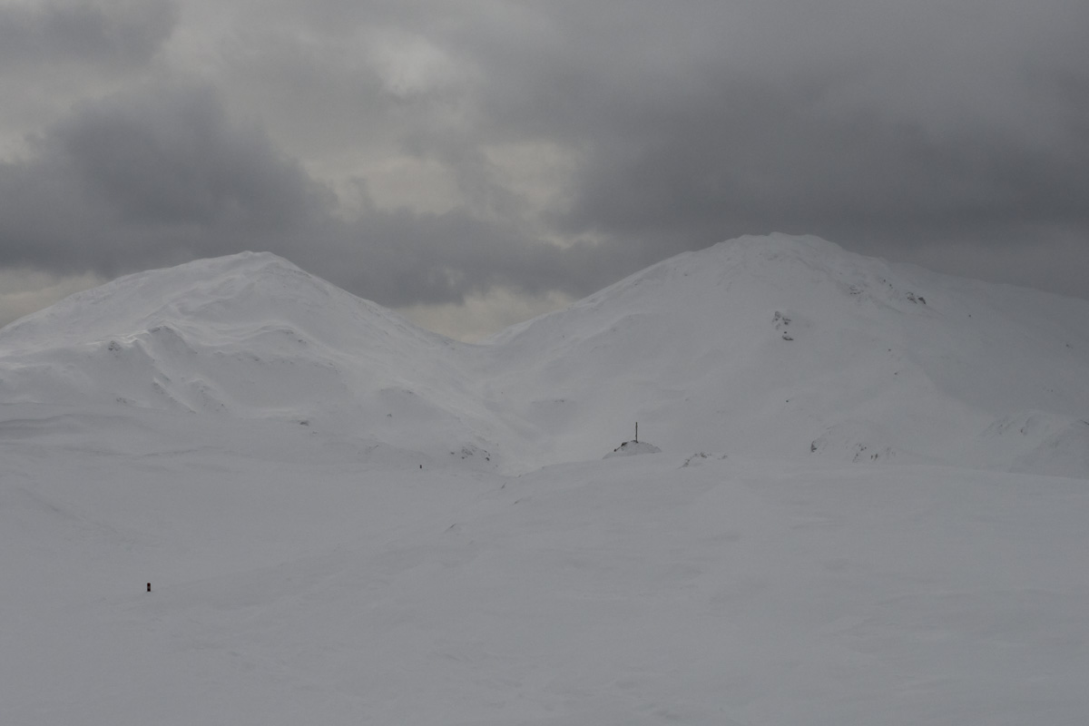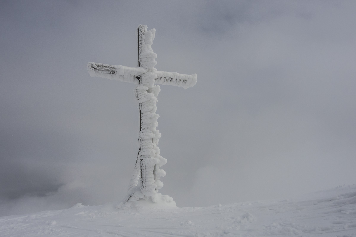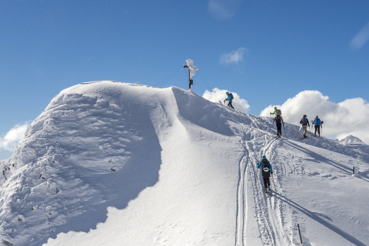 Wieder hängen die Wolken tief. Vom Hotel aus tragen wir ein paar Minuten lang die Ski bis zum Eingang des Fraderbachtals. Ein fest installierter LVS Check Point prüft hier. Auf der Straße neben dem Bach schieben wir dann die Ski hinauf zu den Alm-Wiesen. Nach links hoch durch einen engen Waldgürtel. In weitem Gelände steigen wir anschließend auf zum Kunstwerk, dem Gipfelschneekreuz. Keine Fernsicht wegen der Wolken, aber immerhin gute Nahsicht. Ein Sonnenstrahl beleuchtet makellos weiße Hänge, fast wie in Island, was aber nichts über die Schneehöhe aussagt.