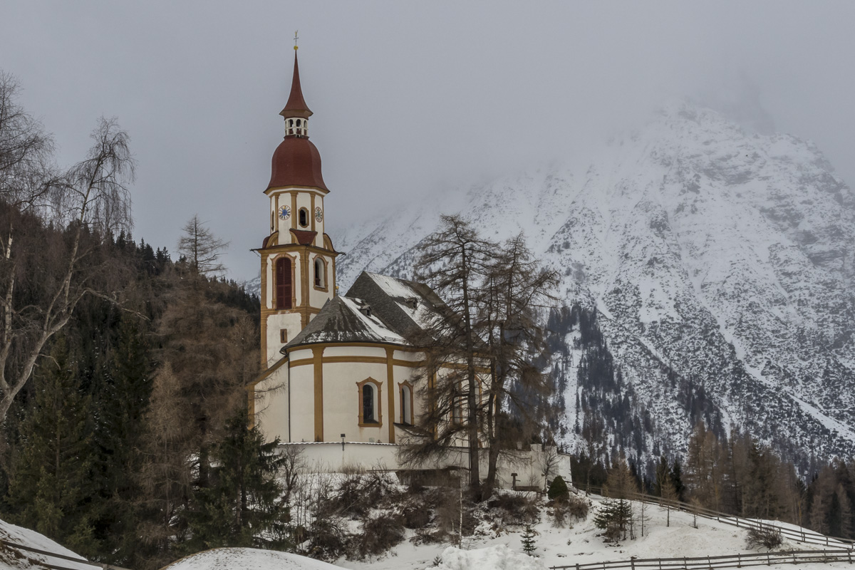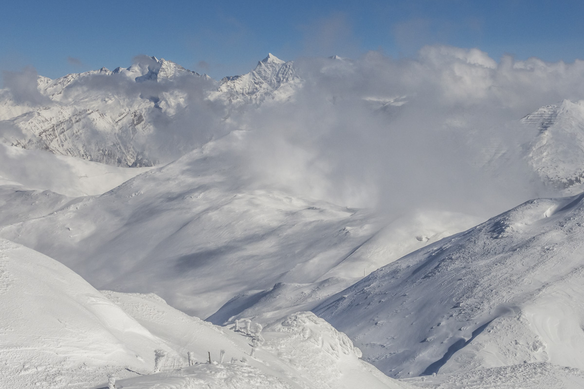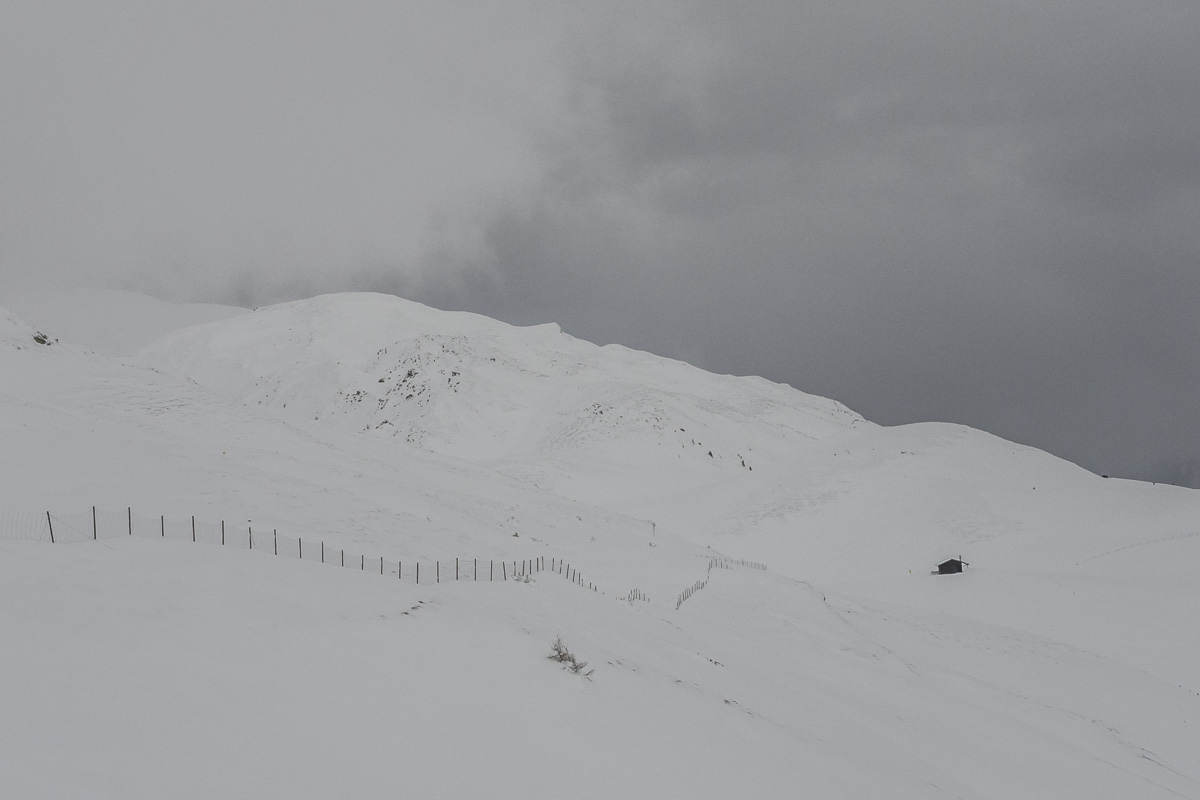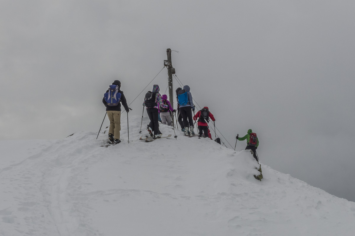 Wieder hängen die Wolken tief. Vom Hotel aus tragen wir ein paar Minuten lang die Ski bis zum Eingang des Fraderbachtals. Ein fest installierter LVS Check Point prüft hier. Auf der Straße neben dem Bach schieben wir dann die Ski hinauf zu den Alm-Wiesen. Nach links hoch durch einen engen Waldgürtel. In weitem Gelände steigen wir anschließend auf zum Kunstwerk, dem Gipfelschneekreuz. Keine Fernsicht wegen der Wolken, aber immerhin gute Nahsicht. Ein Sonnenstrahl beleuchtet makellos weiße Hänge, fast wie in Island, was aber nichts über die Schneehöhe aussagt.