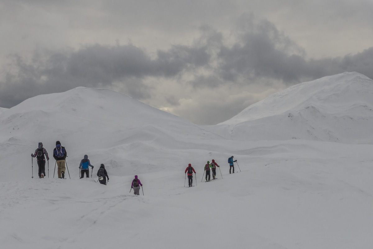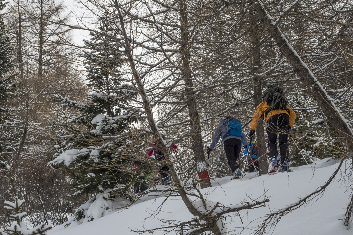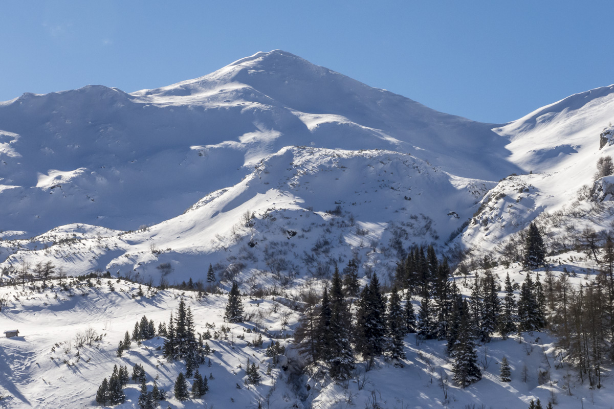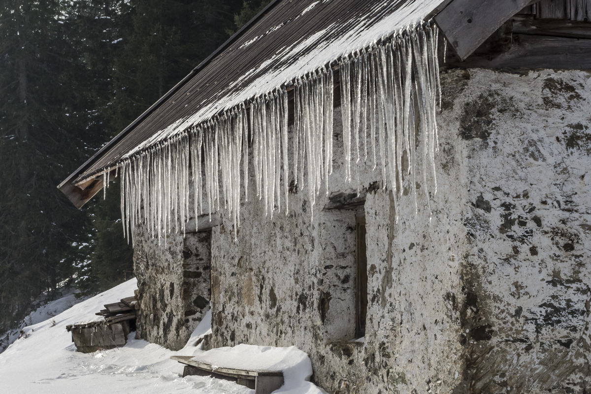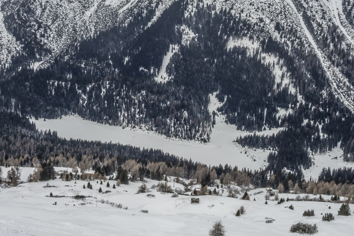 Wieder tragen wir die Ski zum Beginn des Fradertals. Auf der Forststraße bis zur bereits bekannten Haideggeralm mit der Eiszapfen-Formation. Dann geht’s direkt im Wald hoch. Neue Erfahrungen: Unter dem Schnee liegende Wurzeln machen den Aufstieg zur Rutschpartie, und Baumstämme blockieren die Spitzkehre. Viel gelernt. Auf dem höchsten Punkt, umgeben von allerlei Gruben, fahren wir noch kurz hinab zum Kreuz, es soll ja auch von unten sichtbar sein. Die Abfahrt zum Obernberger See führt über Alpenrosen und durch tiefen Pulver und endet in der Waldesruh, wo wir auf den Bus warten.