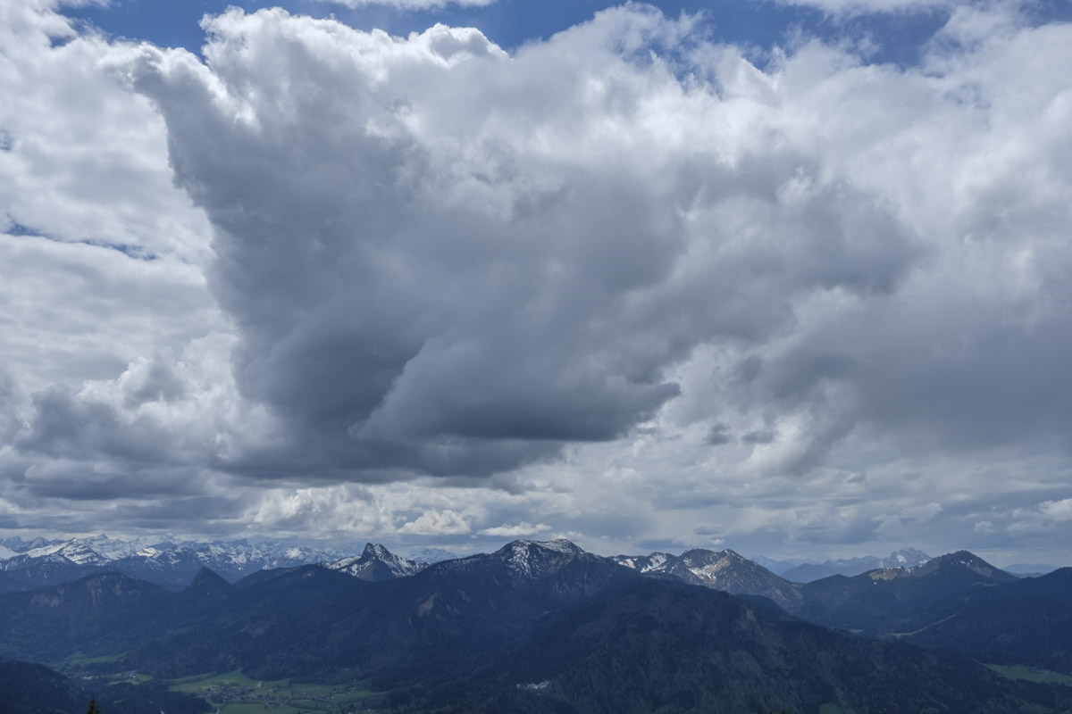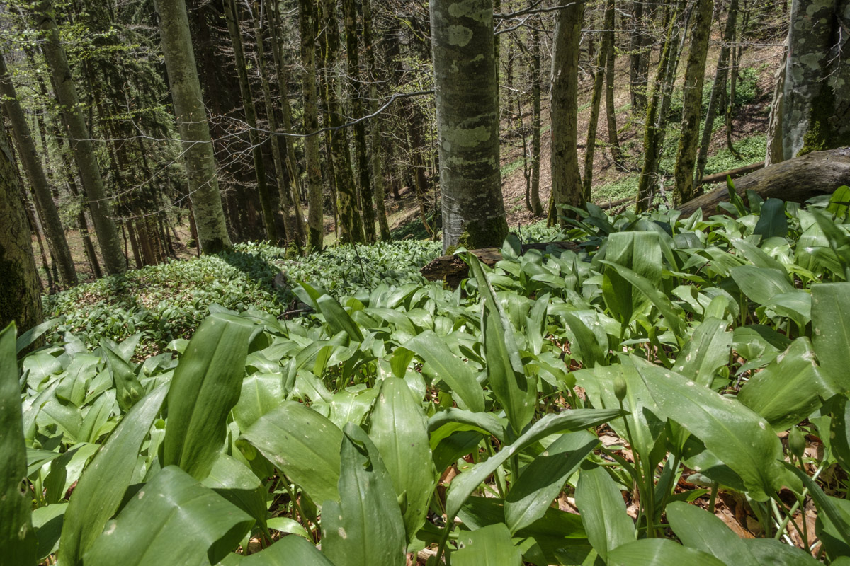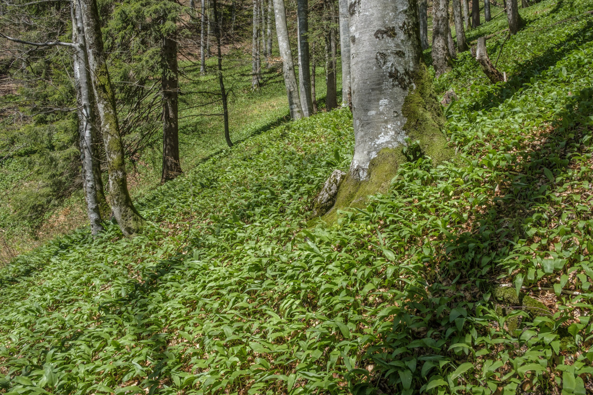 Die Bärlauch-Route. Wanderparkplatz am Ende der Riedersteinstraße im Ortsteil Schwaighof/Tegernsee. Auf der Forststraße steil bergan bis zum Schild Sackgasse. Das stimmt aber nicht, der Weg quert weite Bärlauch-Felder, nicht nur optisch, auch olfaktorisch beeindruckend. Dann geht es nach links im Zickzack hinauf bis unterhalb der Gipfelwiese der Baumgartenschneid. Am Gipfel erfreuen wir uns an den Wolkenformationen.
