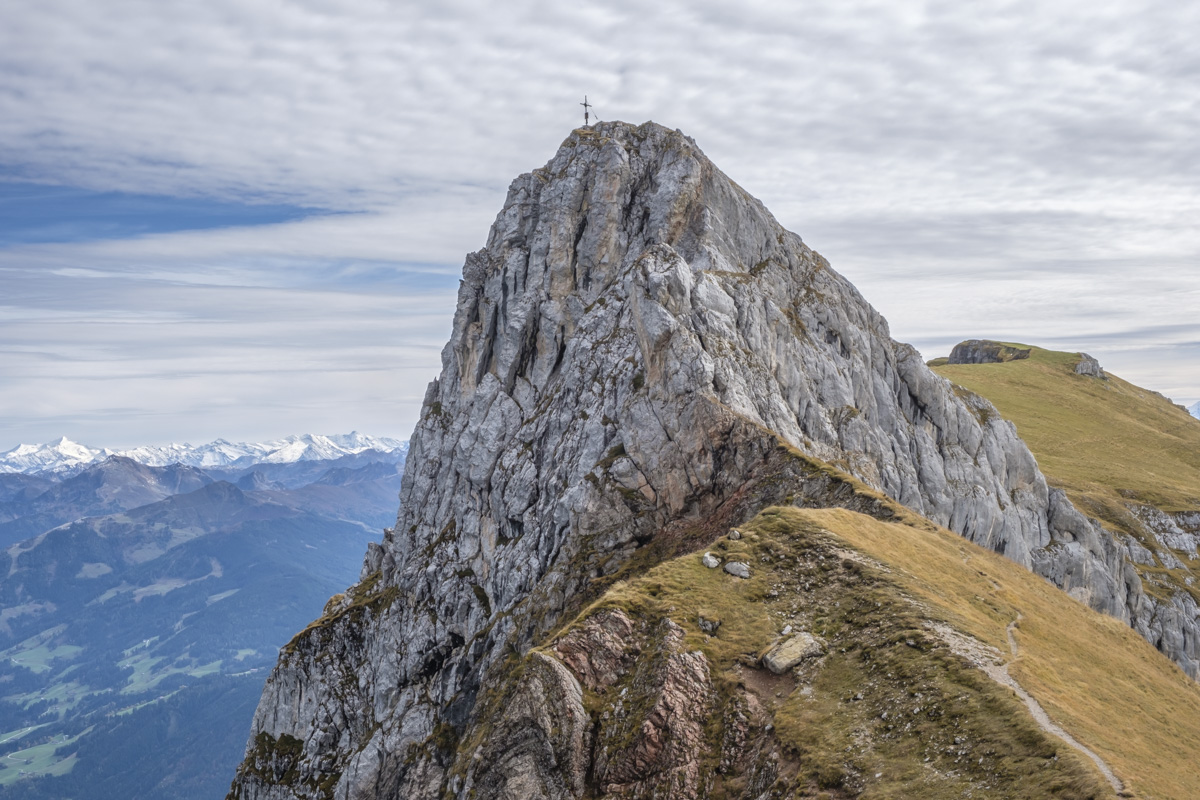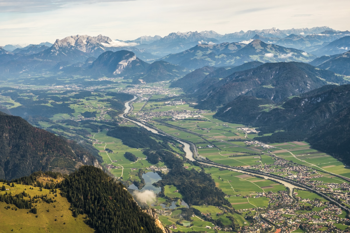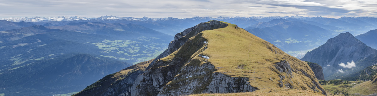 Die ersten 850 Höhenmeter übernimmt die Rofanseilbahn. Von der Bergstation laufen wir zunächst in den Krahnsattel. Und dann wird abgestiegen zur Schermsteinalm, die sich malerisch hinduckt unter überhängende Felsbäuche. Der Aufstieg zum Vorderen Sonnwendjoch über die steilen Grashänge ist Aussicht pur, ein unmittelbarer Tiefblick ins Inntal und weiter ins Zillertal ist geboten. Auch die Rundumsicht vom Sonnwendjoch gibt keinen Anlass zum Meckern. Hinüber und hinauf auf den Sagzahn und über den kurzen Klettersteig hinunter und hinaus zur Bergstation.