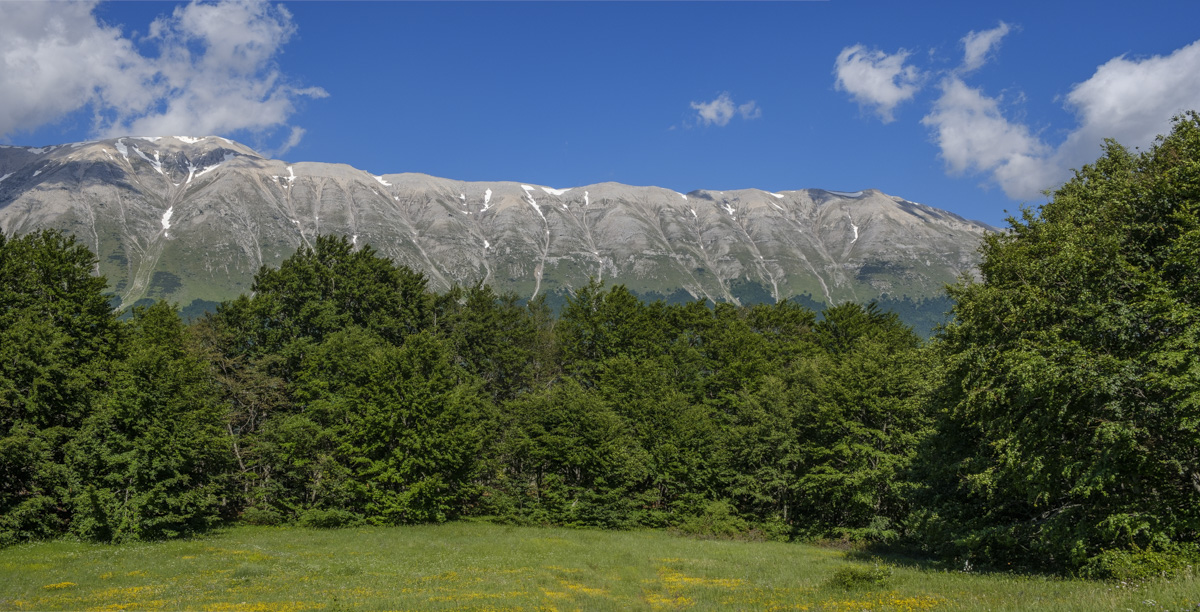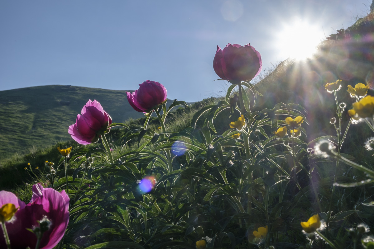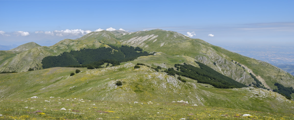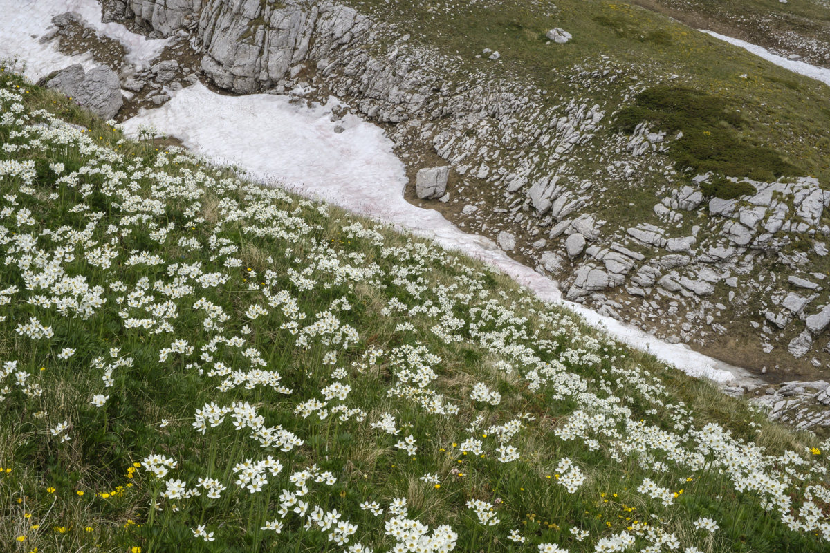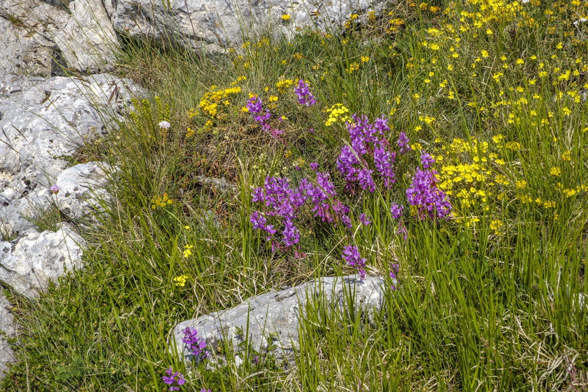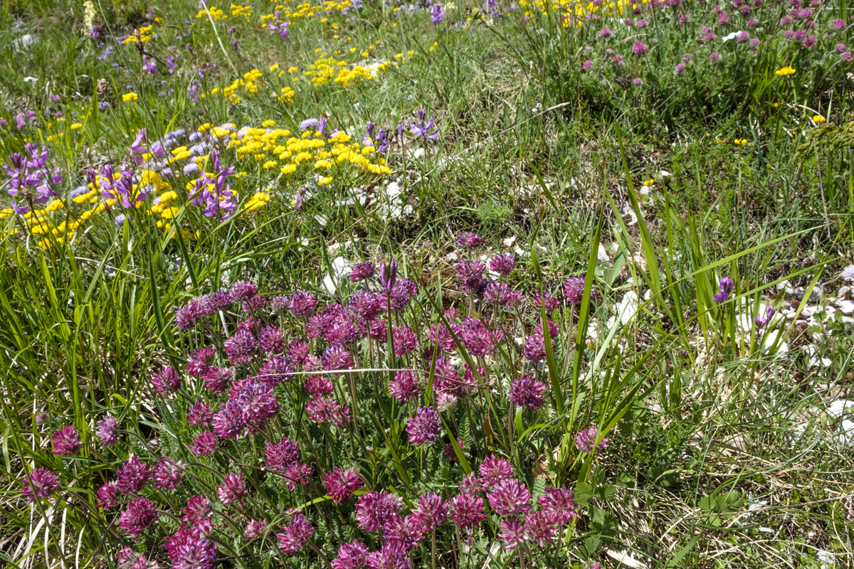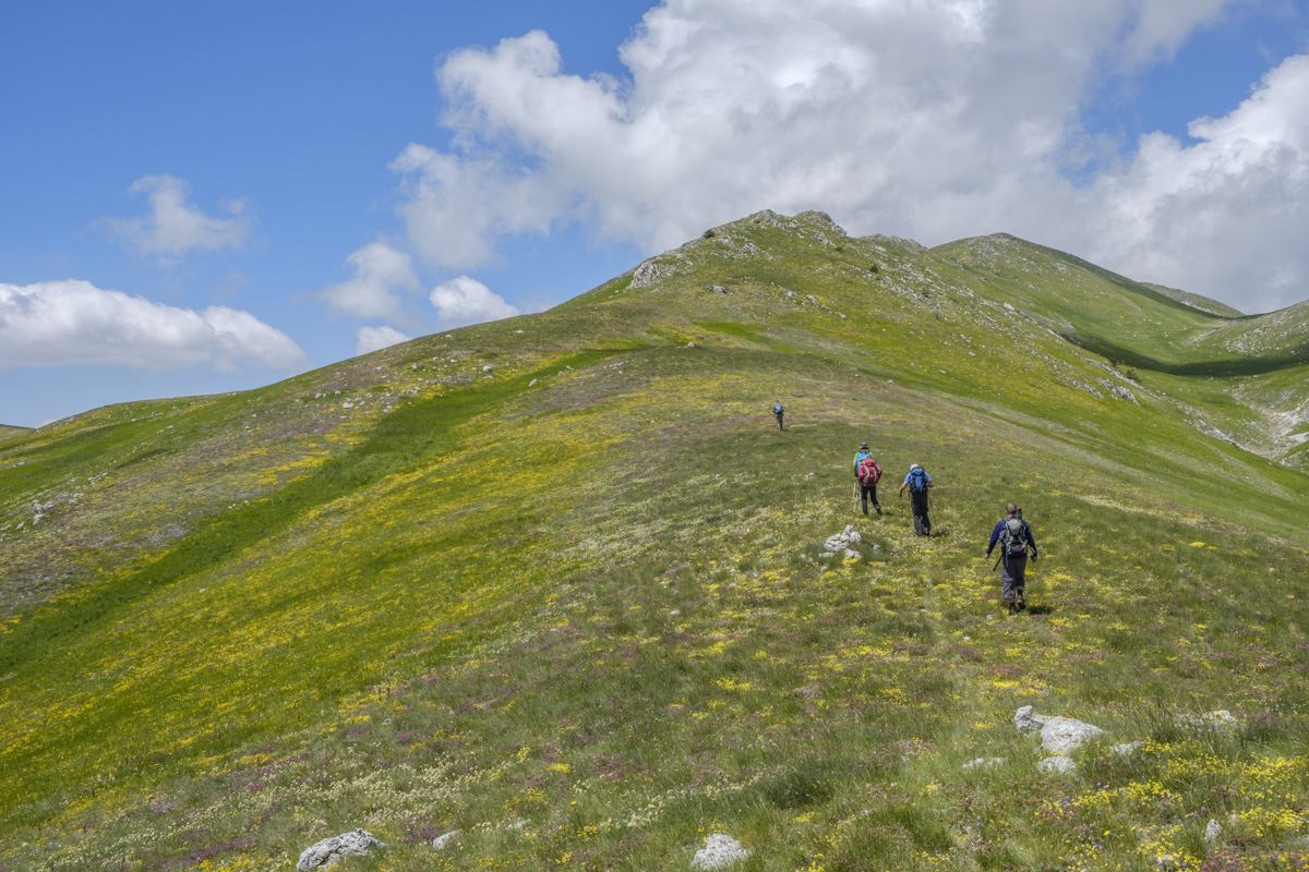 Vom Passo San Leonardo steigen wir erst durch Wald hoch, und dann empfangen uns Blumenwiesen mit einem Reichtum an Blüten, selten so gesehen. Immer wieder neue Farben und Formen, Natur in bester Laune. Nach der Überschreitung des Monte gehen wir hinunter zur Casa Capoposto. Hier sitzen Damen im Grünen und pflücken mit zarter Hand Wildspinat. Wir gehen weiter über einen Rücken und Kamm zu einem Gipfelchen. Wohin zuerst schauen – auf die Blümchen am Boden oder den Monte Amaro oder das Meer in der Ferne.