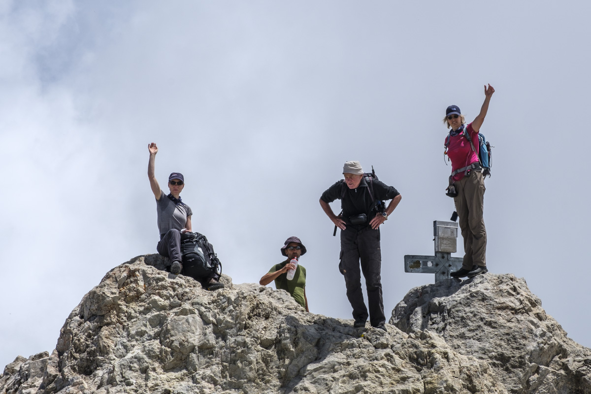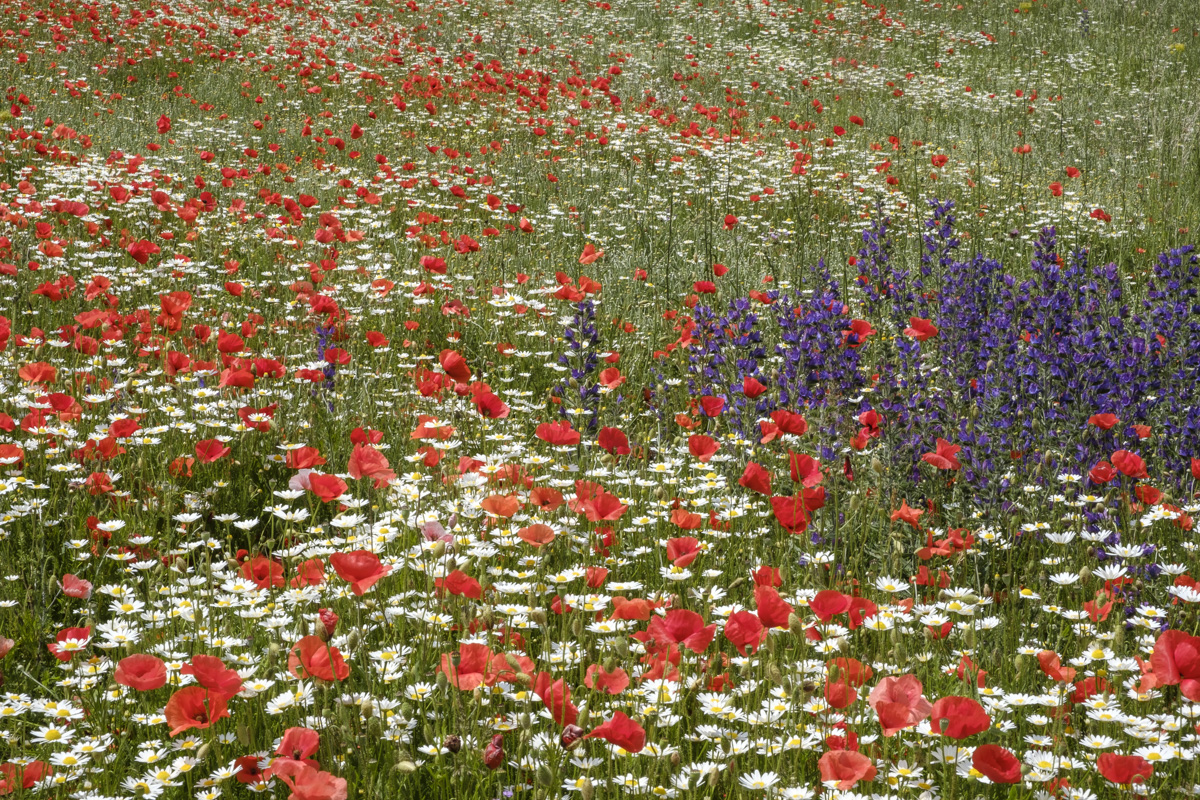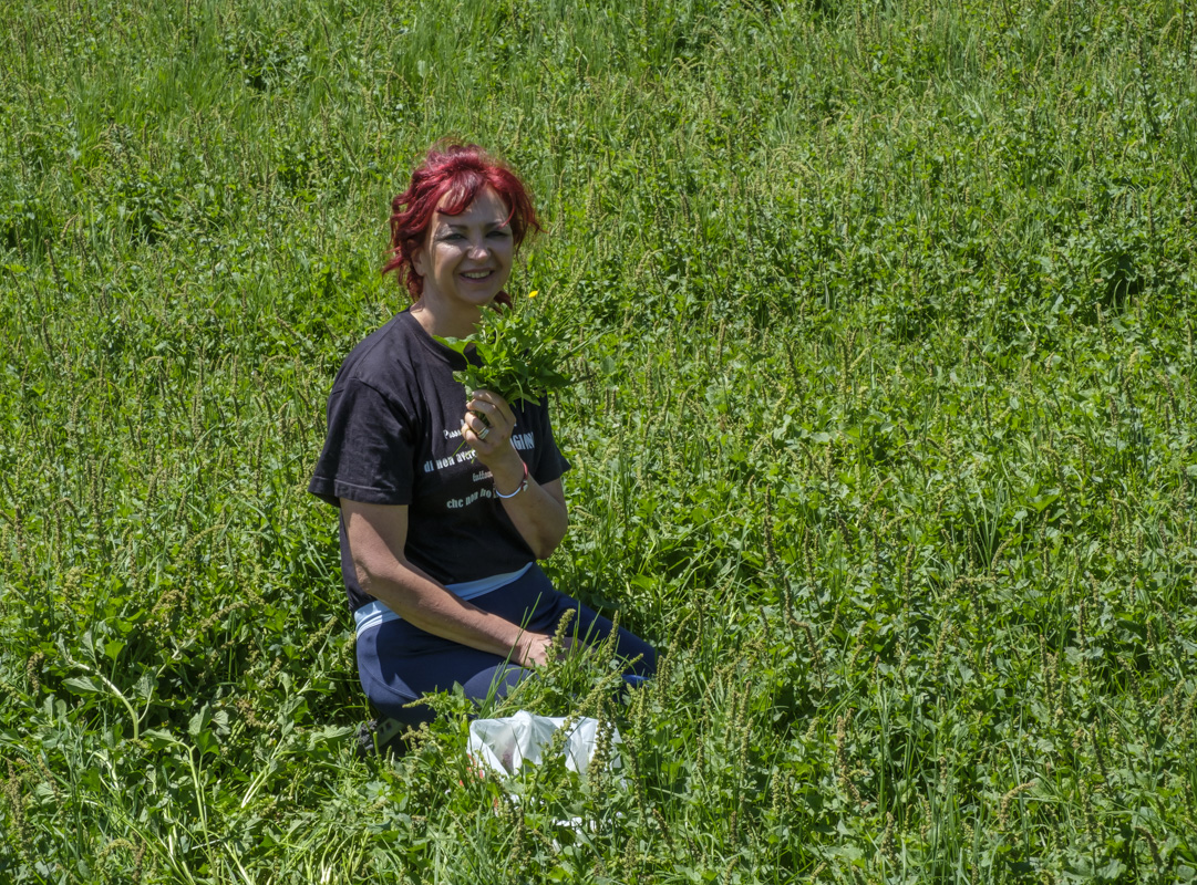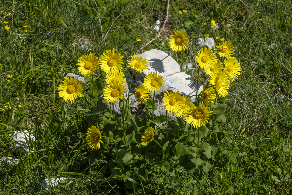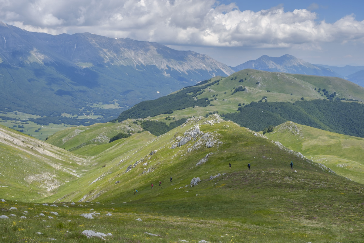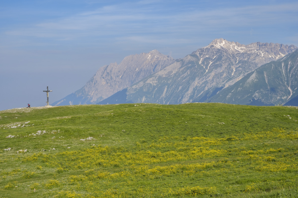 Vom Passo San Leonardo steigen wir erst durch Wald hoch, und dann empfangen uns Blumenwiesen mit einem Reichtum an Blüten, selten so gesehen. Immer wieder neue Farben und Formen, Natur in bester Laune. Nach der Überschreitung des Monte gehen wir hinunter zur Casa Capoposto. Hier sitzen Damen im Grünen und pflücken mit zarter Hand Wildspinat. Wir gehen weiter über einen Rücken und Kamm zu einem Gipfelchen. Wohin zuerst schauen – auf die Blümchen am Boden oder den Monte Amaro oder das Meer in der Ferne.