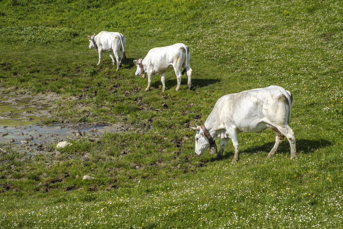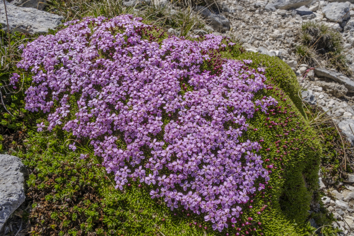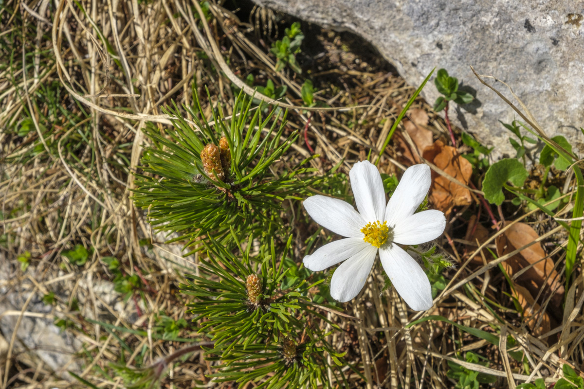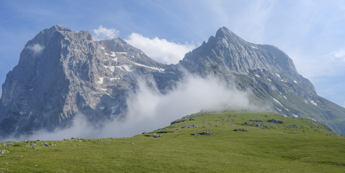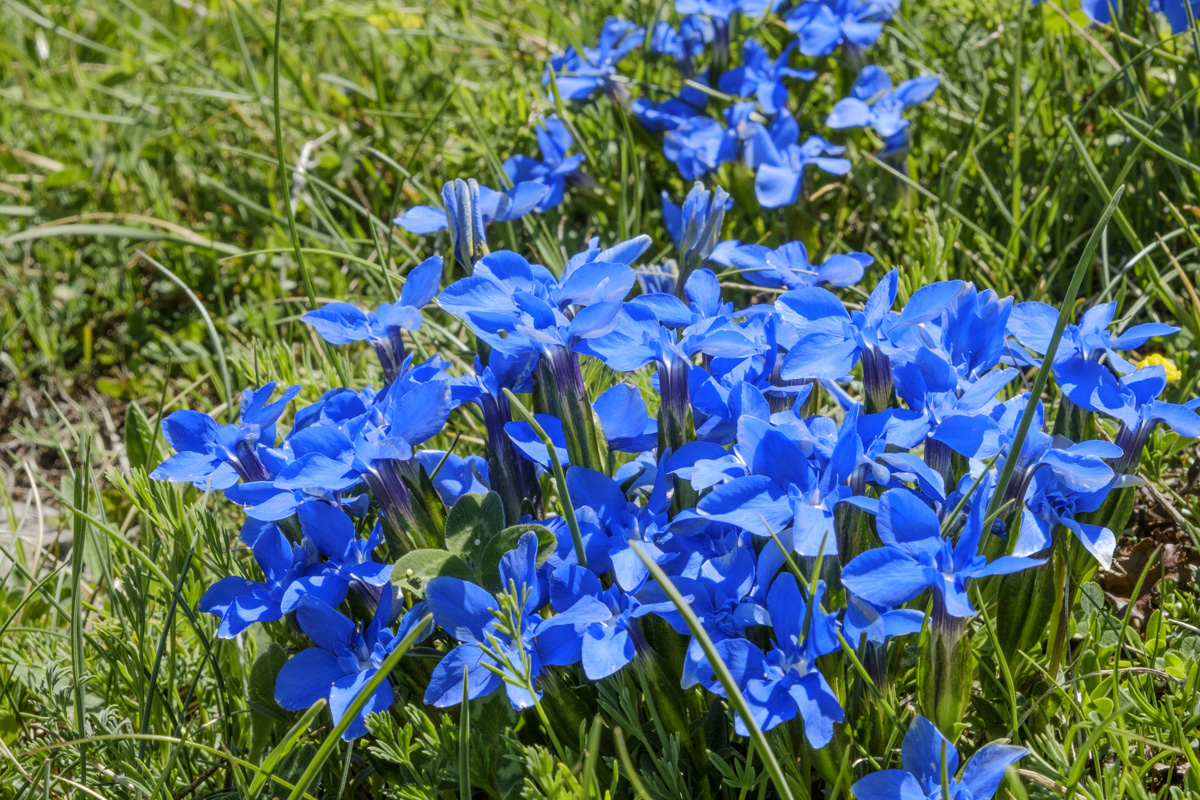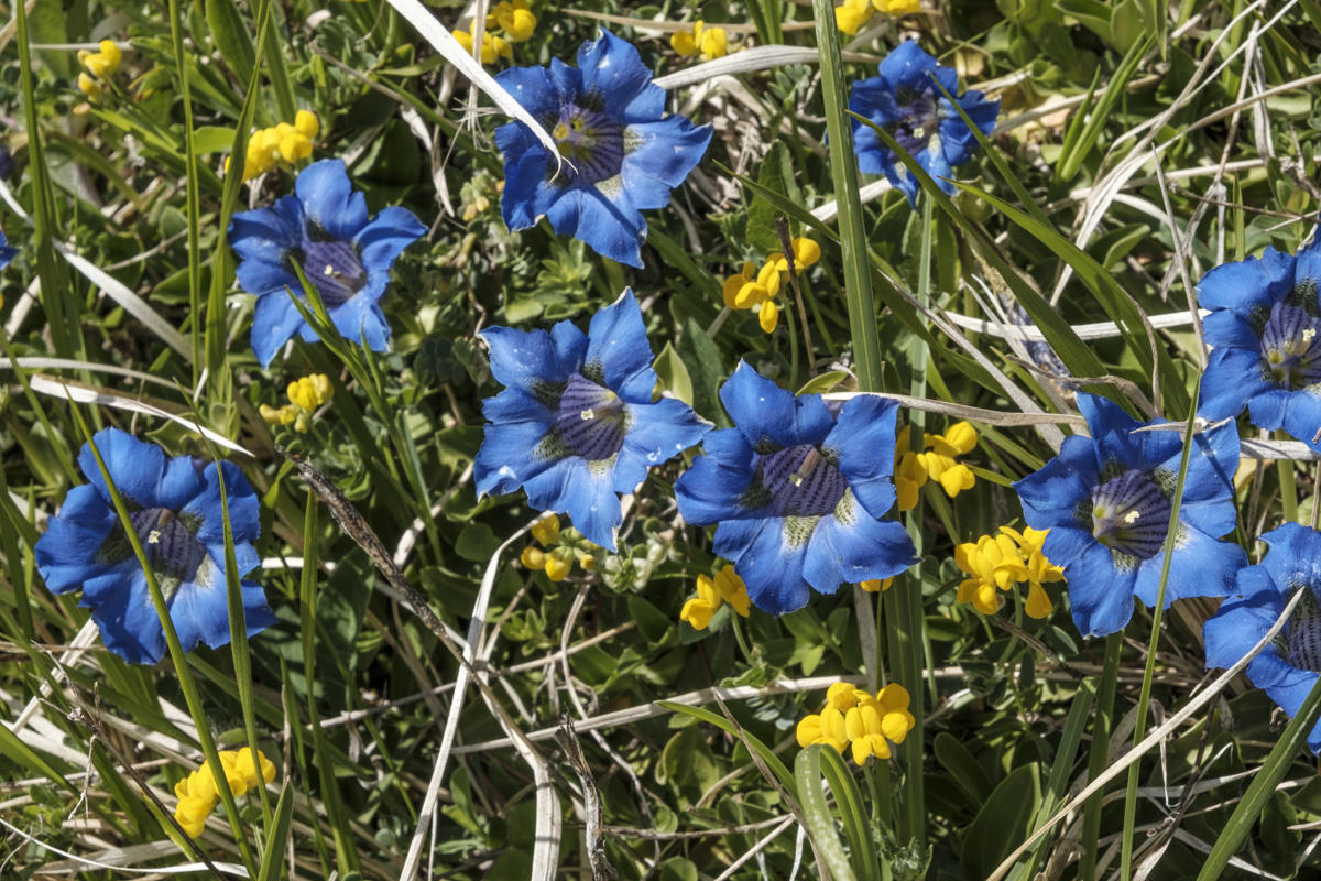 Vom Passo San Leonardo steigen wir erst durch Wald hoch, und dann empfangen uns Blumenwiesen mit einem Reichtum an Blüten, selten so gesehen. Immer wieder neue Farben und Formen, Natur in bester Laune. Nach der Überschreitung des Monte gehen wir hinunter zur Casa Capoposto. Hier sitzen Damen im Grünen und pflücken mit zarter Hand Wildspinat. Wir gehen weiter über einen Rücken und Kamm zu einem Gipfelchen. Wohin zuerst schauen – auf die Blümchen am Boden oder den Monte Amaro oder das Meer in der Ferne.