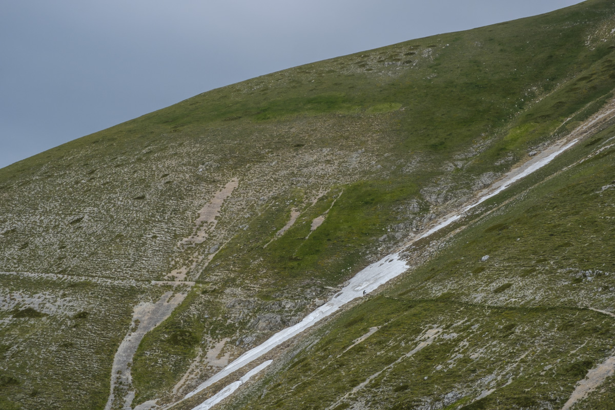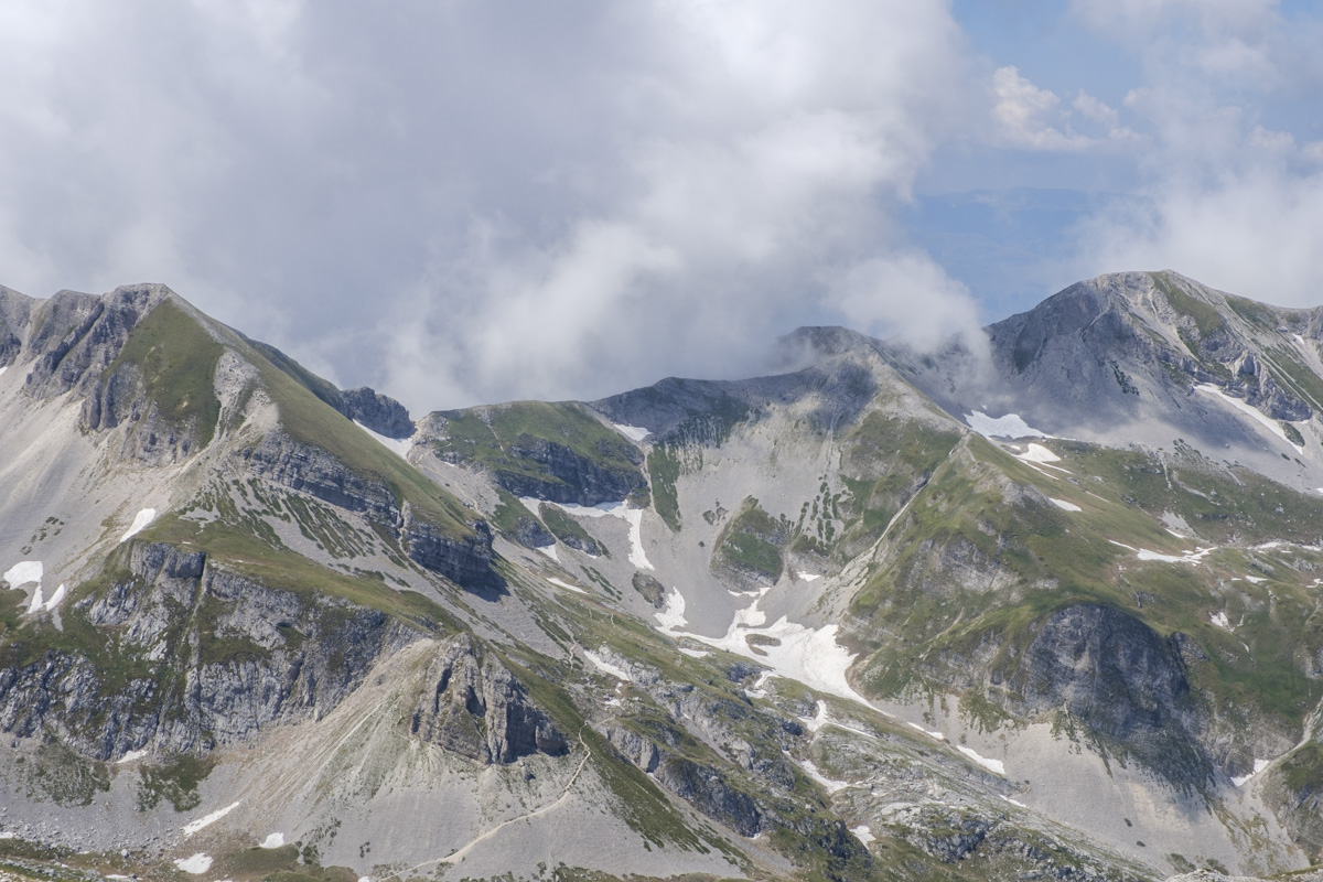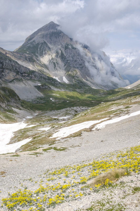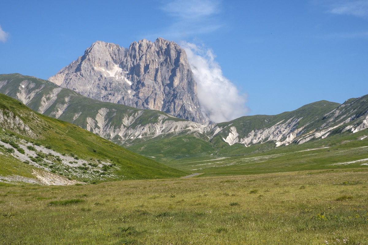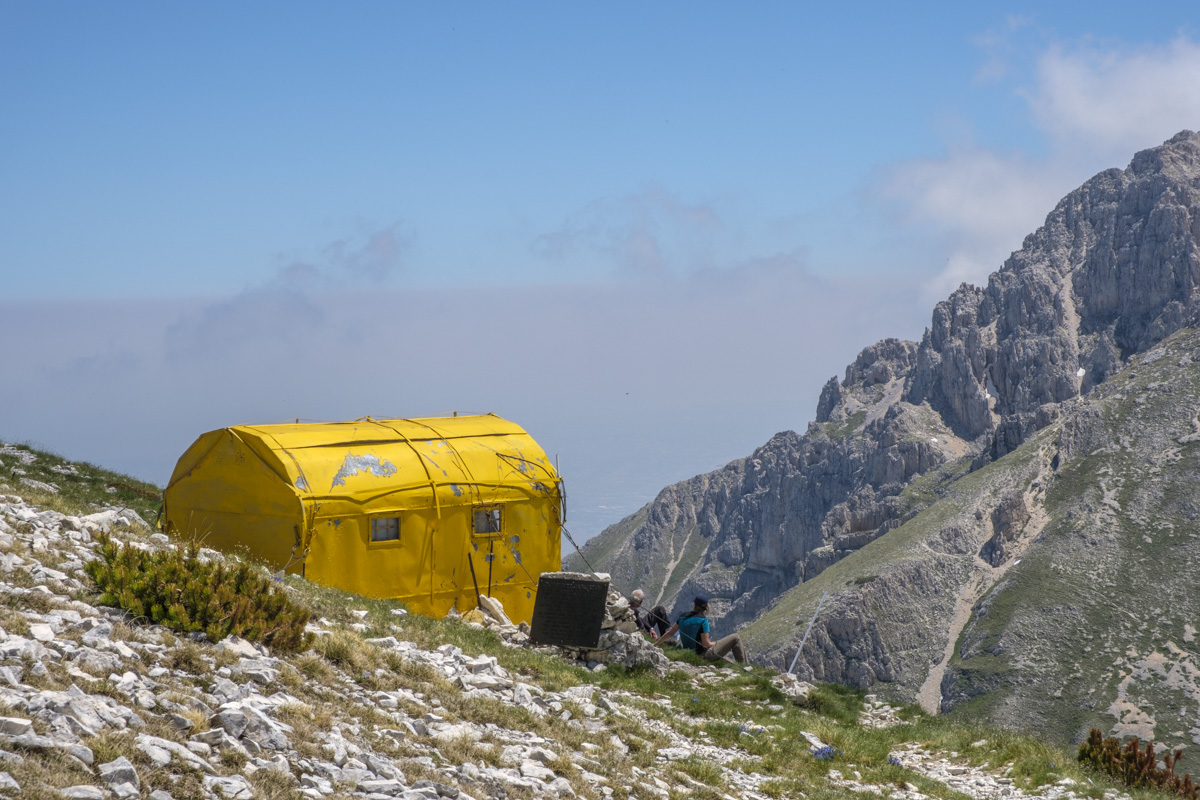 Der Bus fährt hoch hinauf zum Rifugio Bruno Pomilio. Viele Sendemasten stehen hier rum. Auf einem langen Rücken geht es dahin, und dann steilt sich der Weg auf bis hin zur Biwakschachtel. Eine weite Landschaft. Graue Felskuppen, die wie Dünen ausschauen, Schneefelder, grüne Wiesen mit vielen Blumen, Schluchten mit Buchenwäldern, die ins flache Land münden, und im fernen Dunst das Meer. Und alles ist weit, und auch weit zu laufen.
