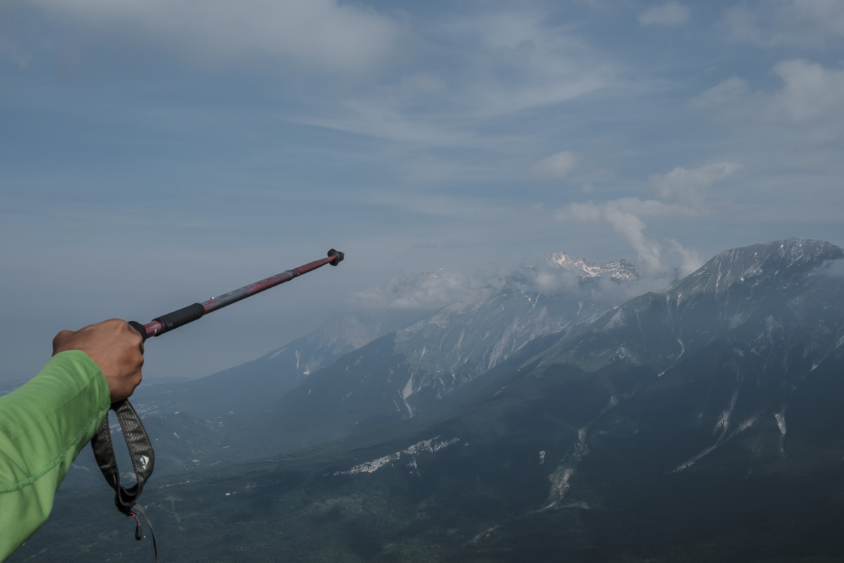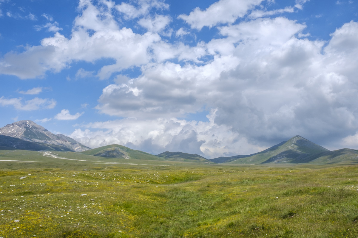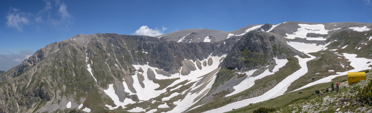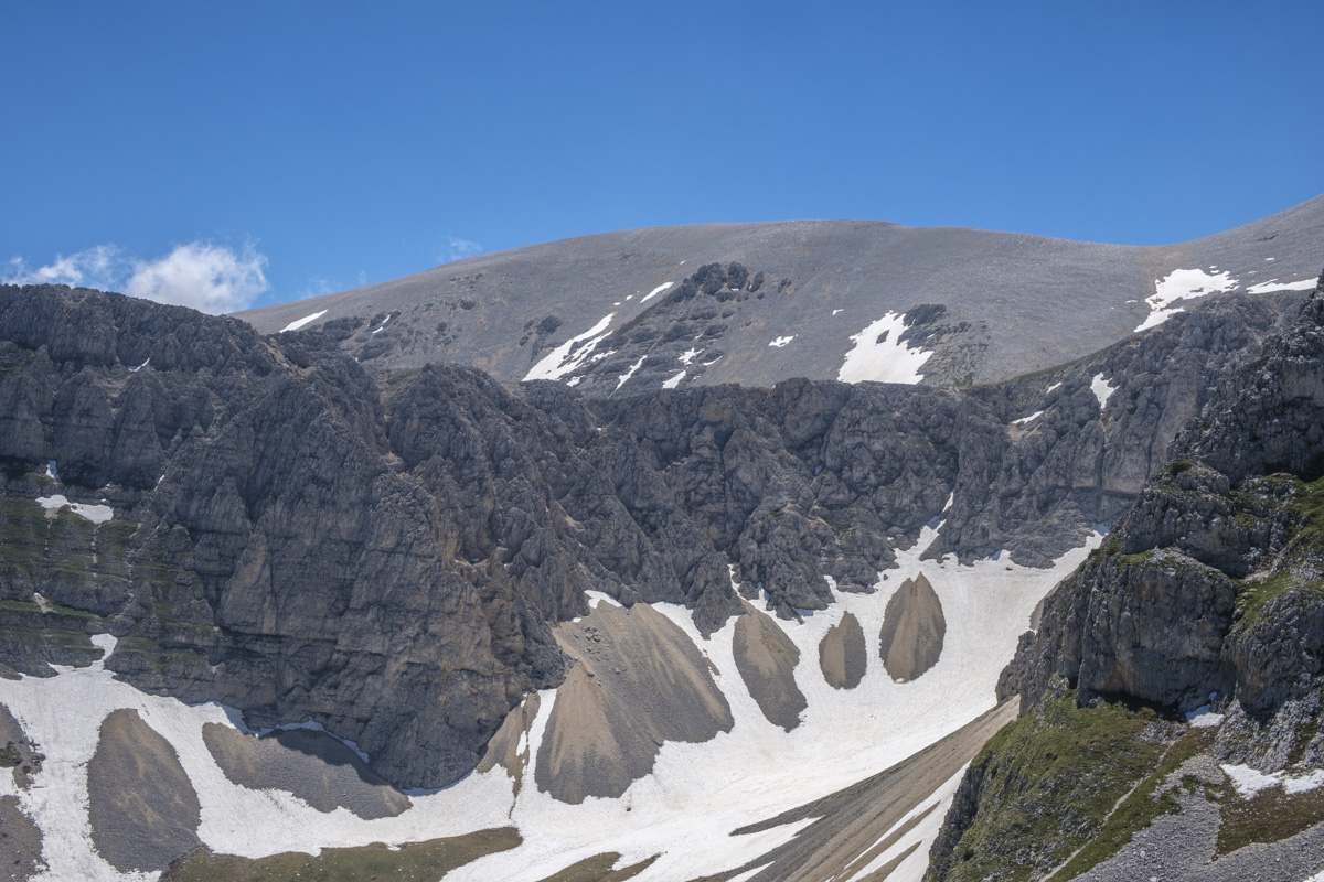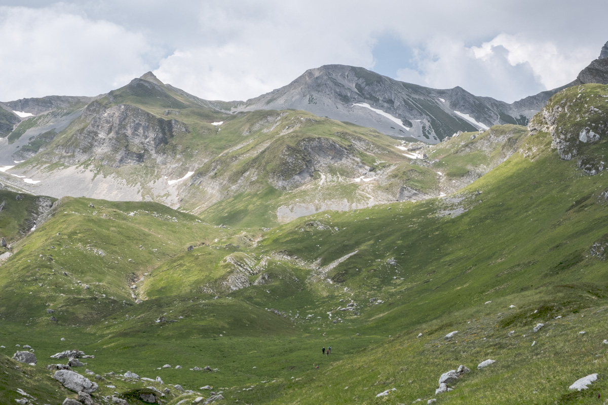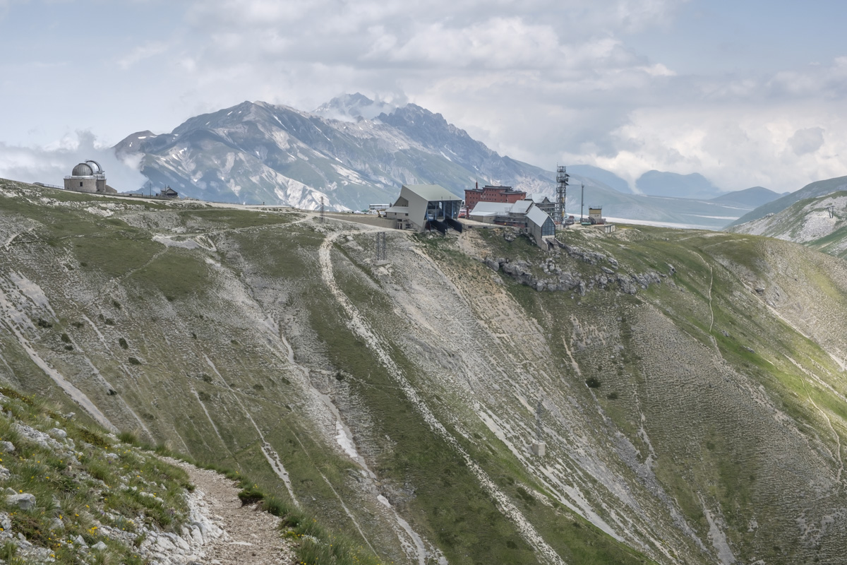 Der Bus fährt hoch hinauf zum Rifugio Bruno Pomilio. Viele Sendemasten stehen hier rum. Auf einem langen Rücken geht es dahin, und dann steilt sich der Weg auf bis hin zur Biwakschachtel. Eine weite Landschaft. Graue Felskuppen, die wie Dünen ausschauen, Schneefelder, grüne Wiesen mit vielen Blumen, Schluchten mit Buchenwäldern, die ins flache Land münden, und im fernen Dunst das Meer. Und alles ist weit, und auch weit zu laufen.